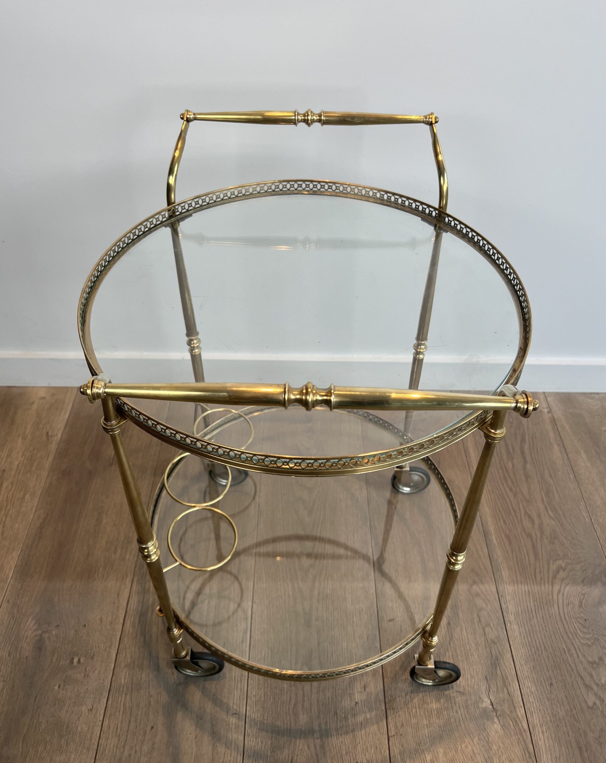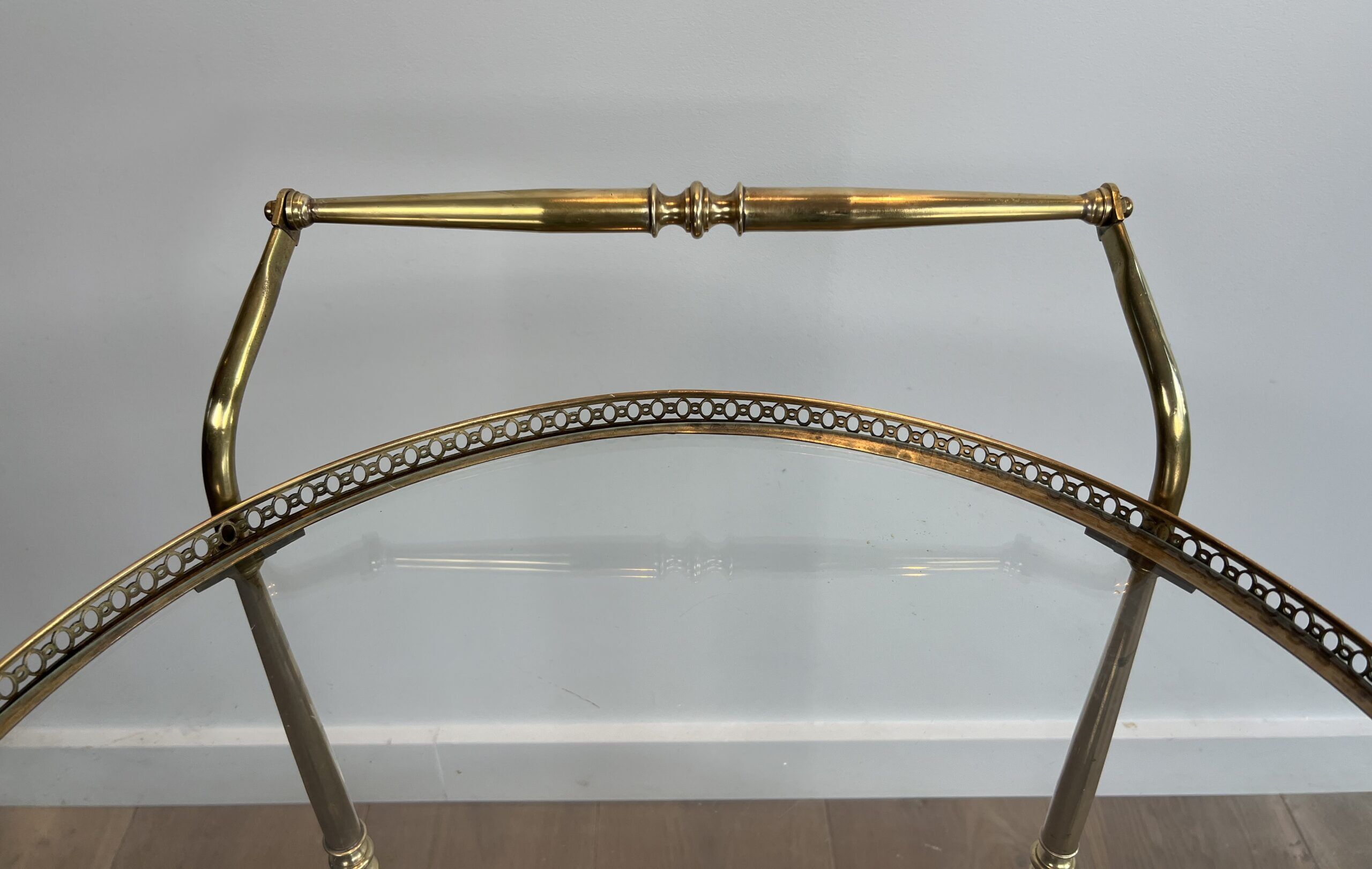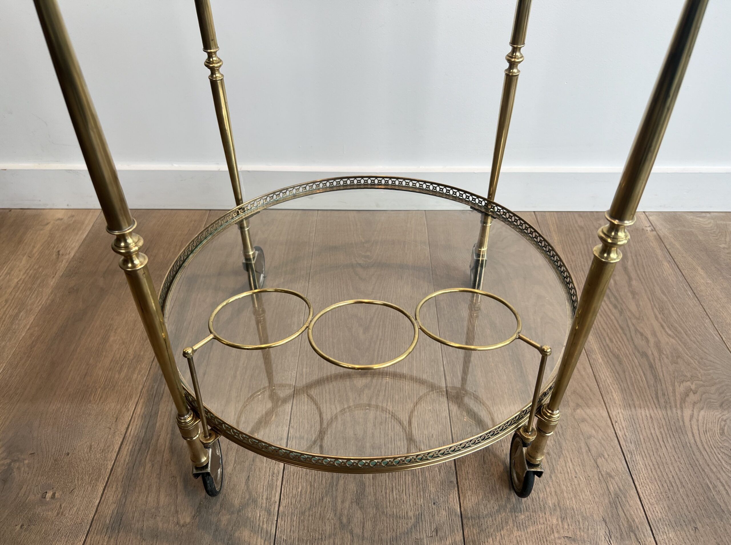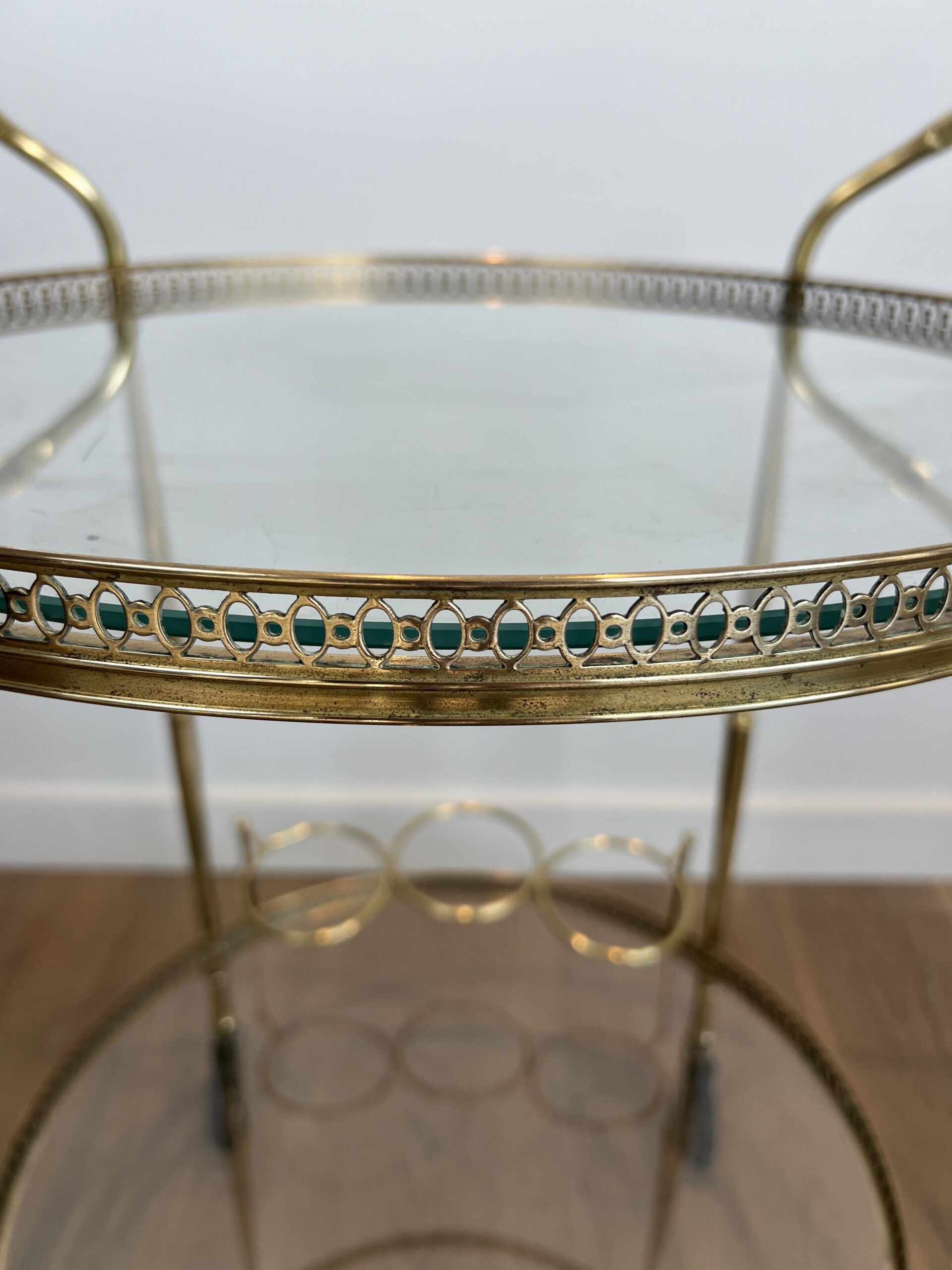 The cart features a circular brass frame with intricate detailing, reflecting the refined Neoclassical aesthetic. It includes two round glass tiers, perfect for serving or displaying drinks and accessories, while the brass gallery rails enhance both style and functionality. Smooth caster wheels make the cart effortlessly mobile, ideal for entertaining in any space.