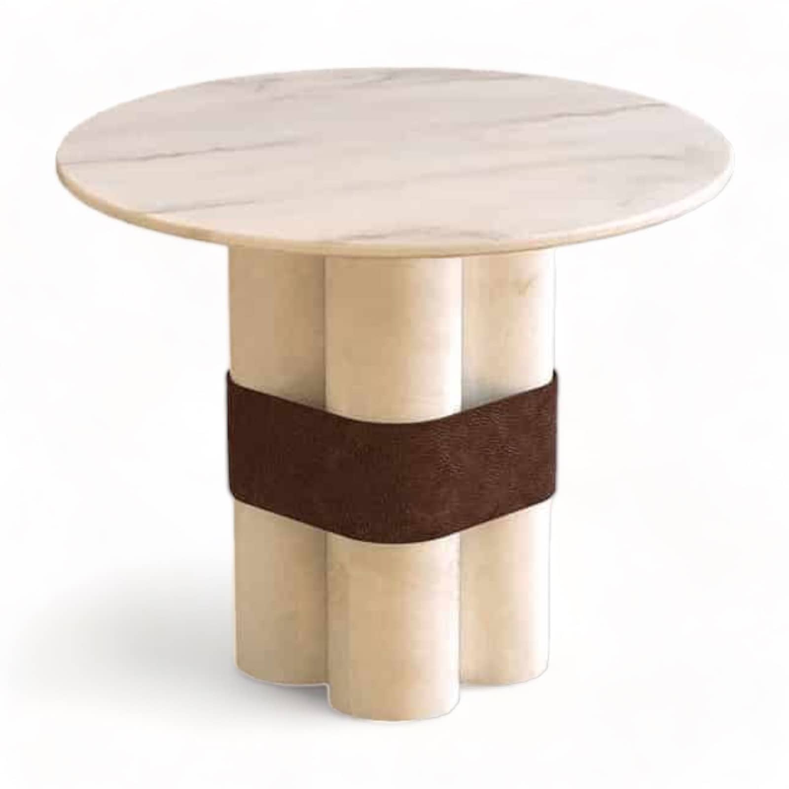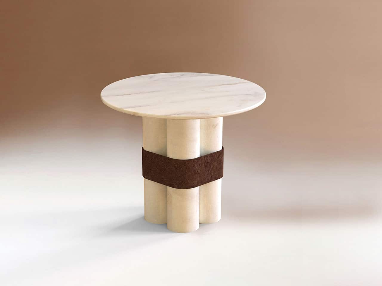 A single thin block resembling round columns form the base of the small marble table. Its round top create an almost architectural balance. The table also has a final and unexpected touch thanks to the handmade eco leather belt that embrace the structure.
