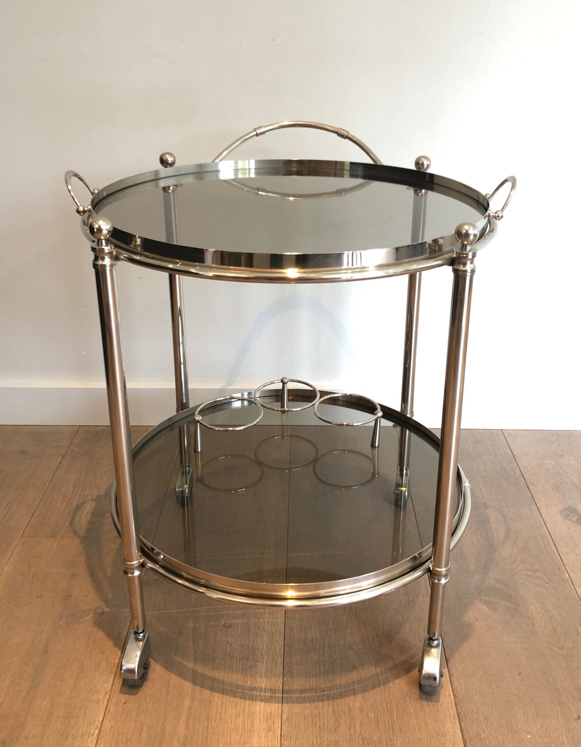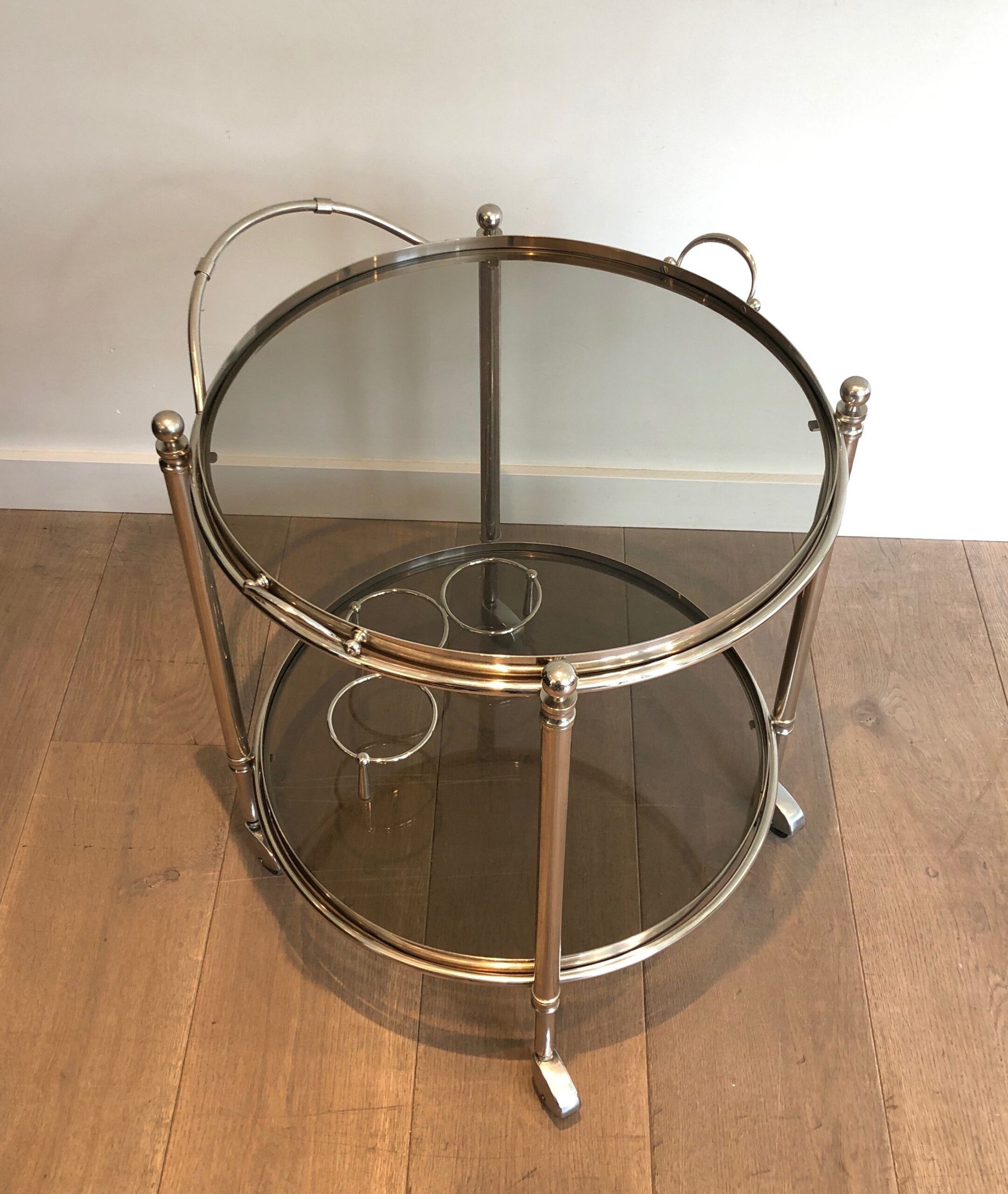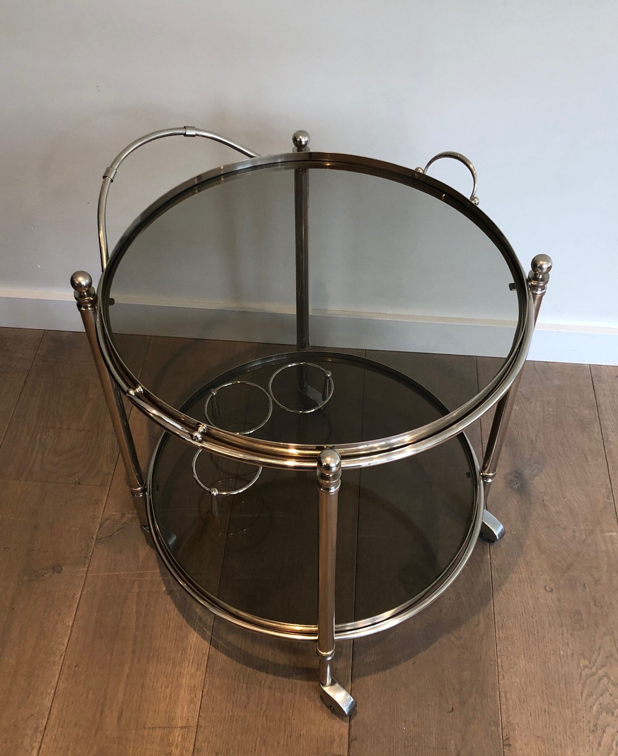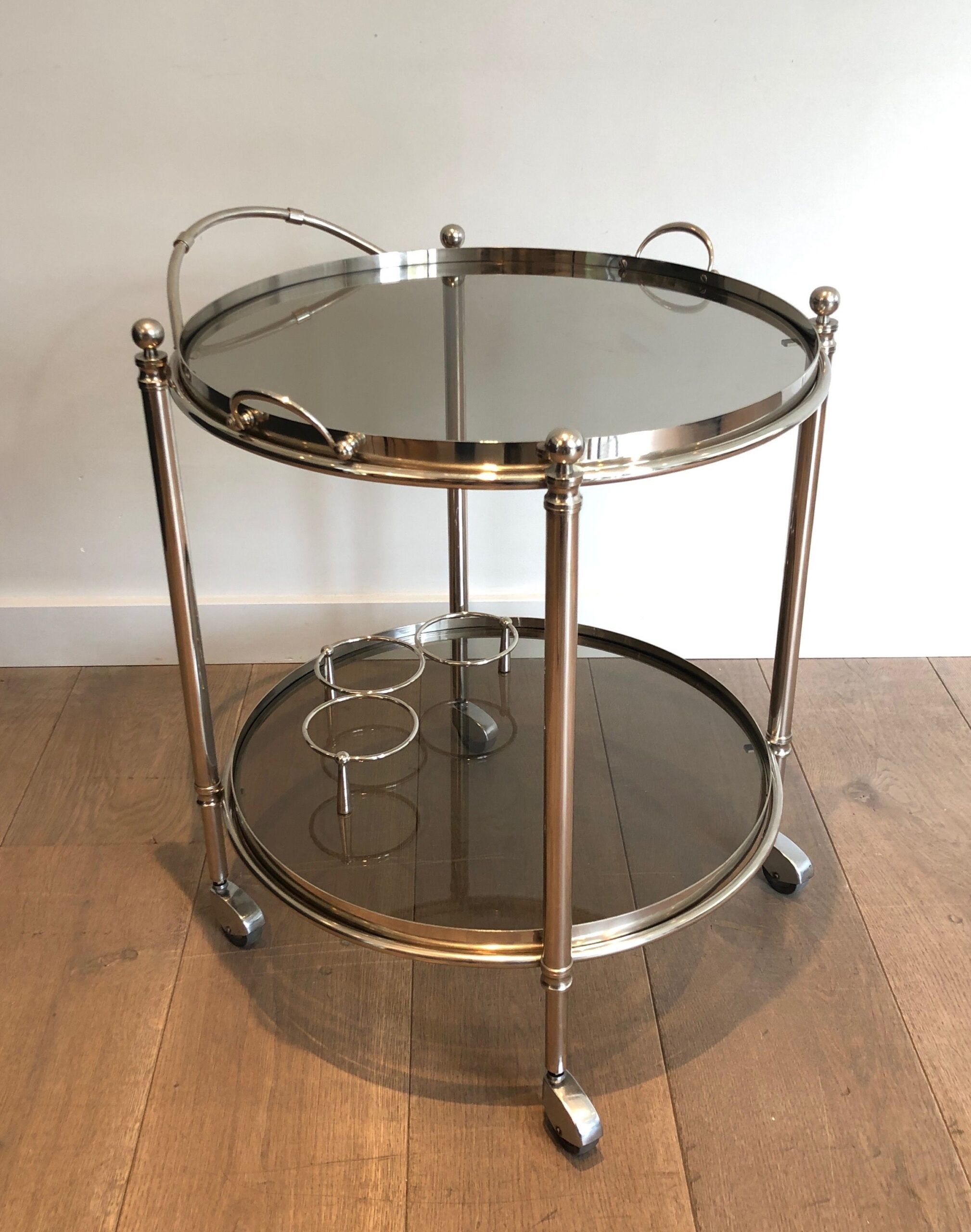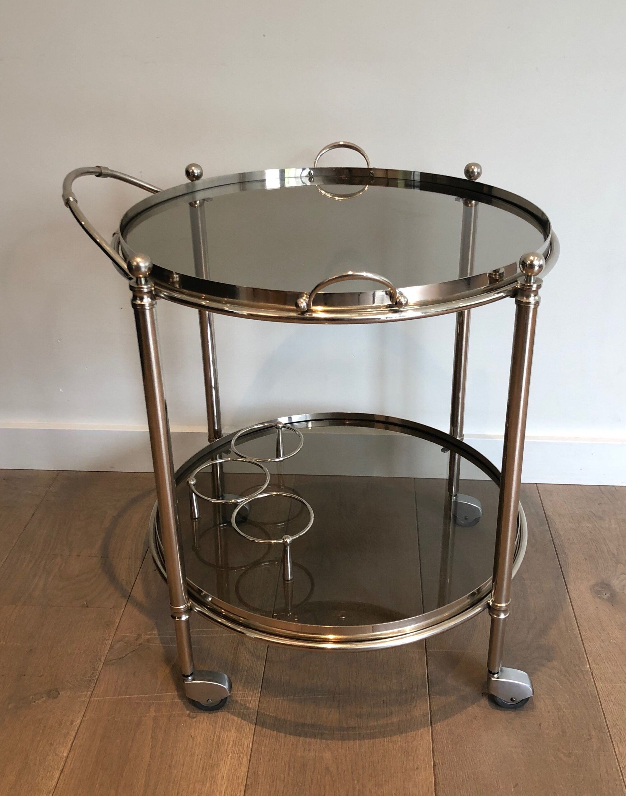 Round Silver Plated Metal Drinks Trolley with Smoked Glass Trays, French