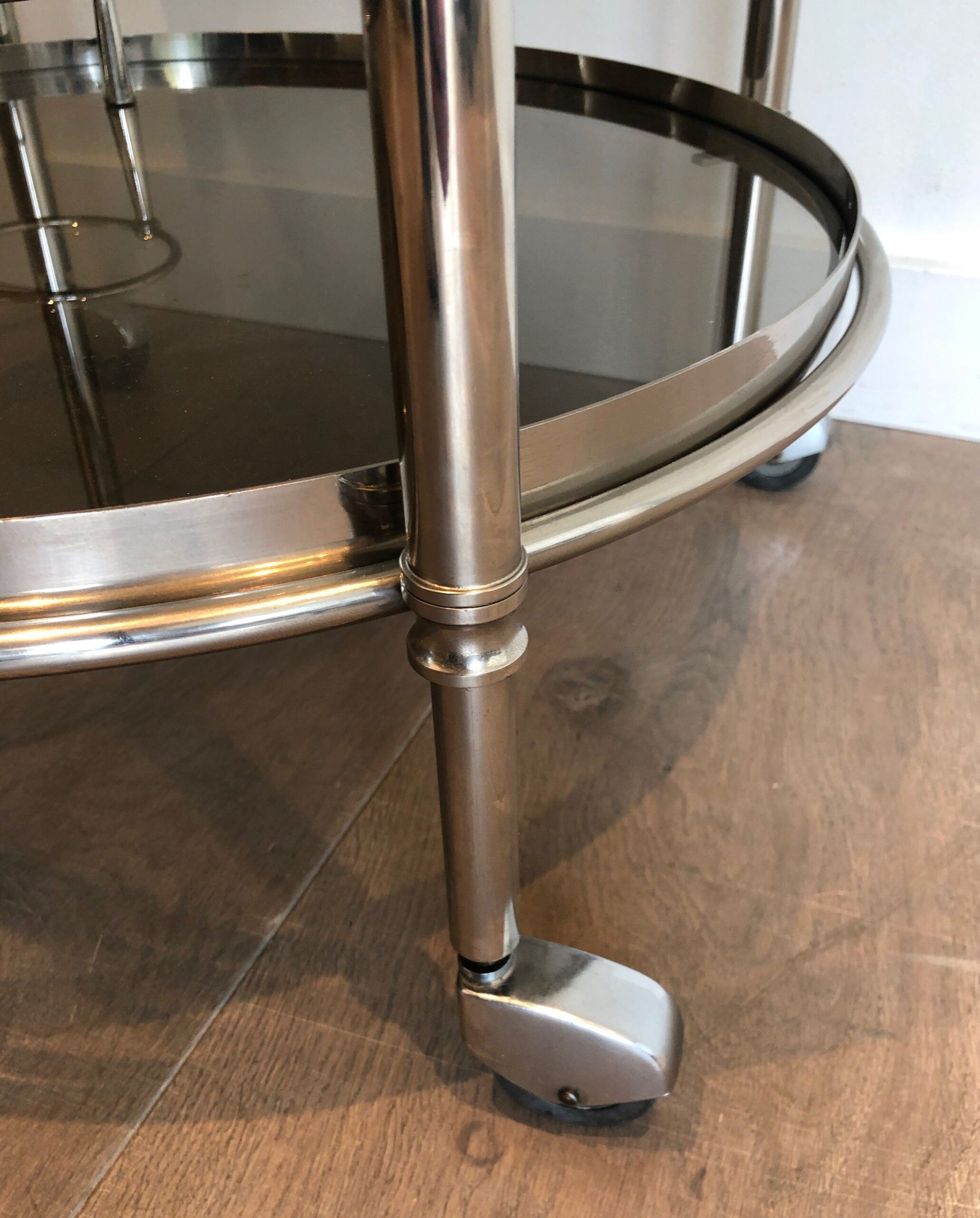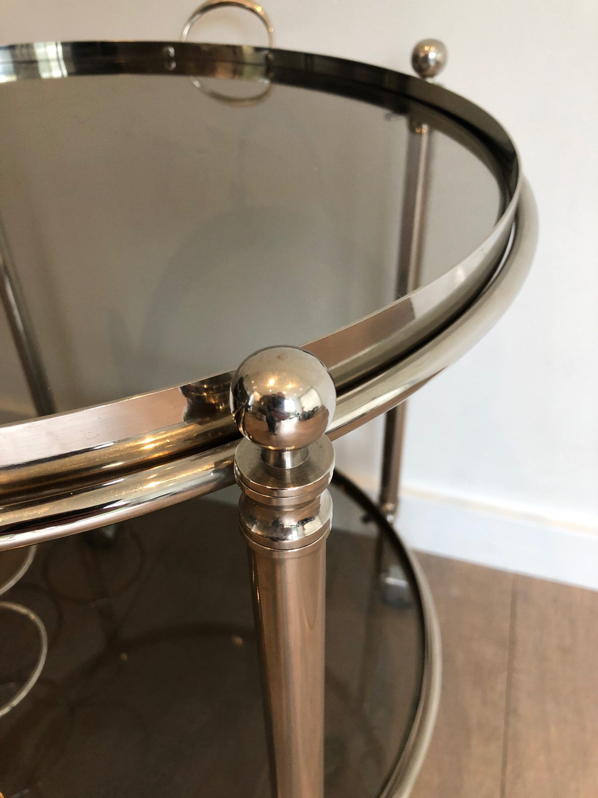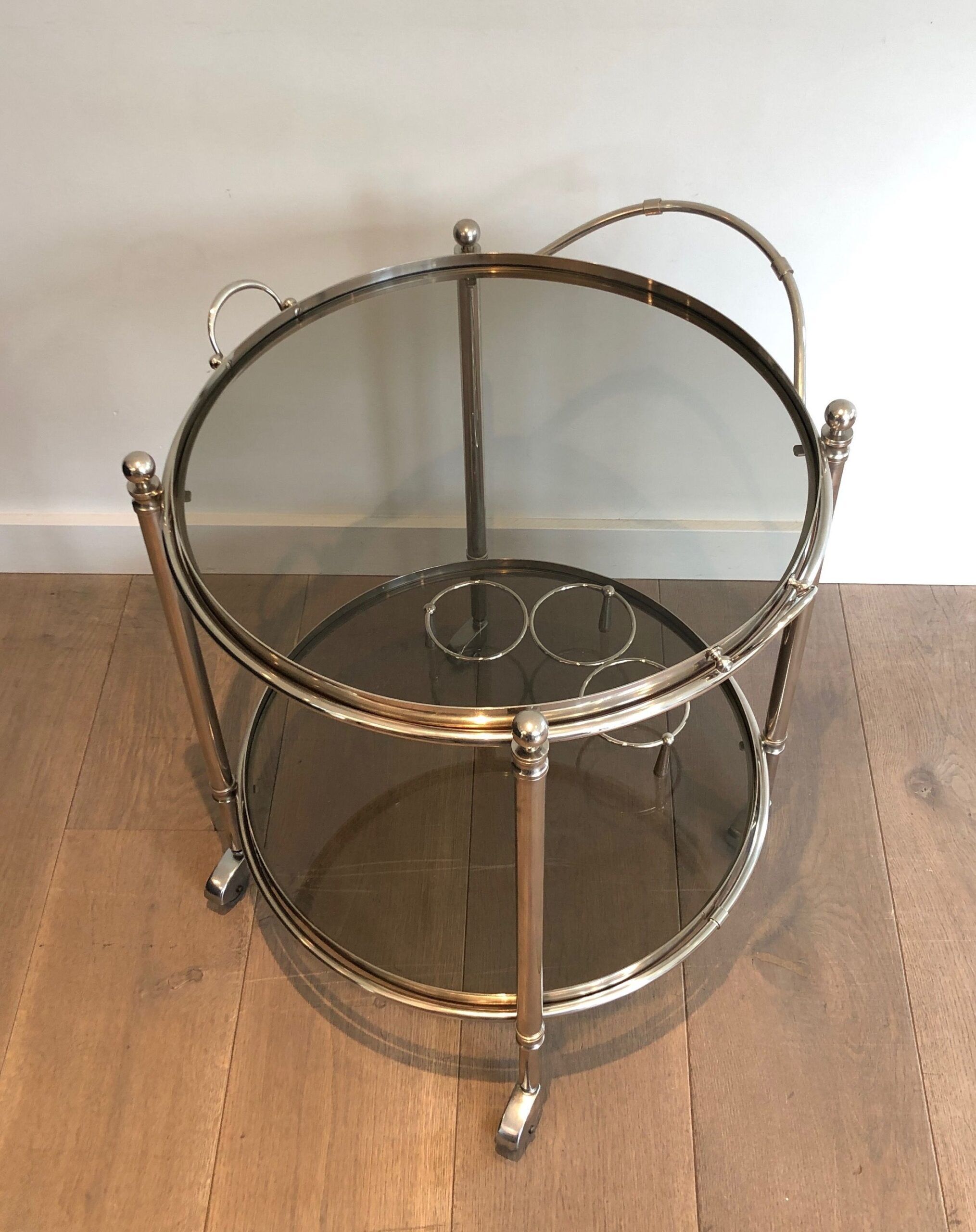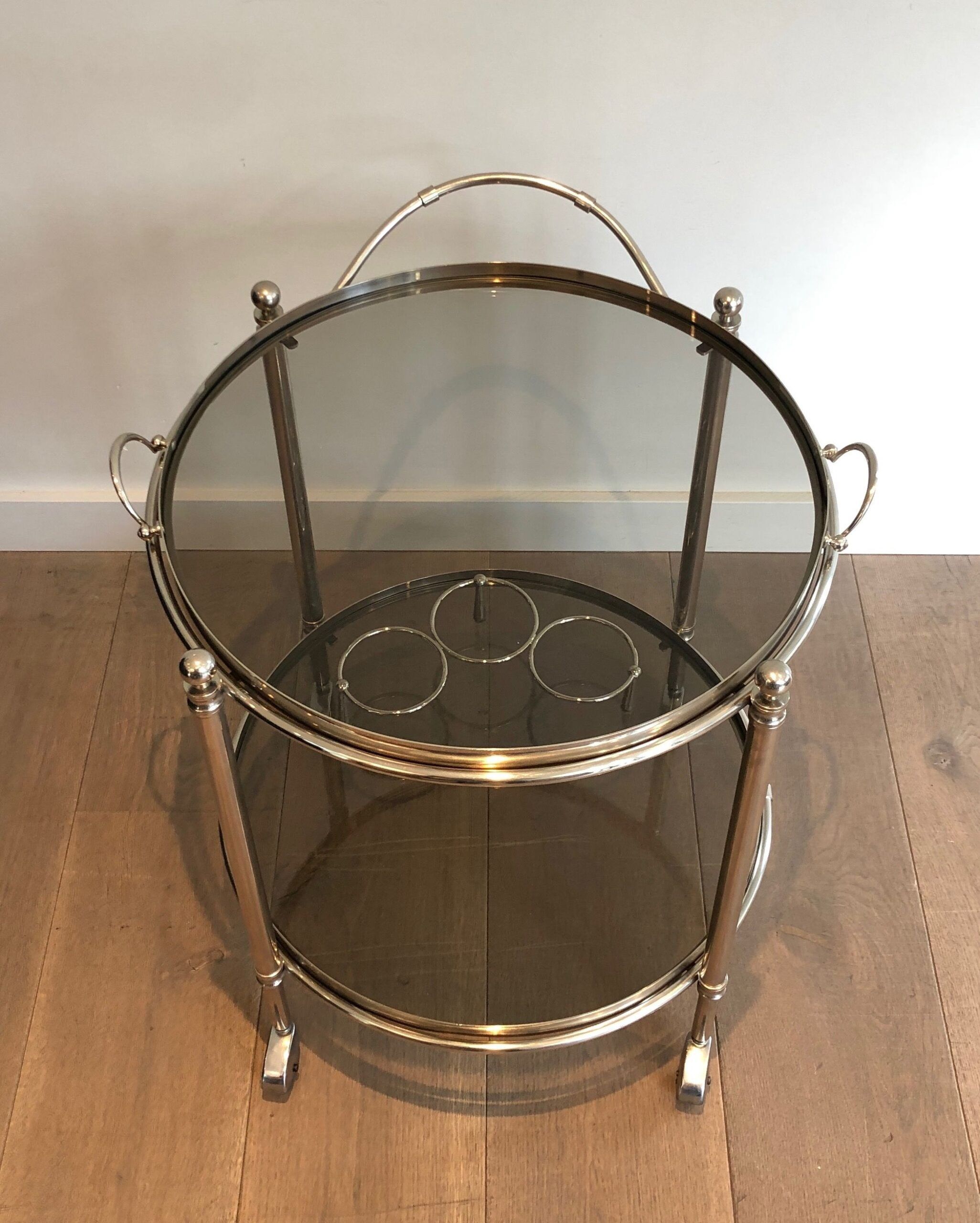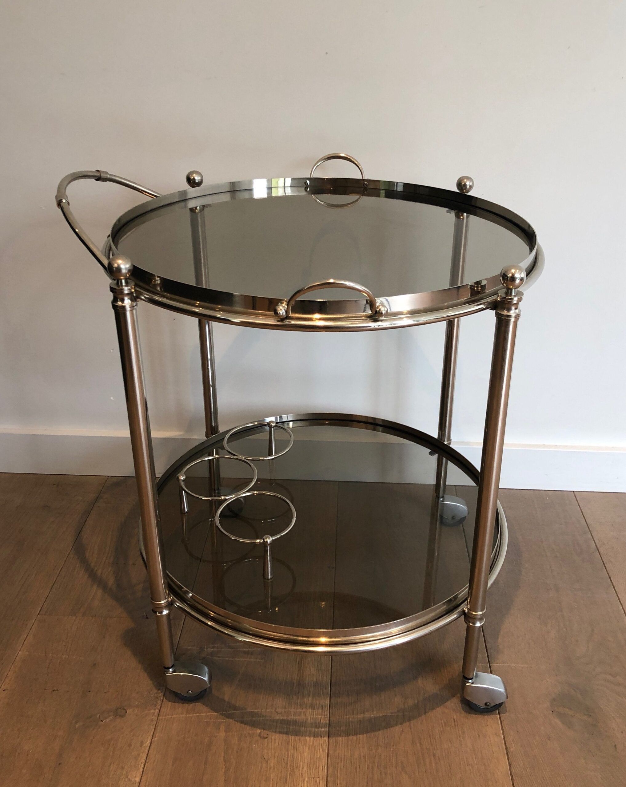 Round Silver Plated Metal Drinks Trolley with Smoked Glass Trays, French