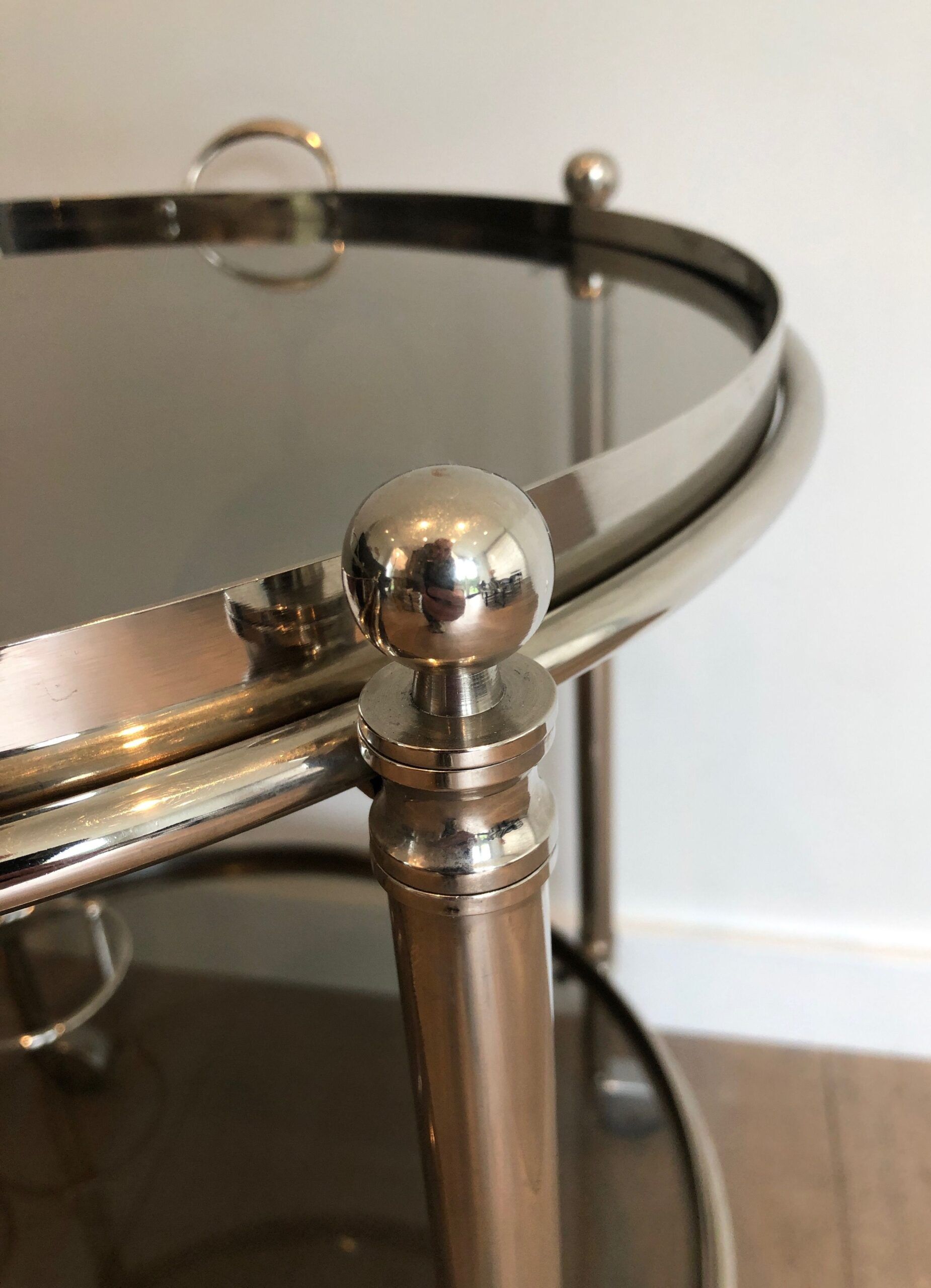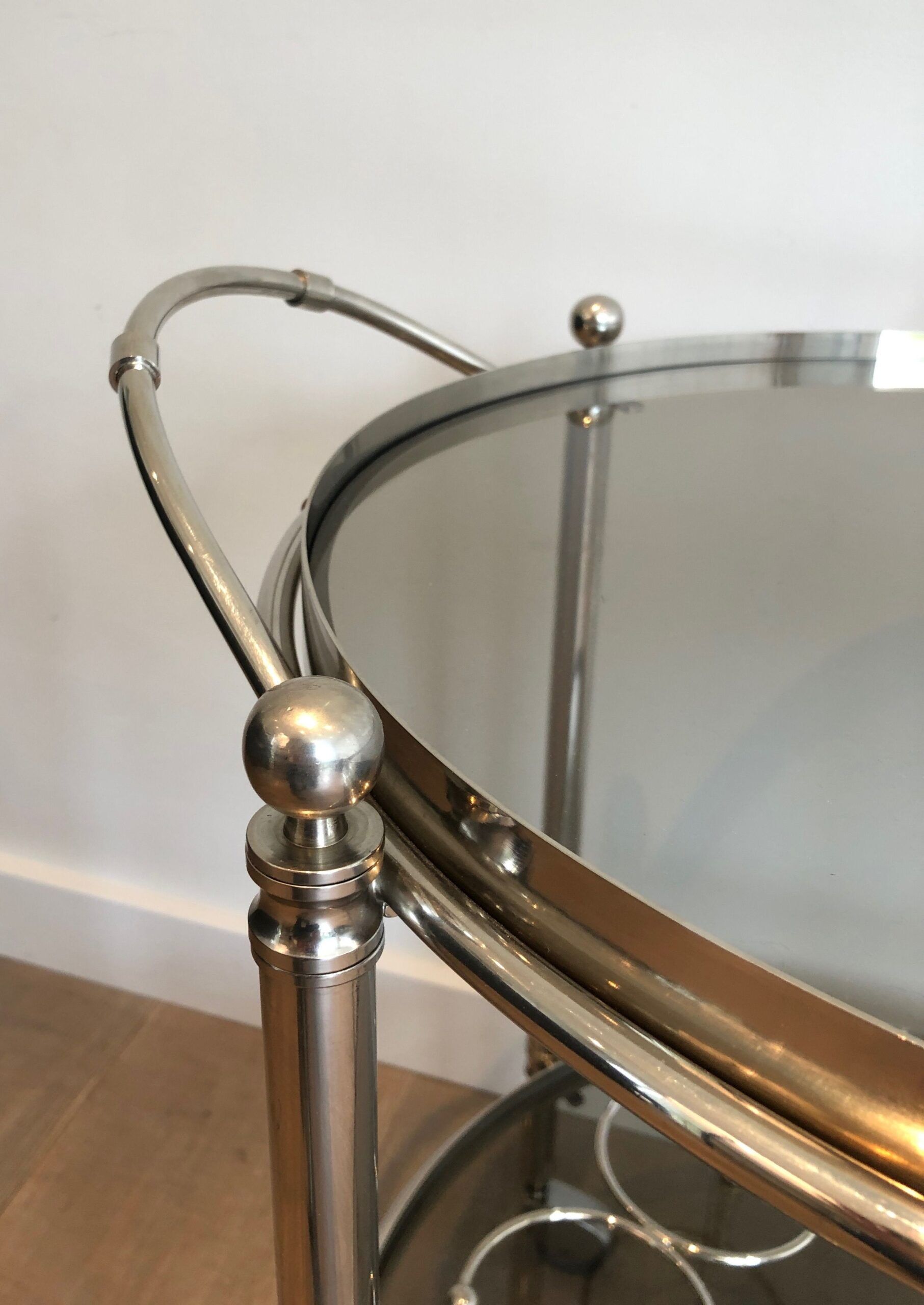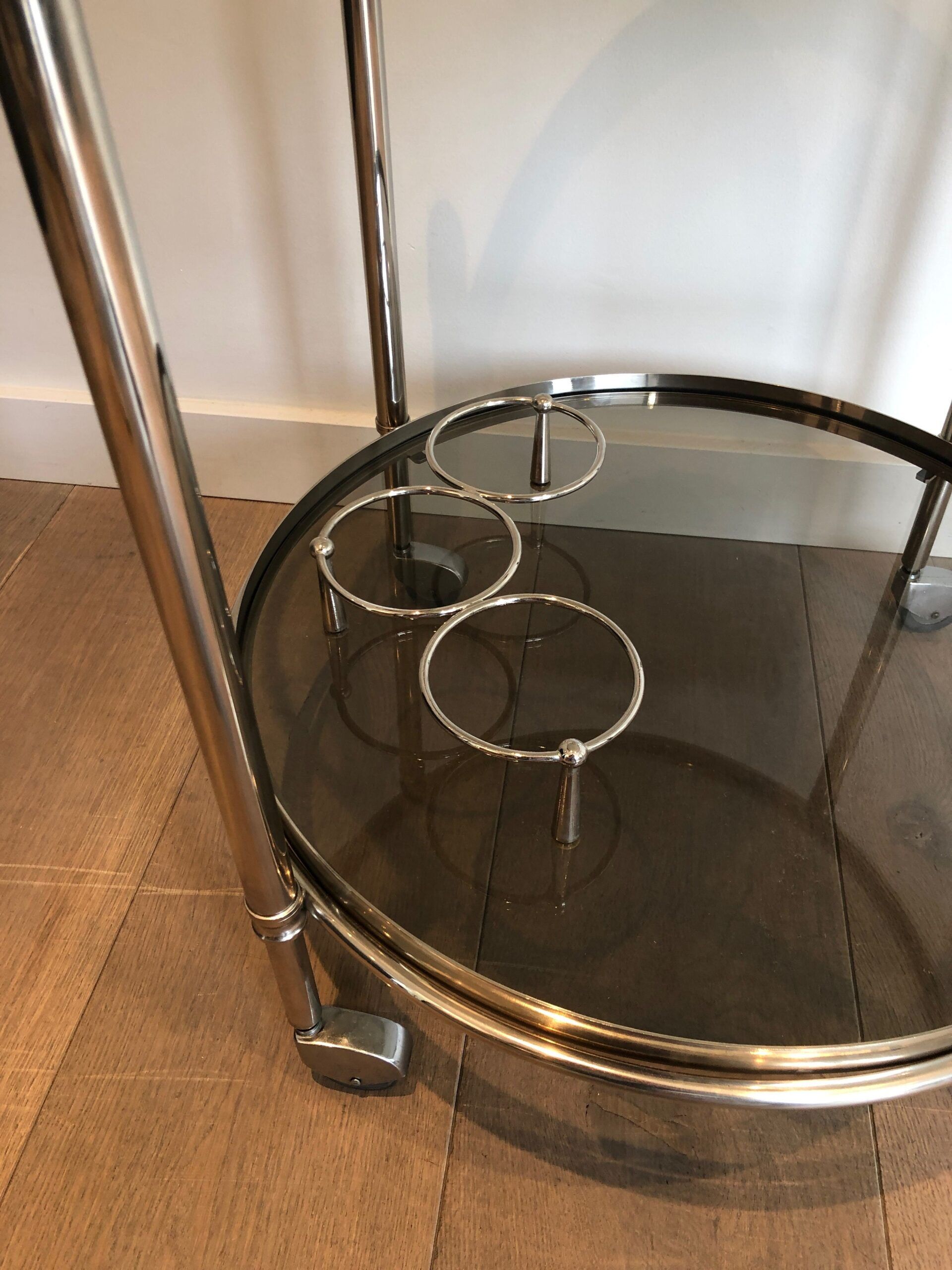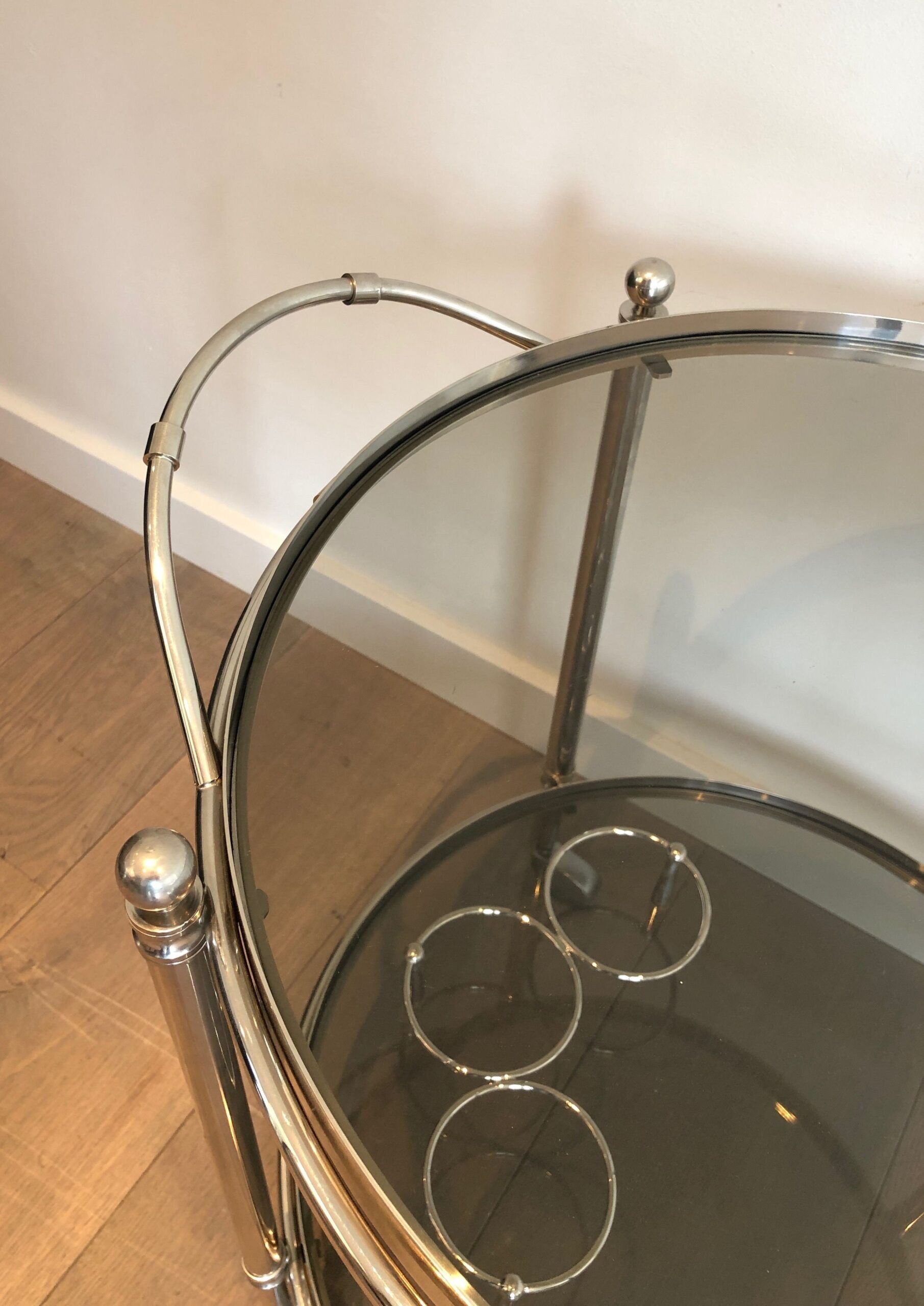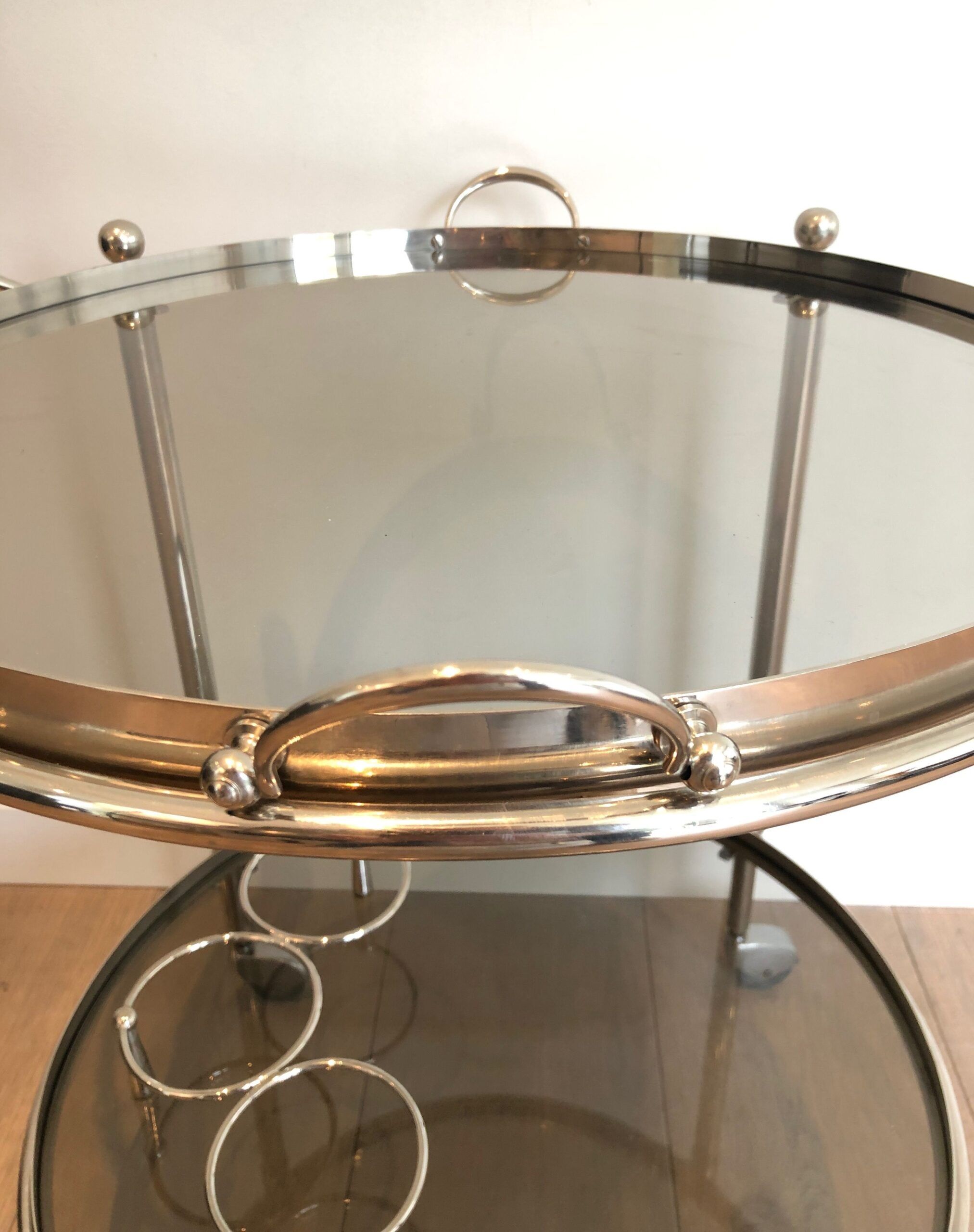 Round Silver Plated Metal Drinks Trolley with Smoked Glass Trays, French