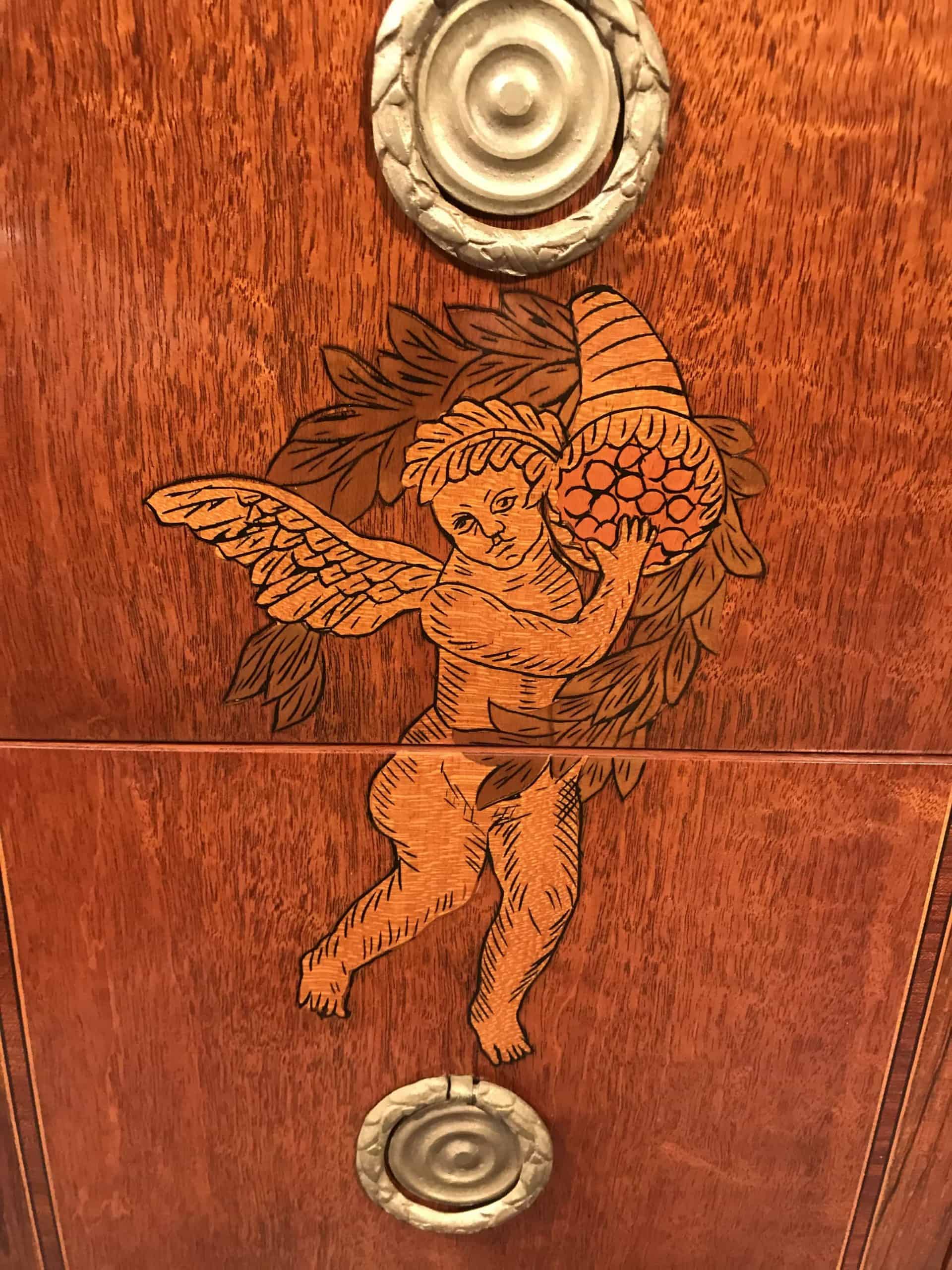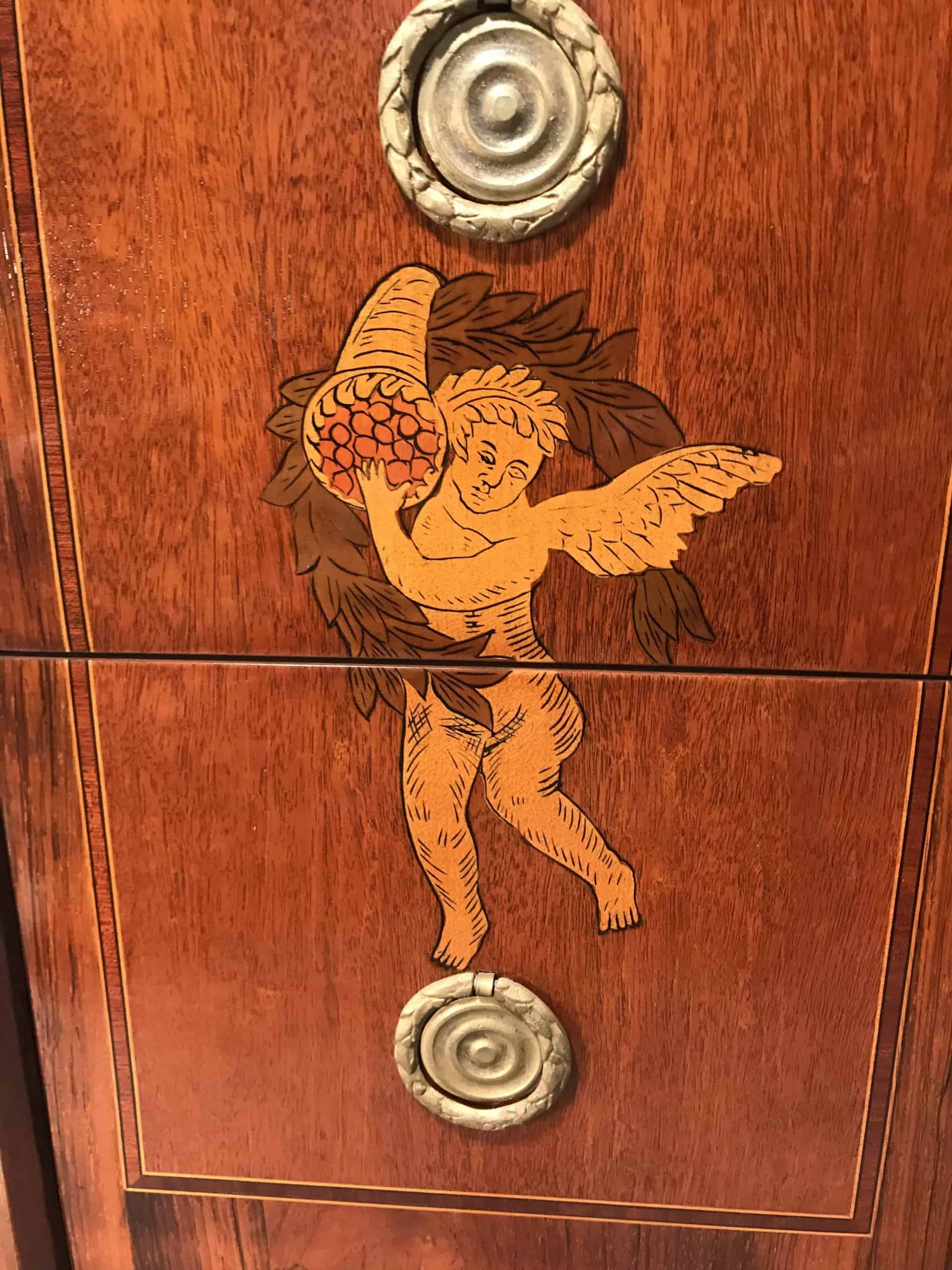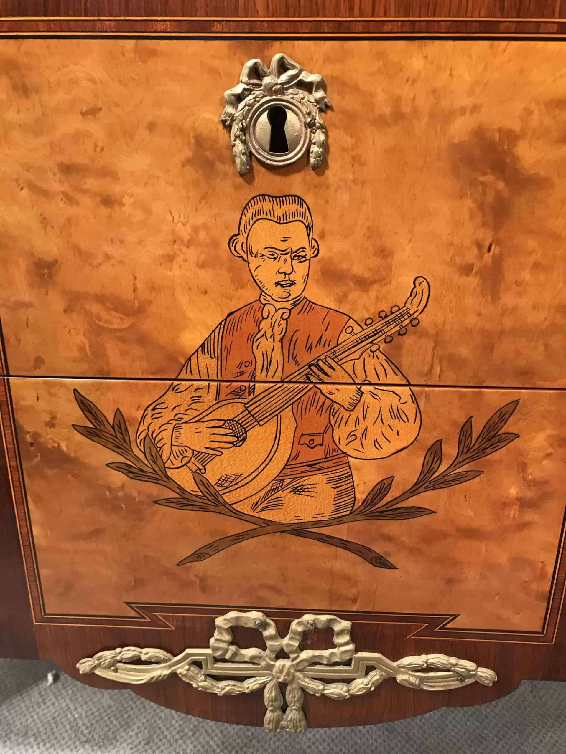It features many traditional Neoclassic elements, such as the intricate hand-drawn pictures depicting a mandolin player and two putti.