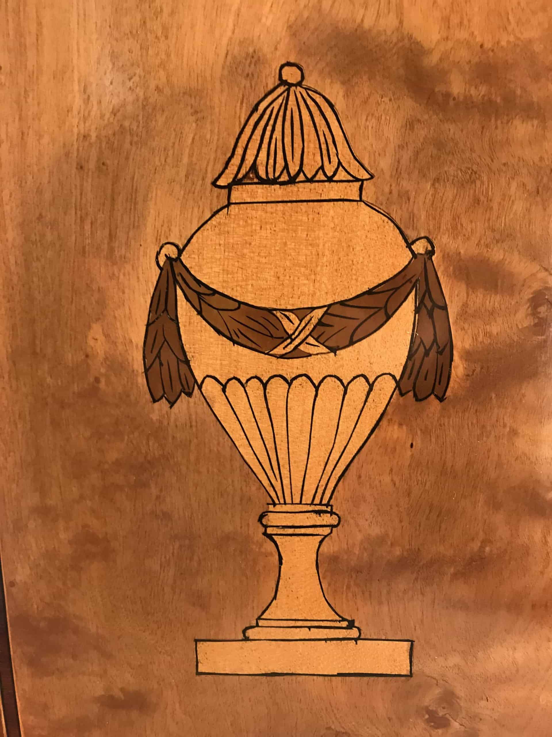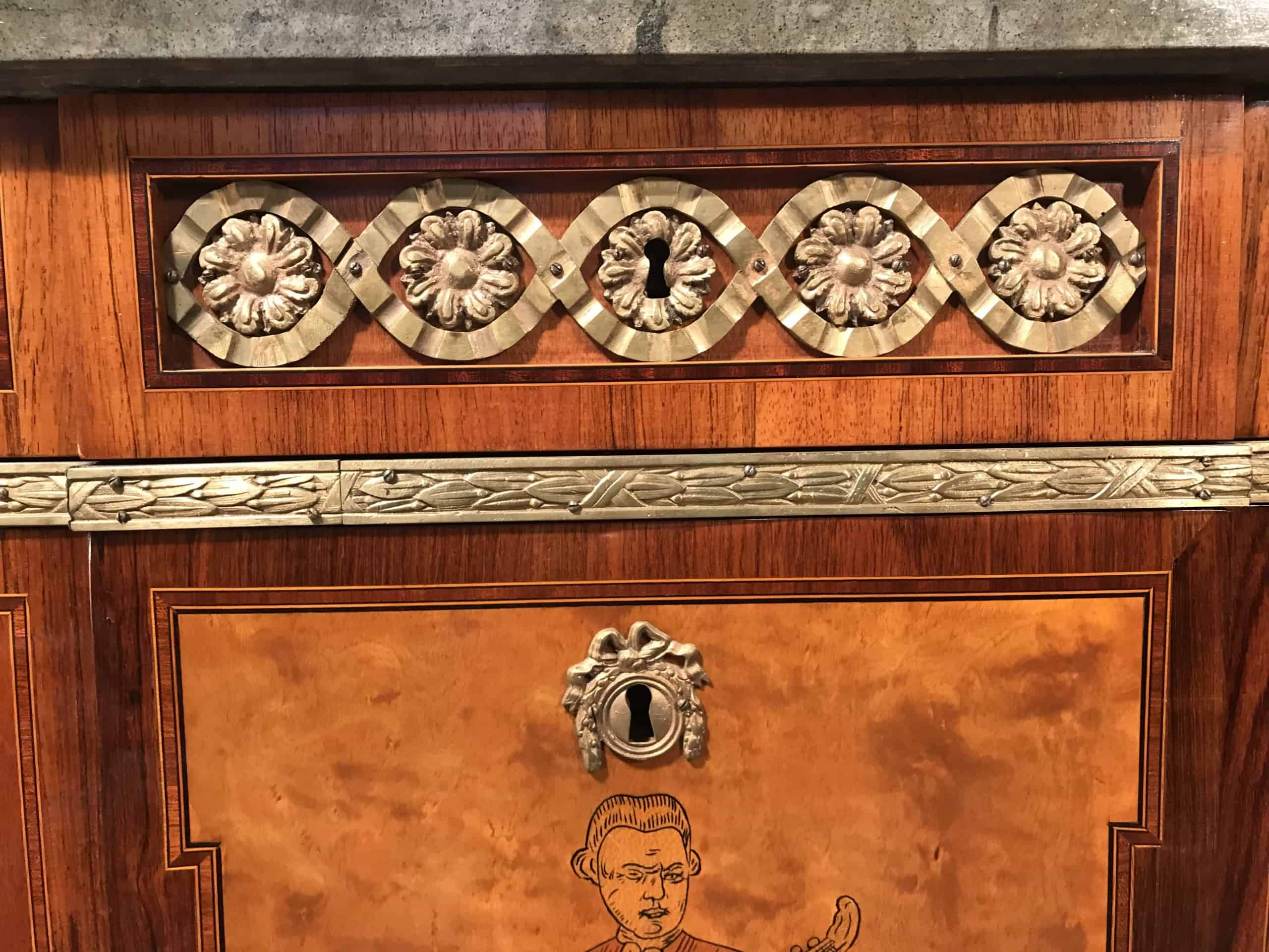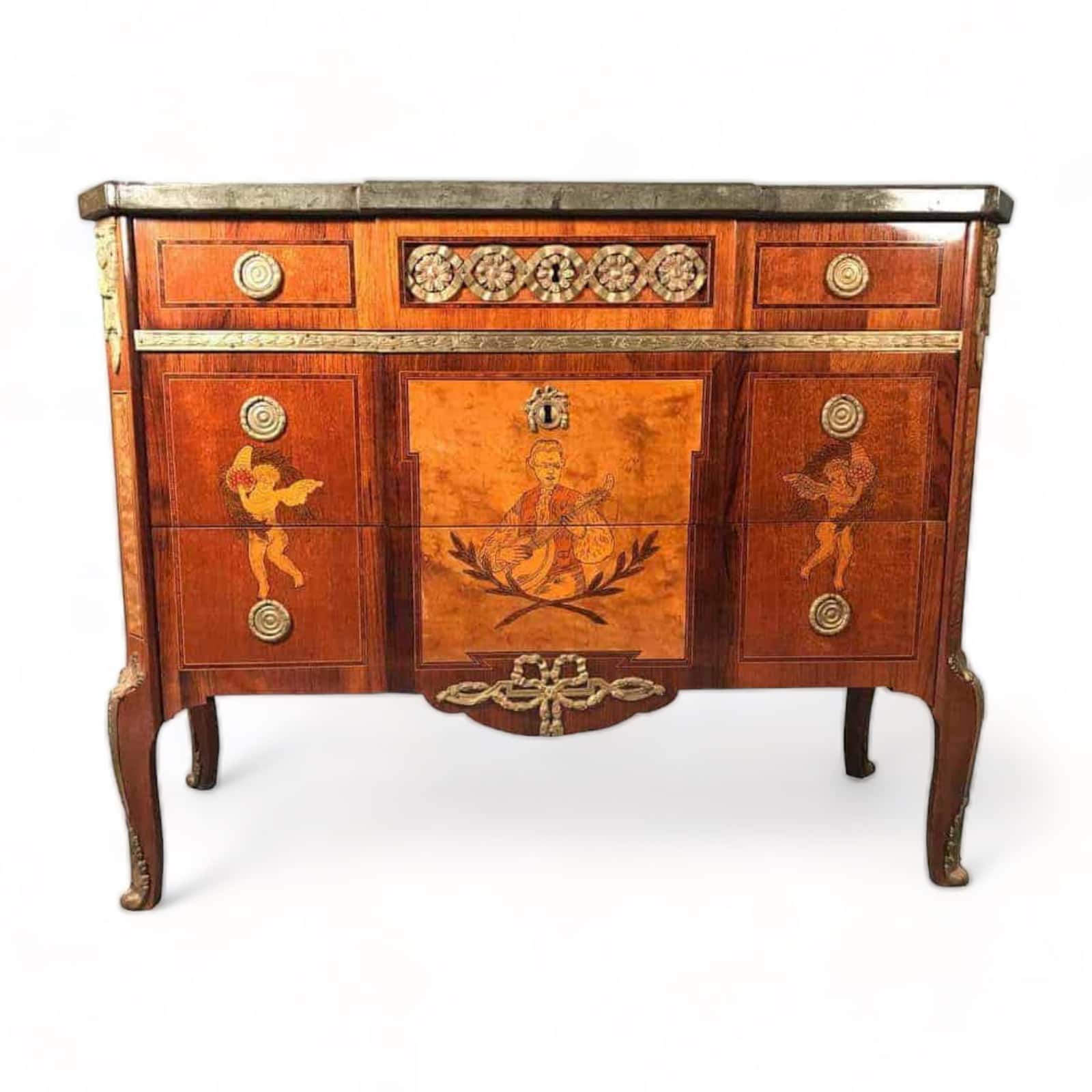 It features many traditional Neoclassic elements, such as the intricate hand-drawn pictures depicting a mandolin player and two putti.