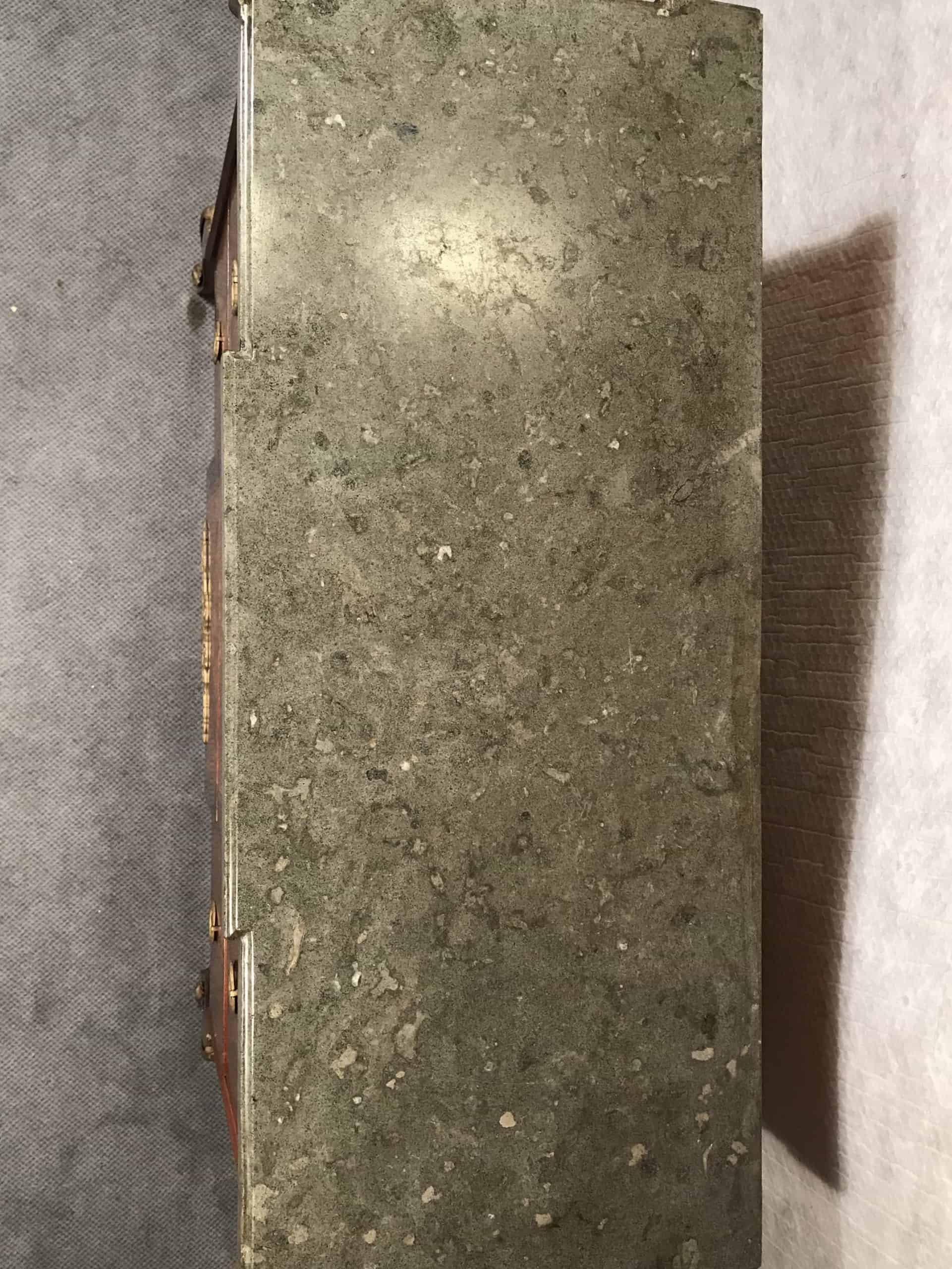 The walnut, beechwood, elmwood, and mahogany marquetry beautifully complement the smoky gray-green Kolmarden marble top.