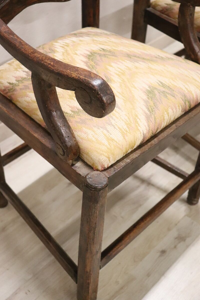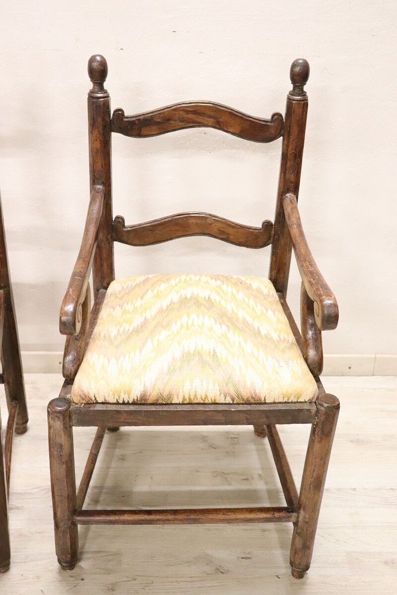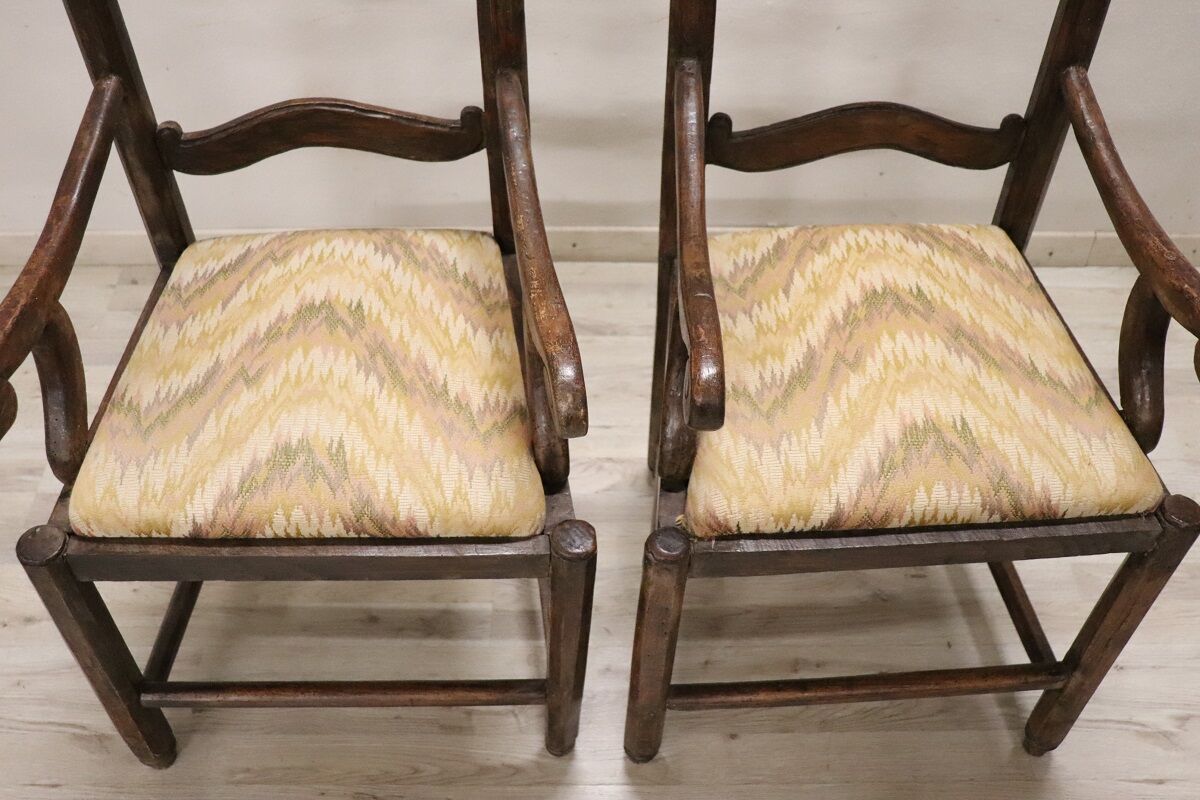 Introducing a stunning set of 2 antique 18th-century Italian armchairs, embodying the timeless elegance of the Louis XVI period. These charming rustic chairs feature essential, clean lines with a robust walnut wood frame that exemplifies durability and grace.