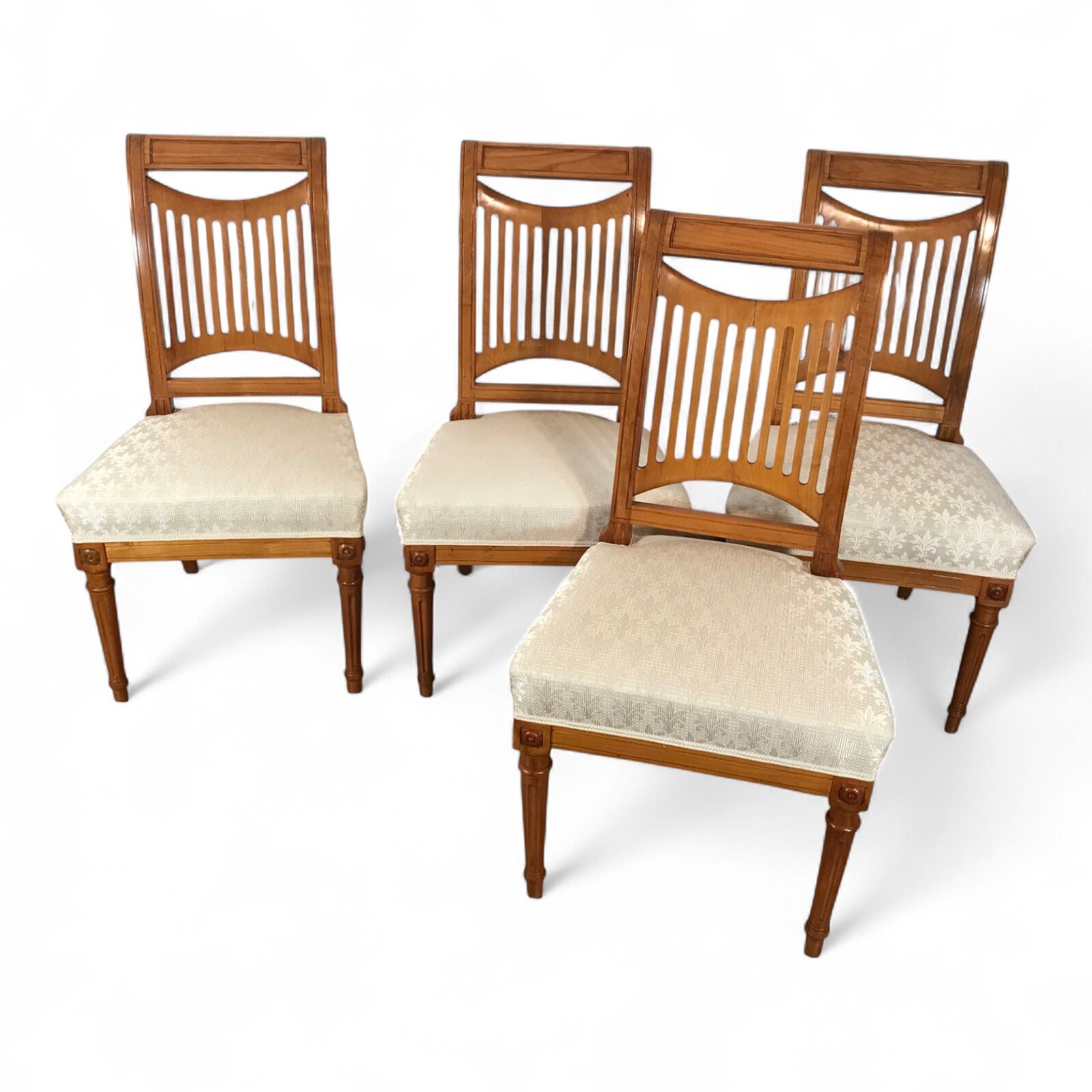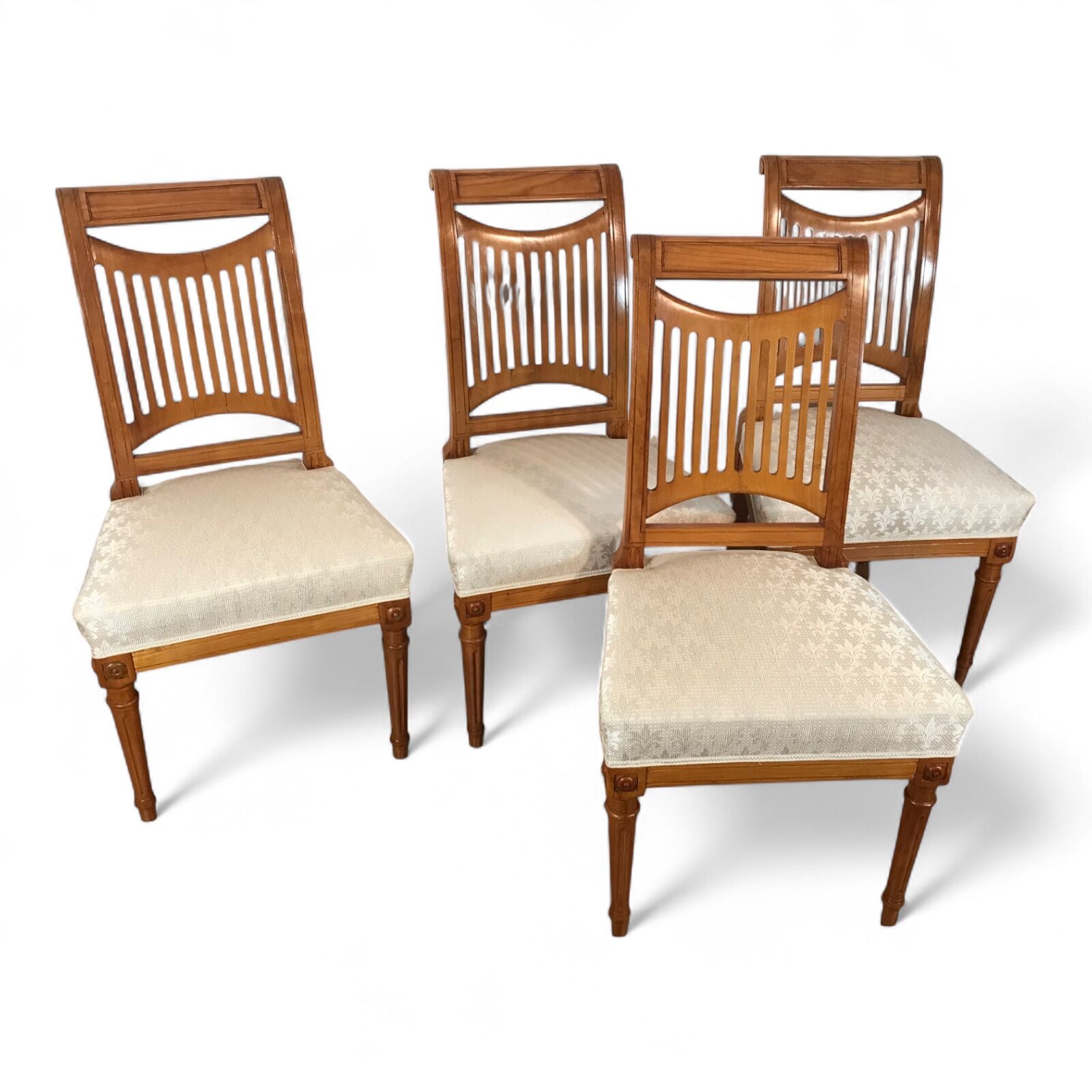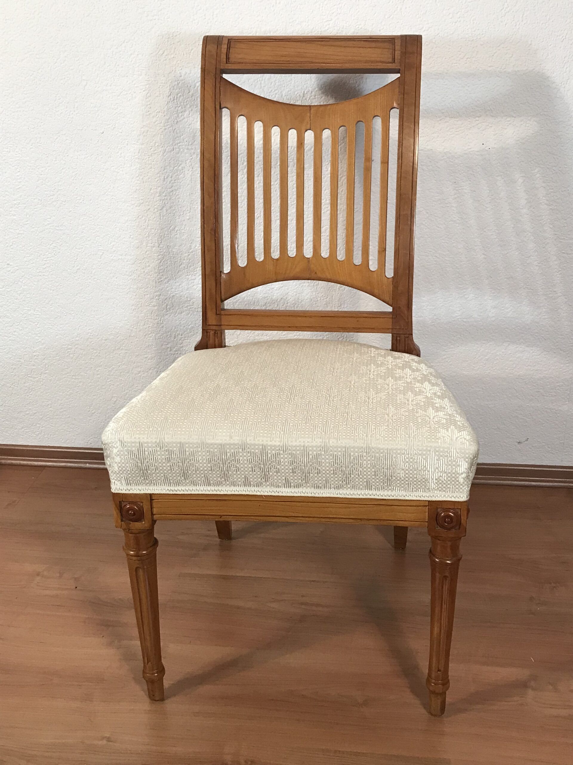 Elegant German set of 4 Neoclassical chairs from around 1830, crafted in rich cherry wood. Each chair features a beautifully designed openwork backrest, combining refined artistry with timeless style. Recently reupholstered with high-quality fabric, the chairs are in excellent condition—sturdy and ready for daily use as dining or side chairs.