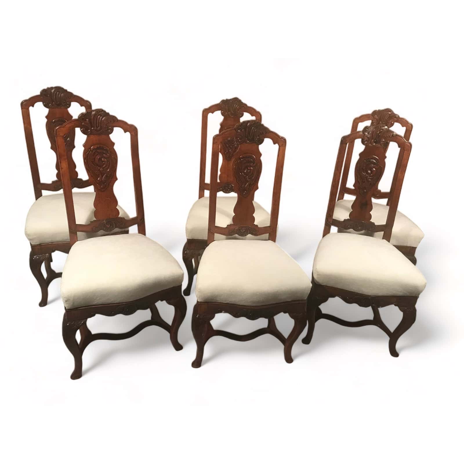 This set of six original Baroque chairs dates back to around 1750-60 and comes from southern Germany. These original antique Baroque chairs are a rare find. They have a beautifully carved decor with rocailles and acanthus leaves on the high backrest. The curved legs are connected by a stretcher. The chairs come refinished and have a new upholstery and fabric.