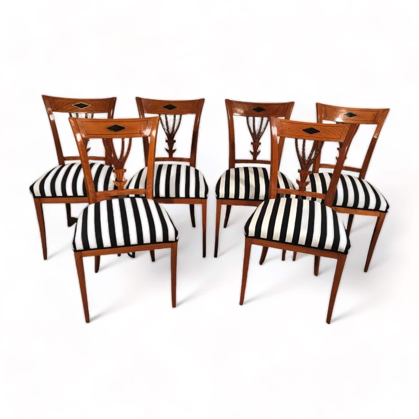 Beautifully designed set of six Neoclassical chairs dating back to around 1810-30. The chairs come from Southwest Germany. The back has a very pretty open work design with a hand carved leave design. The Neoclassical chairs are refinished and have a new upholstery and are covered with a very pretty black and white striped woven Jacquard fabric by JAB Anstoetz.