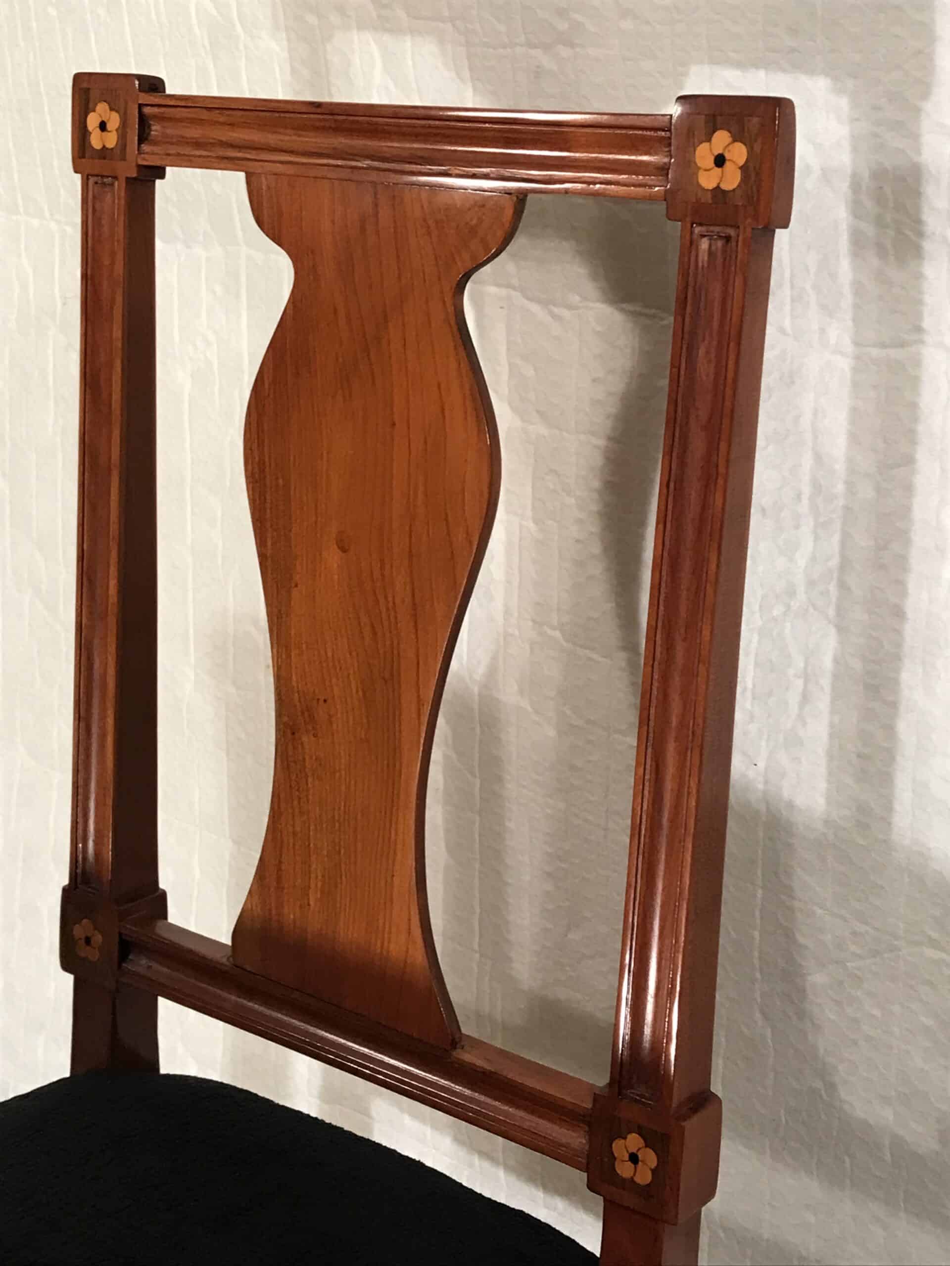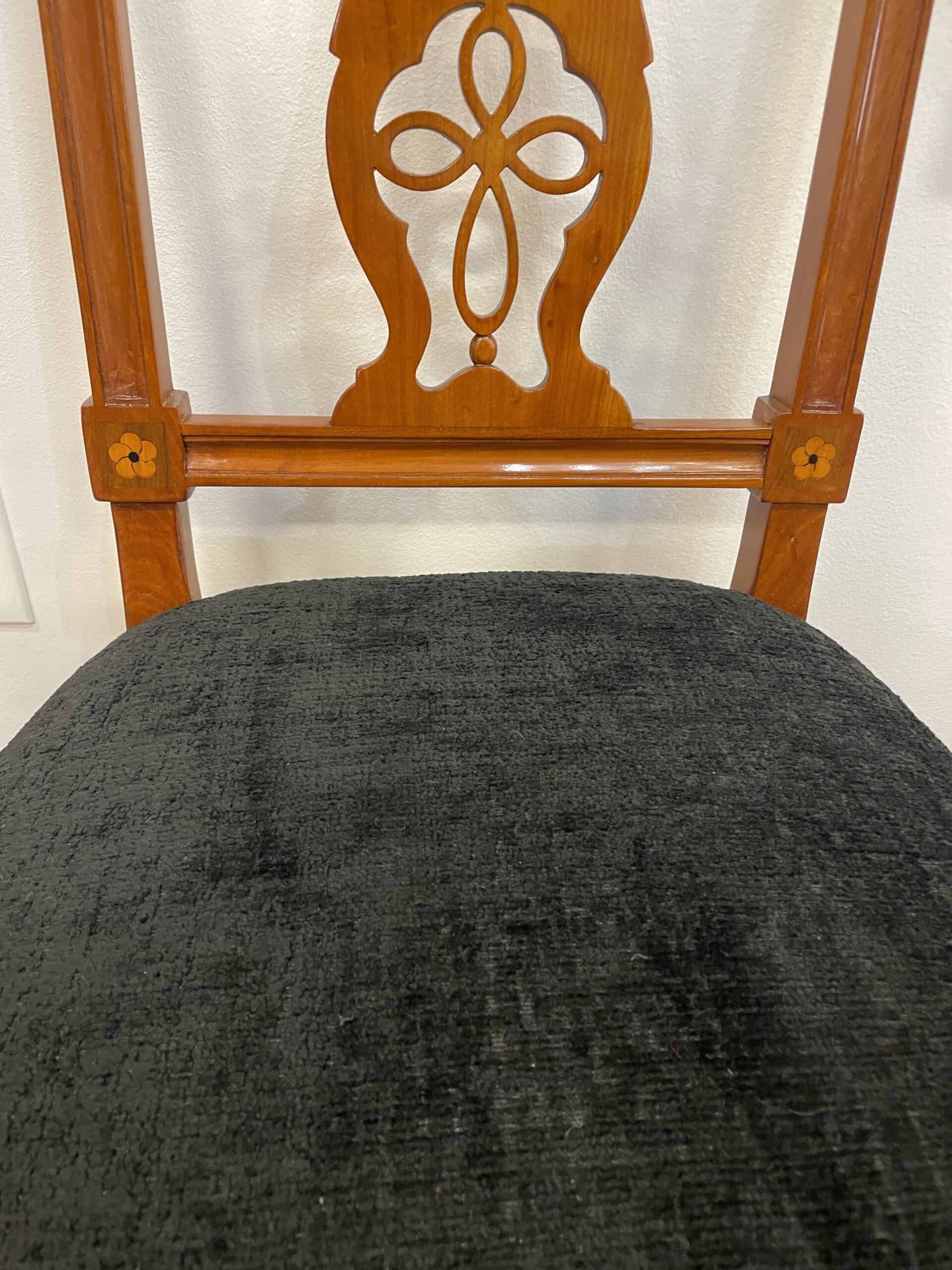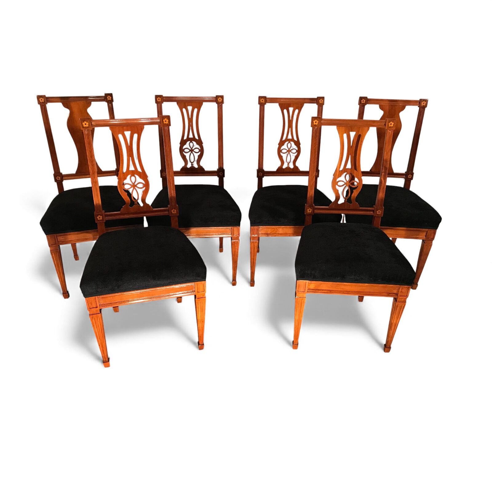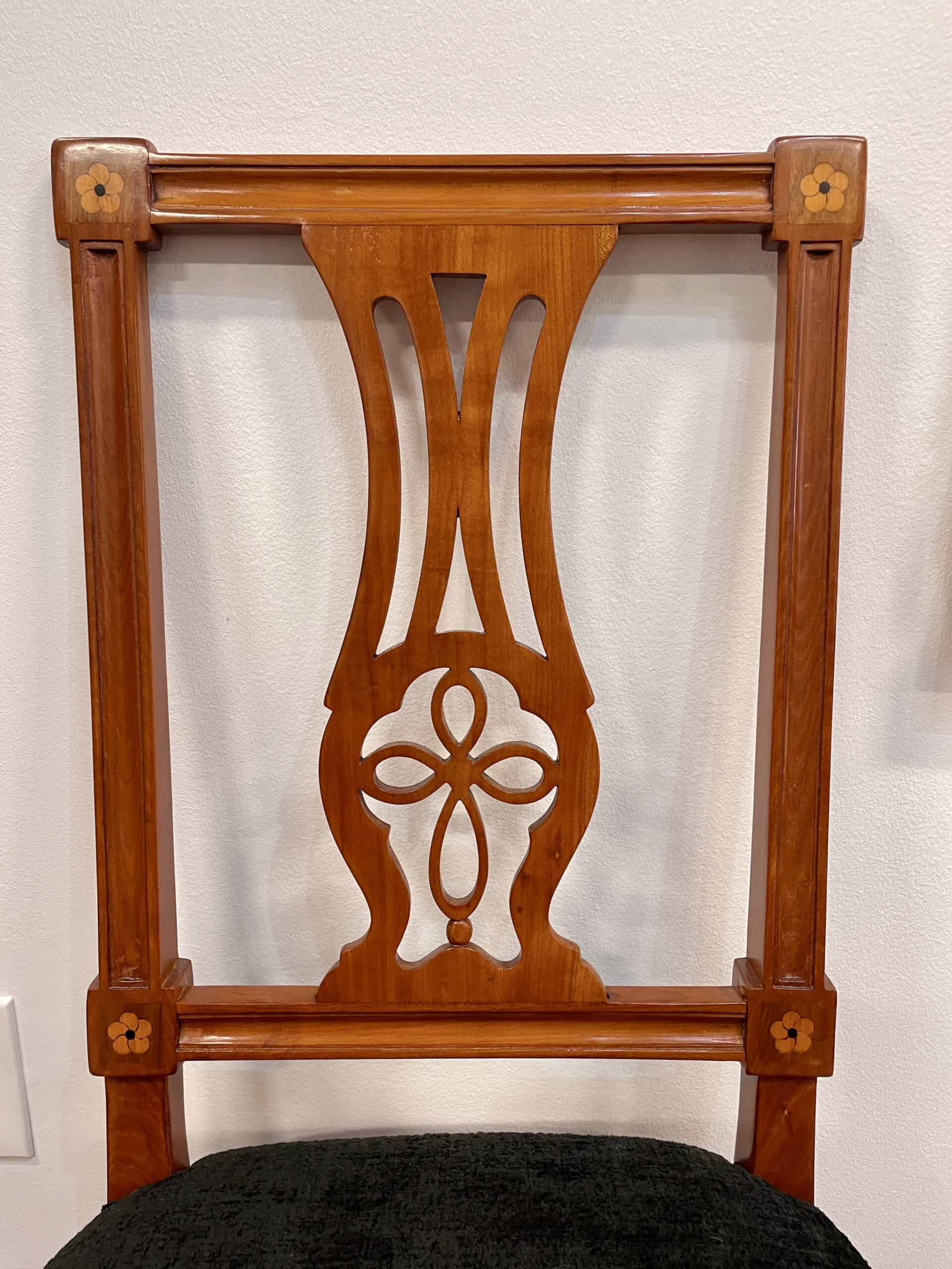 Discover a rare find with our exquisite set of six Neoclassical chairs originating from around 1800’s Southern Germany. Crafted from cherry wood veneer adorned with intricate inlaid rosette decor, these chairs exude timeless elegance. Four of the Louis XVI chairs feature stunning openwork back decor, while the remaining two boast equally exquisite cherry wood panels. Meticulously refinished with a shellac hand polish, these Neoclassical chairs also feature new upholstery and fabric, ensuring both beauty and comfort. Elevate your space with this remarkable blend of history and craftsmanship.
