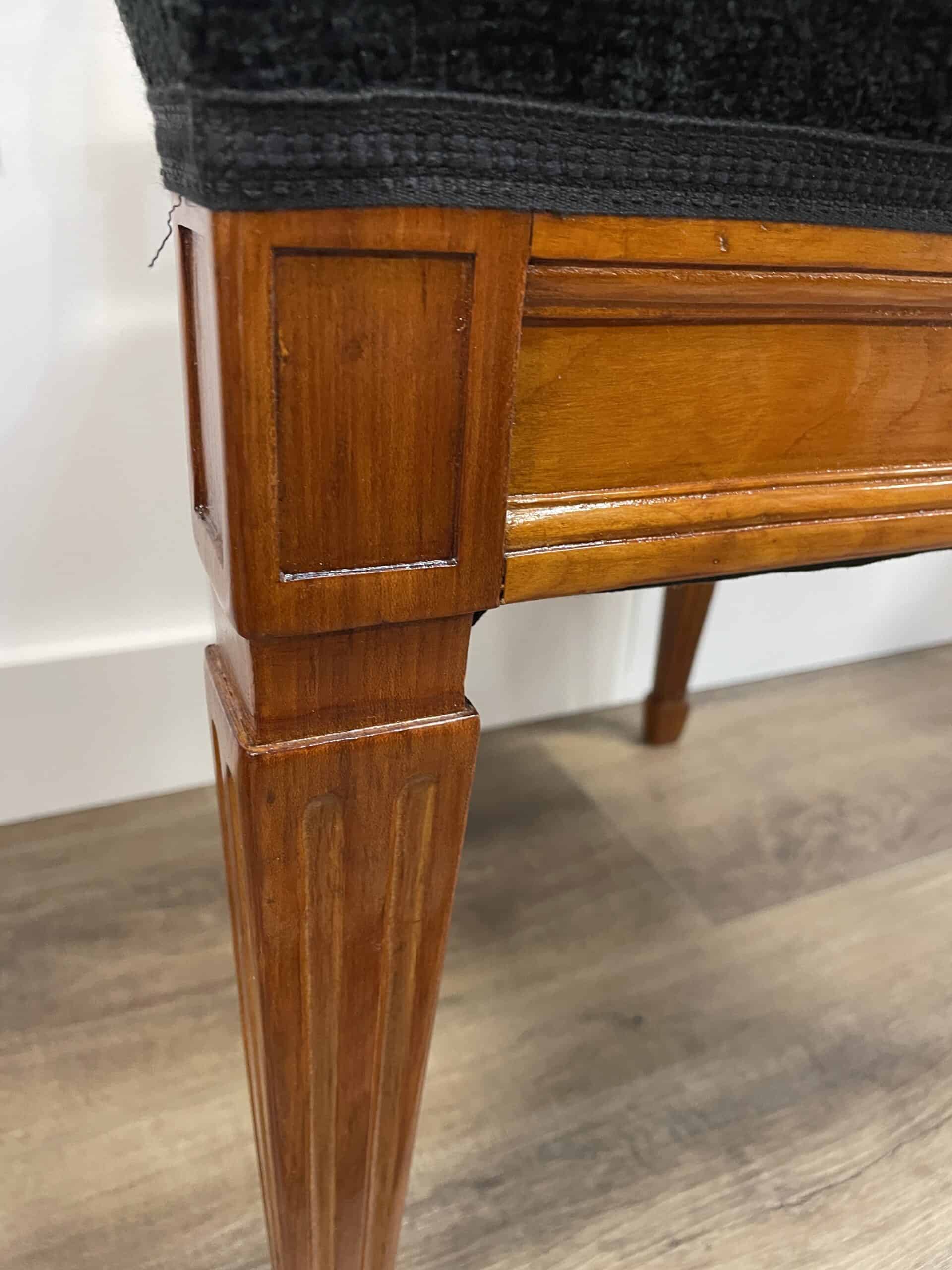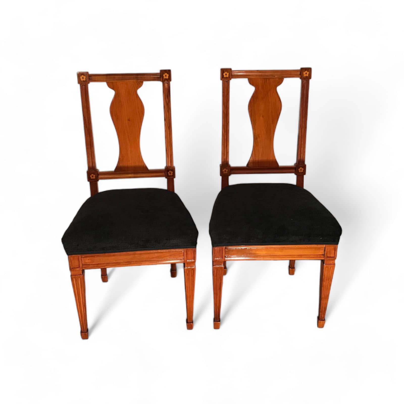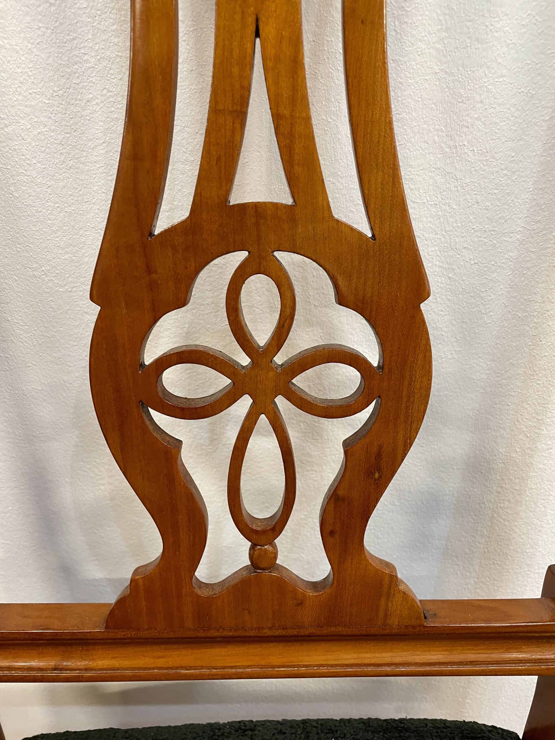 Discover a rare find with our exquisite set of six Neoclassical chairs originating from around 1800’s Southern Germany. Crafted from cherry wood veneer adorned with intricate inlaid rosette decor, these chairs exude timeless elegance. Four of the Louis XVI chairs feature stunning openwork back decor, while the remaining two boast equally exquisite cherry wood panels. Meticulously refinished with a shellac hand polish, these Neoclassical chairs also feature new upholstery and fabric, ensuring both beauty and comfort. Elevate your space with this remarkable blend of history and craftsmanship.