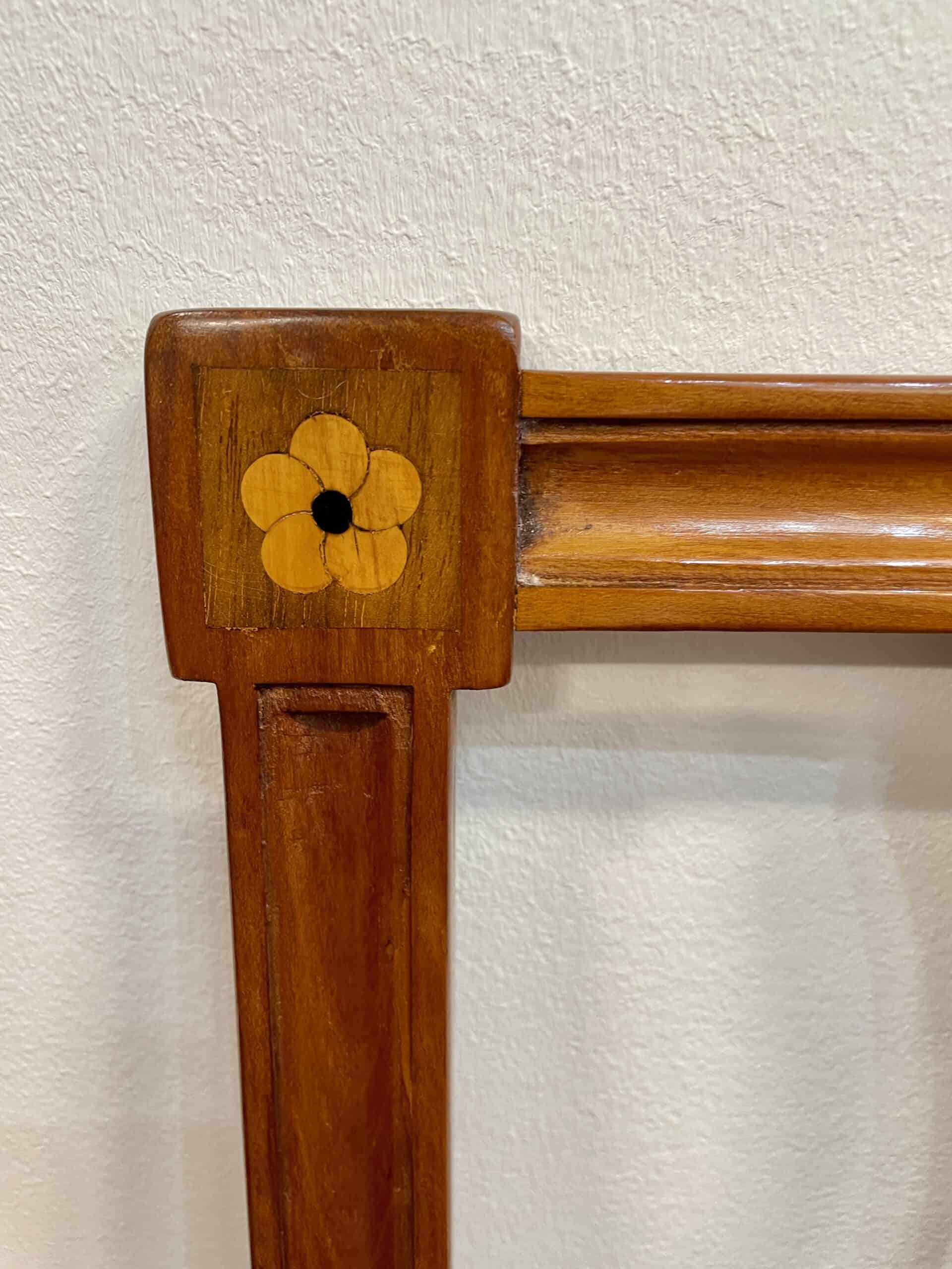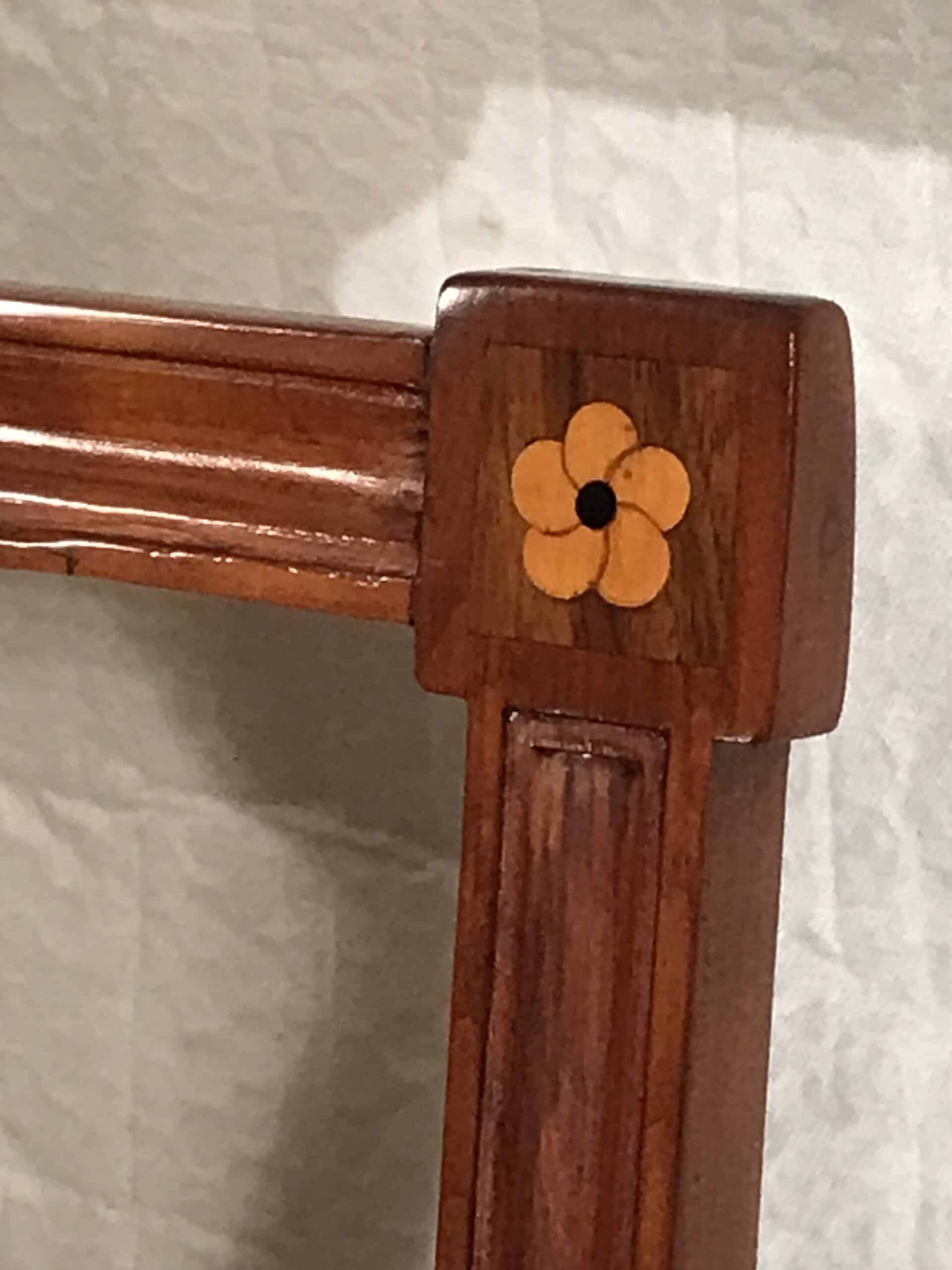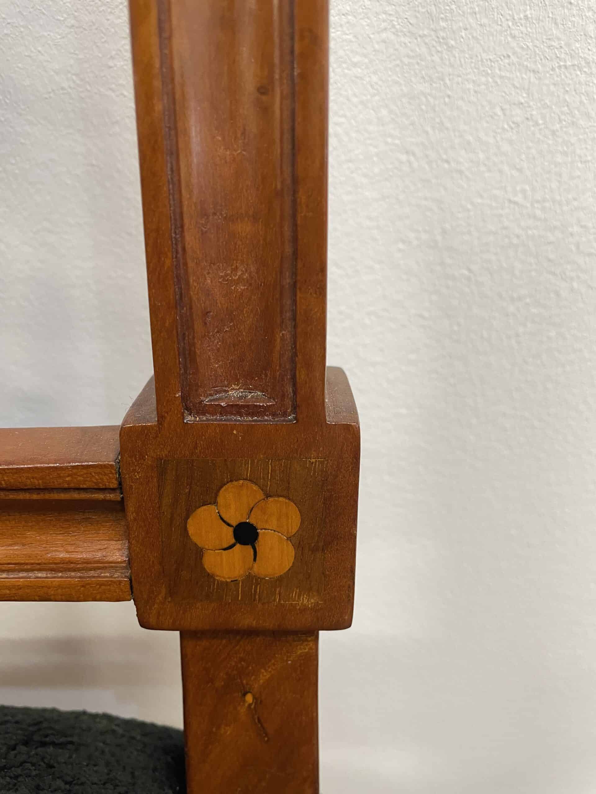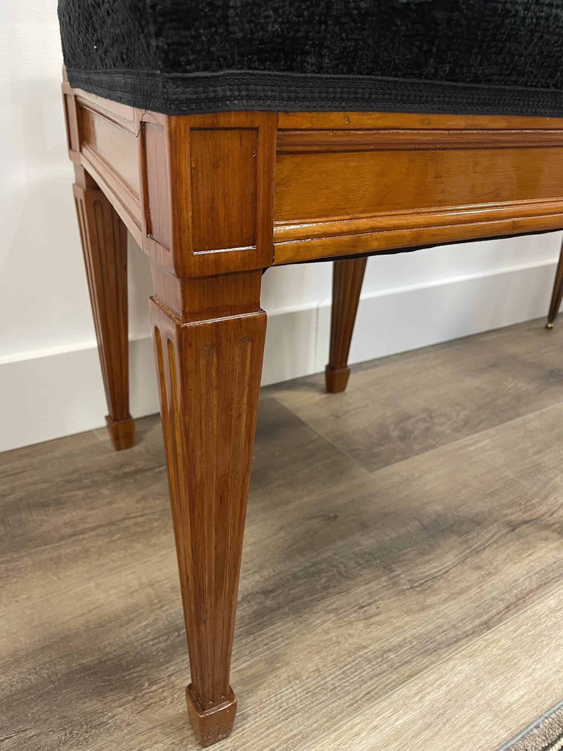 Discover a rare find with our exquisite set of six Neoclassical chairs originating from around 1800’s Southern Germany. Crafted from cherry wood veneer adorned with intricate inlaid rosette decor, these chairs exude timeless elegance. Four of the Louis XVI chairs feature stunning openwork back decor, while the remaining two boast equally exquisite cherry wood panels. Meticulously refinished with a shellac hand polish, these Neoclassical chairs also feature new upholstery and fabric, ensuring both beauty and comfort. Elevate your space with this remarkable blend of history and craftsmanship.