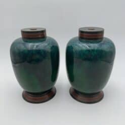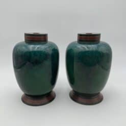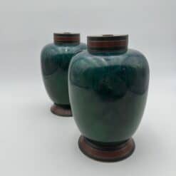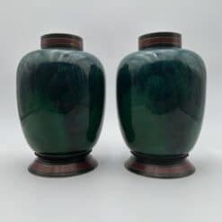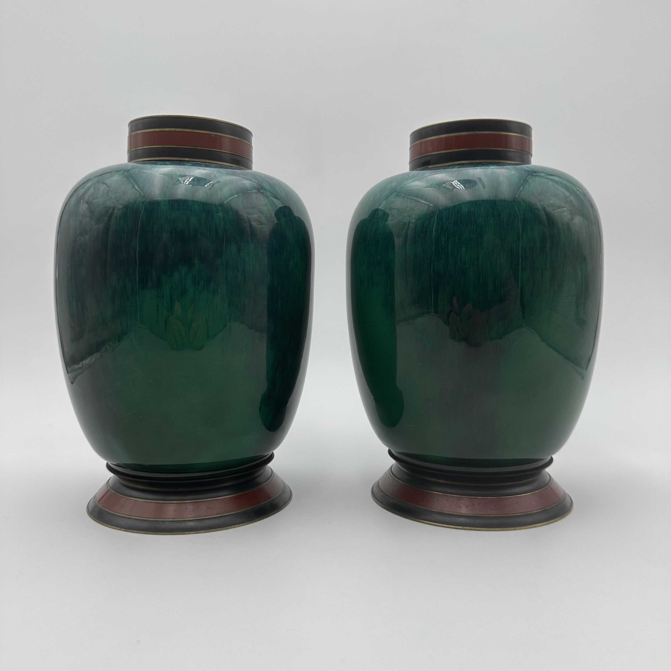 The pair remains in excellent vintage condition with a well-preserved glossy finish. These vases offer collectors a rare and sophisticated addition.