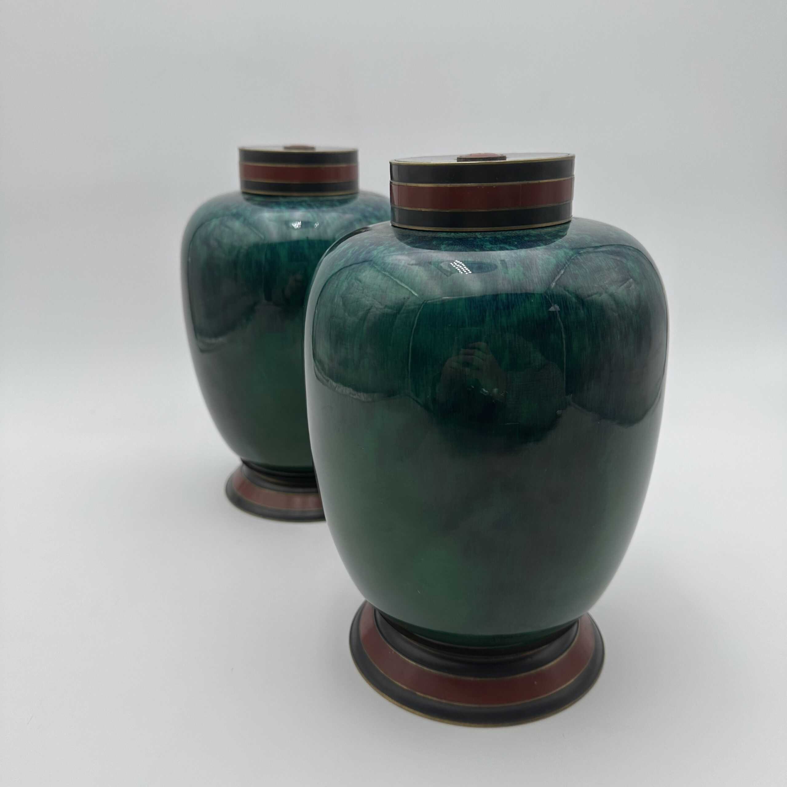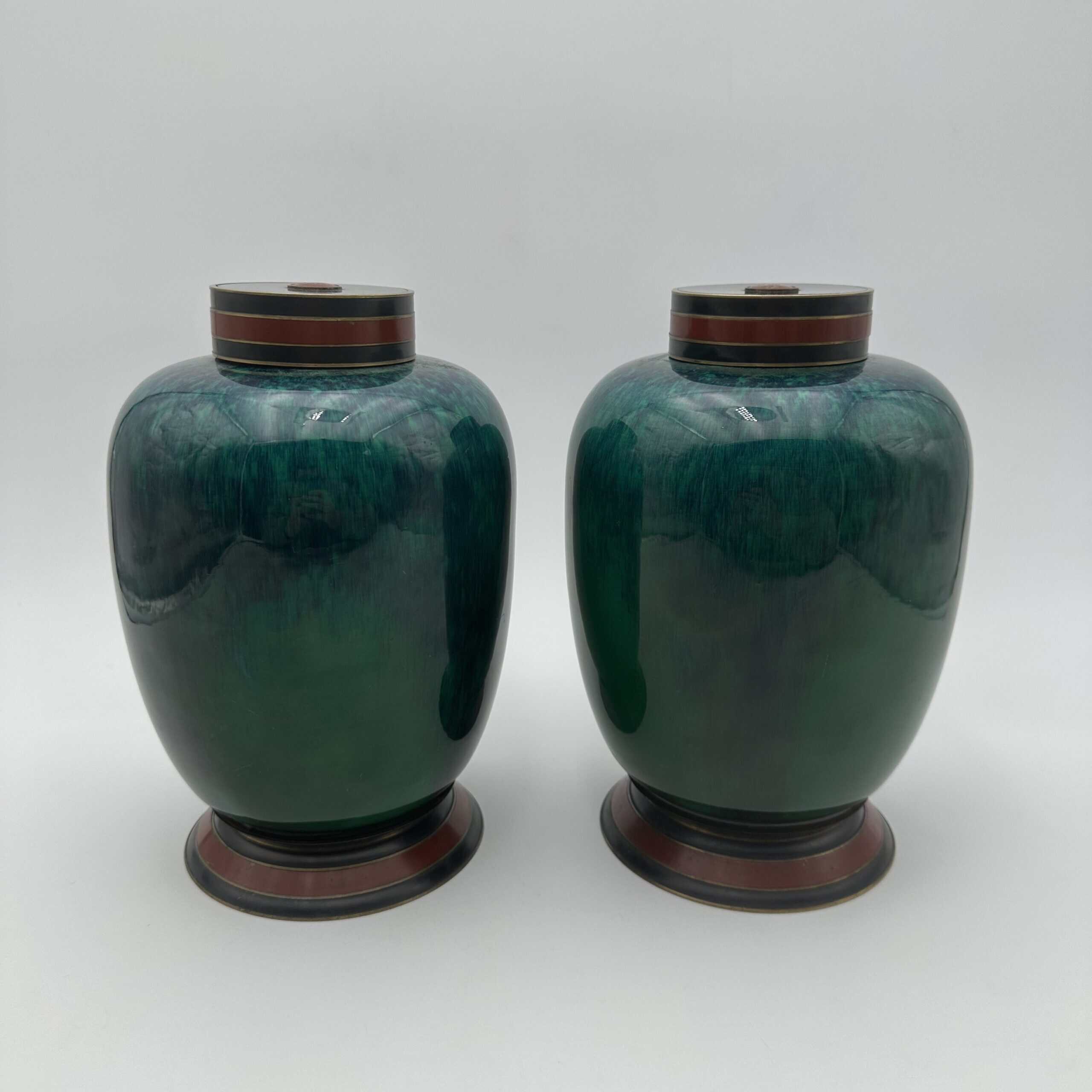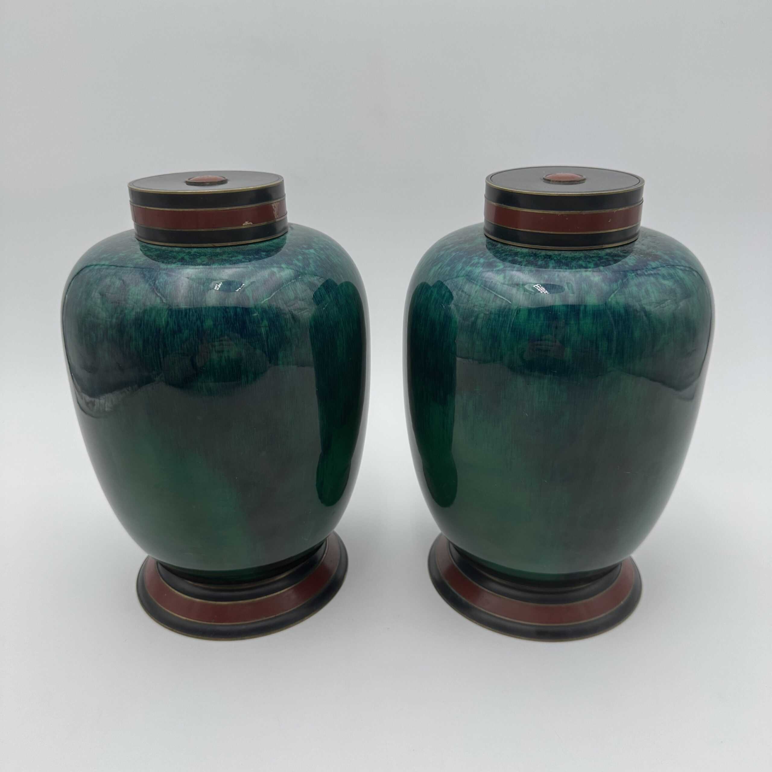 The bases and lids display geometric bands in dark red, black, and fine gold-toned lines. This interplay between fluid glaze and strict geometry defines Art Deco style. These vases showcase both technical mastery and bold design. Each vase presents balanced proportions and a strong decorative presence. These pieces enhance a mantel, console, or sideboard with vibrant color and refined elegance.