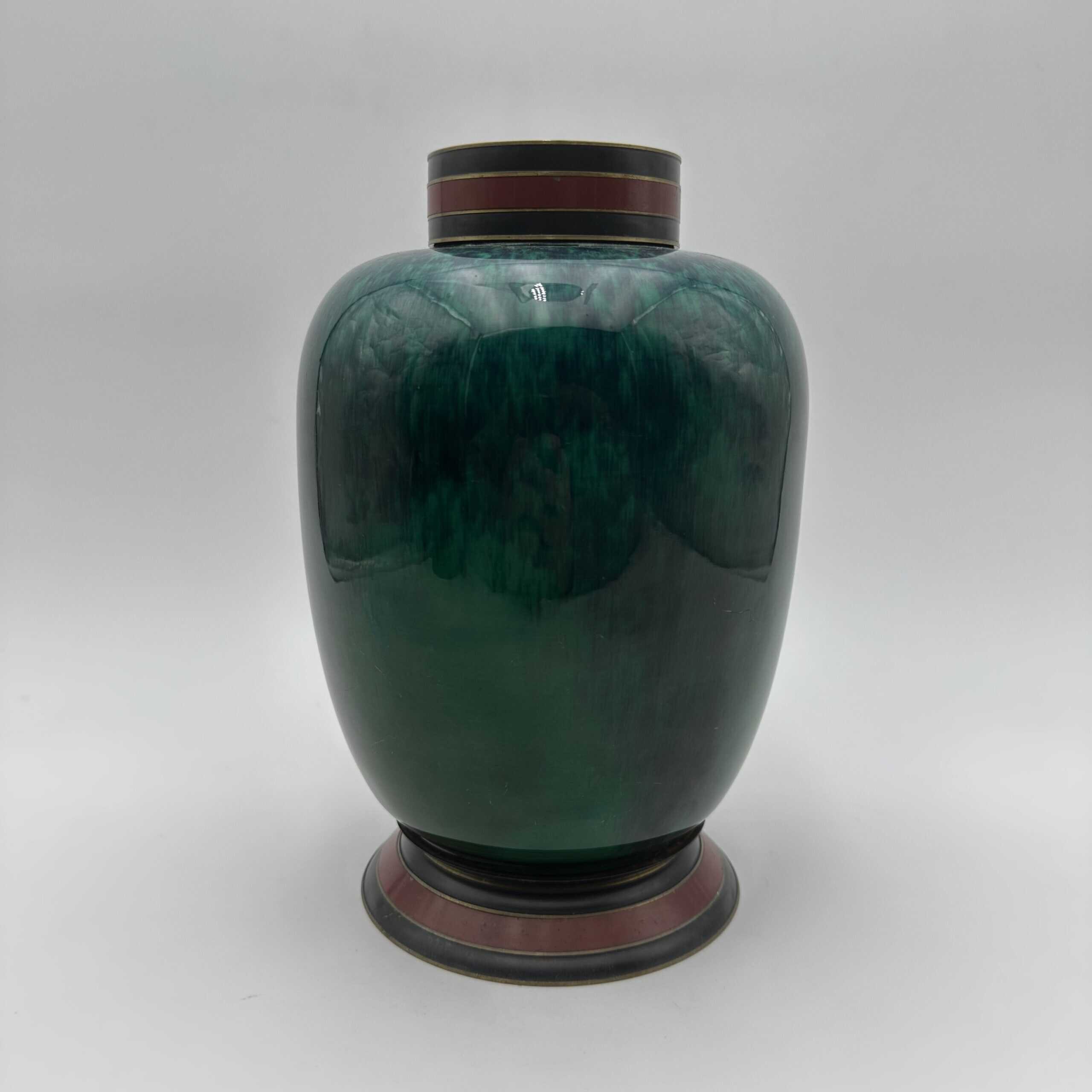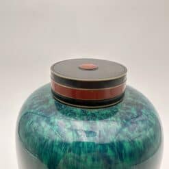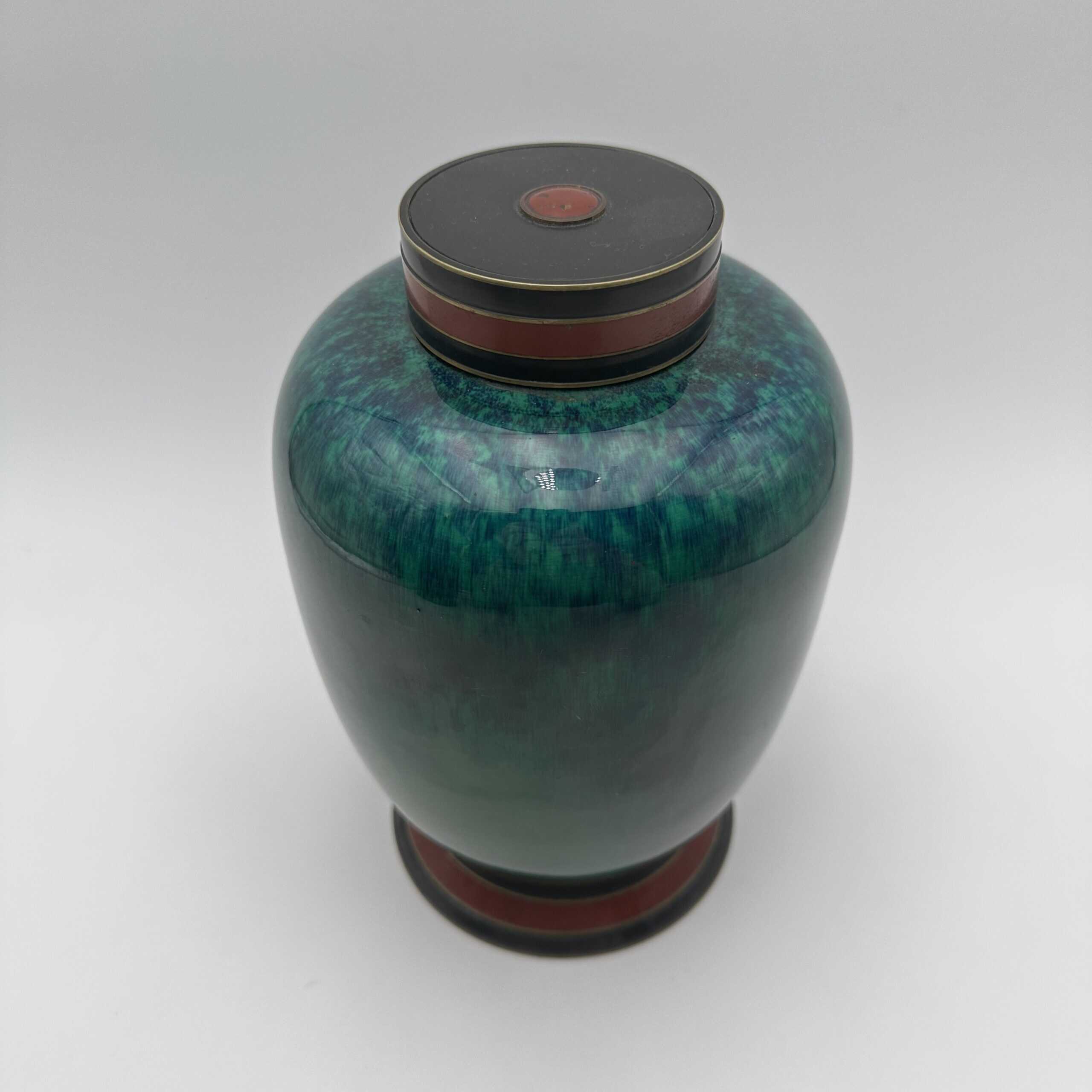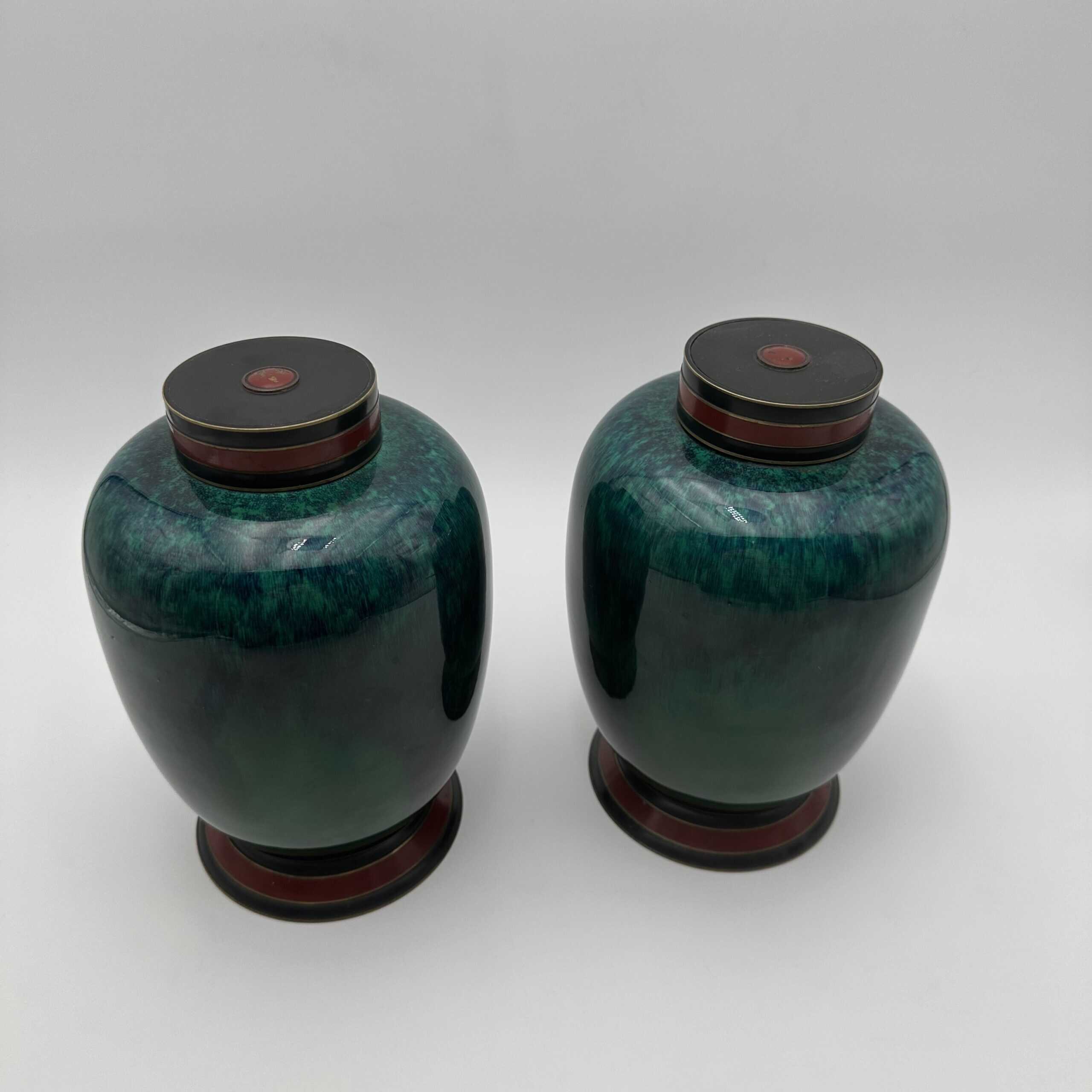 The bases and lids display geometric bands in dark red, black, and fine gold-toned lines. This interplay between fluid glaze and strict geometry defines Art Deco style. These vases showcase both technical mastery and bold design. Each vase presents balanced proportions and a strong decorative presence. These pieces enhance a mantel, console, or sideboard with vibrant color and refined elegance.