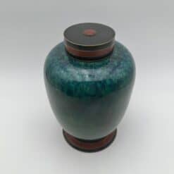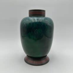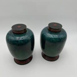 This pair of Sèvres Porcelain Covered Vases reflects the elegance of French porcelain from the 1920s and 1930s. The design draws inspiration from the innovations of the Sèvres Manufactory and the Exposition Internationale des Arts Décoratifs et Industriels Modernes. These vases feature an ovoid body with a rich emerald green flammé glaze. The surface shows subtle drips and tonal variations that catch the light. This organic finish contrasts with the structured base and lid.