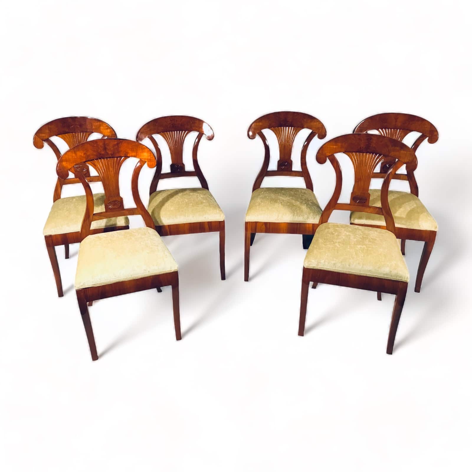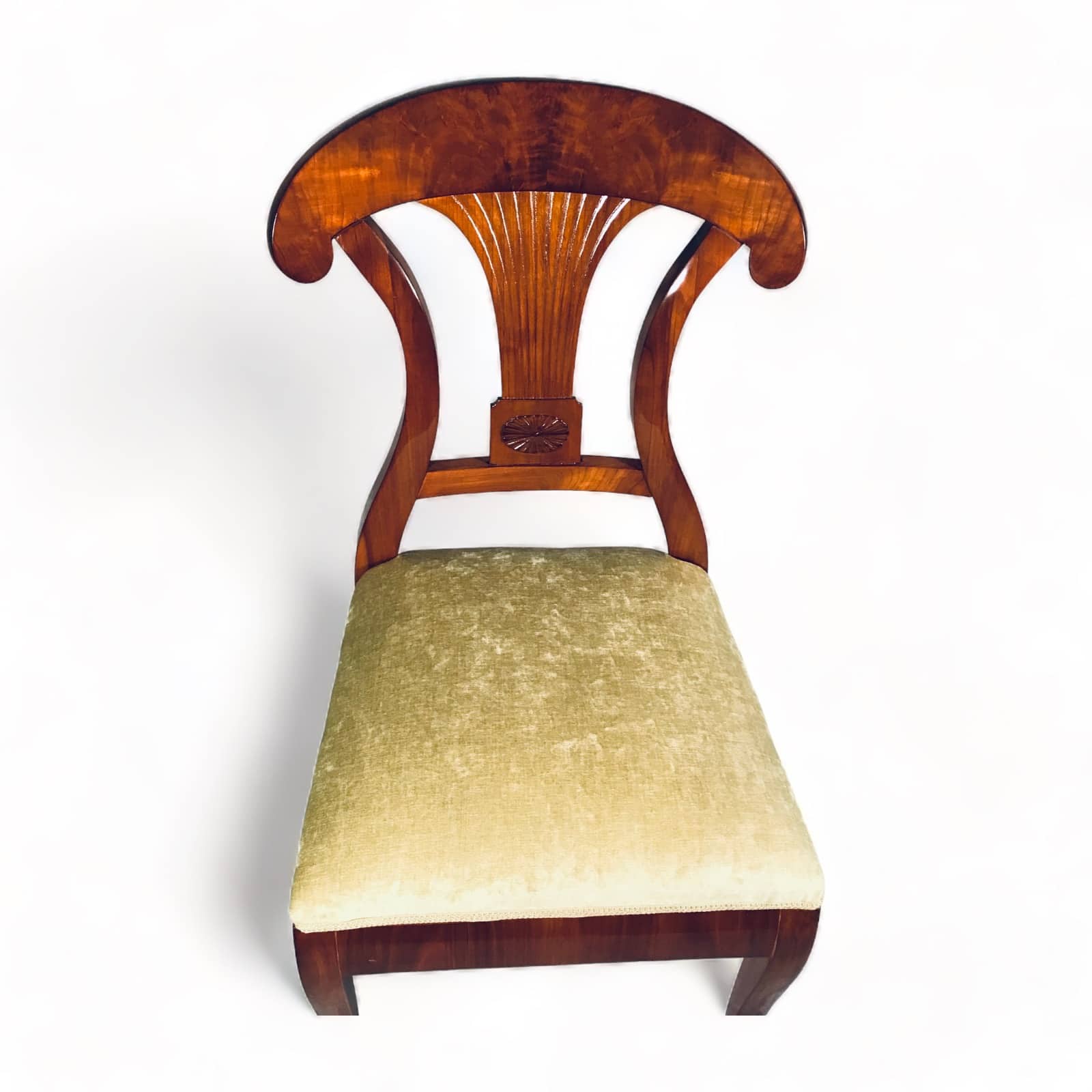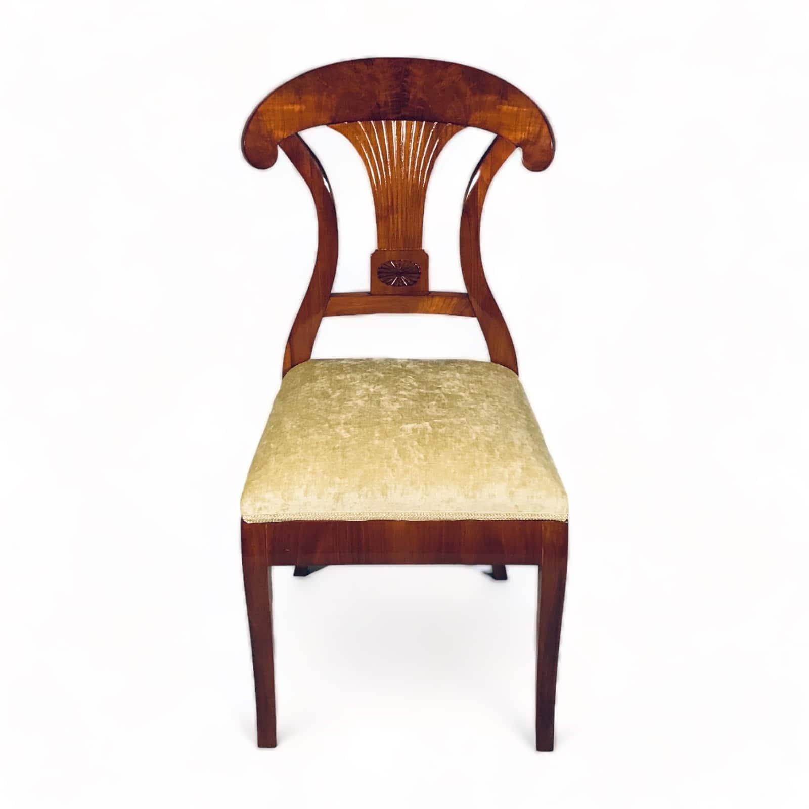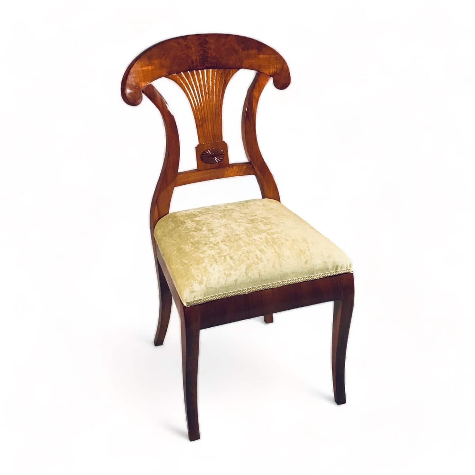 This elegant set of six Biedermeier chairs comes from Southern Germany and dates back to around 1820. The walnut chairs stand out for their exquisite back design, a combination of a shovel back design with a beautifully shaped fan decor in the center. The chairs showcase slightly curved tapered legs. They come exquisitely refinished with a shellac hand polish and a new upholstery and fabric. Overall, a wonderful example of Biedermeier furniture that is ready for your home today.