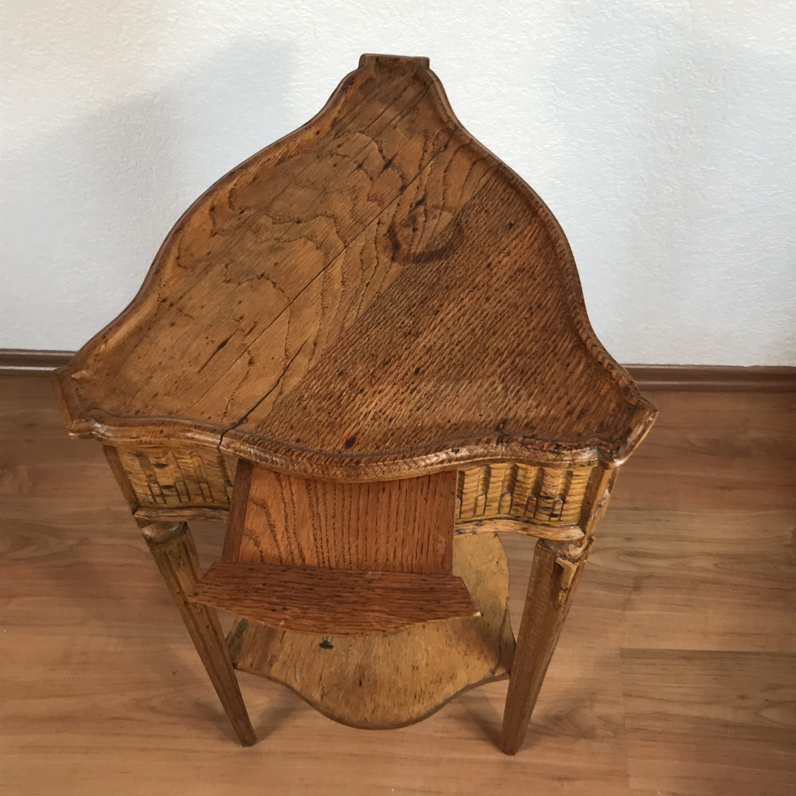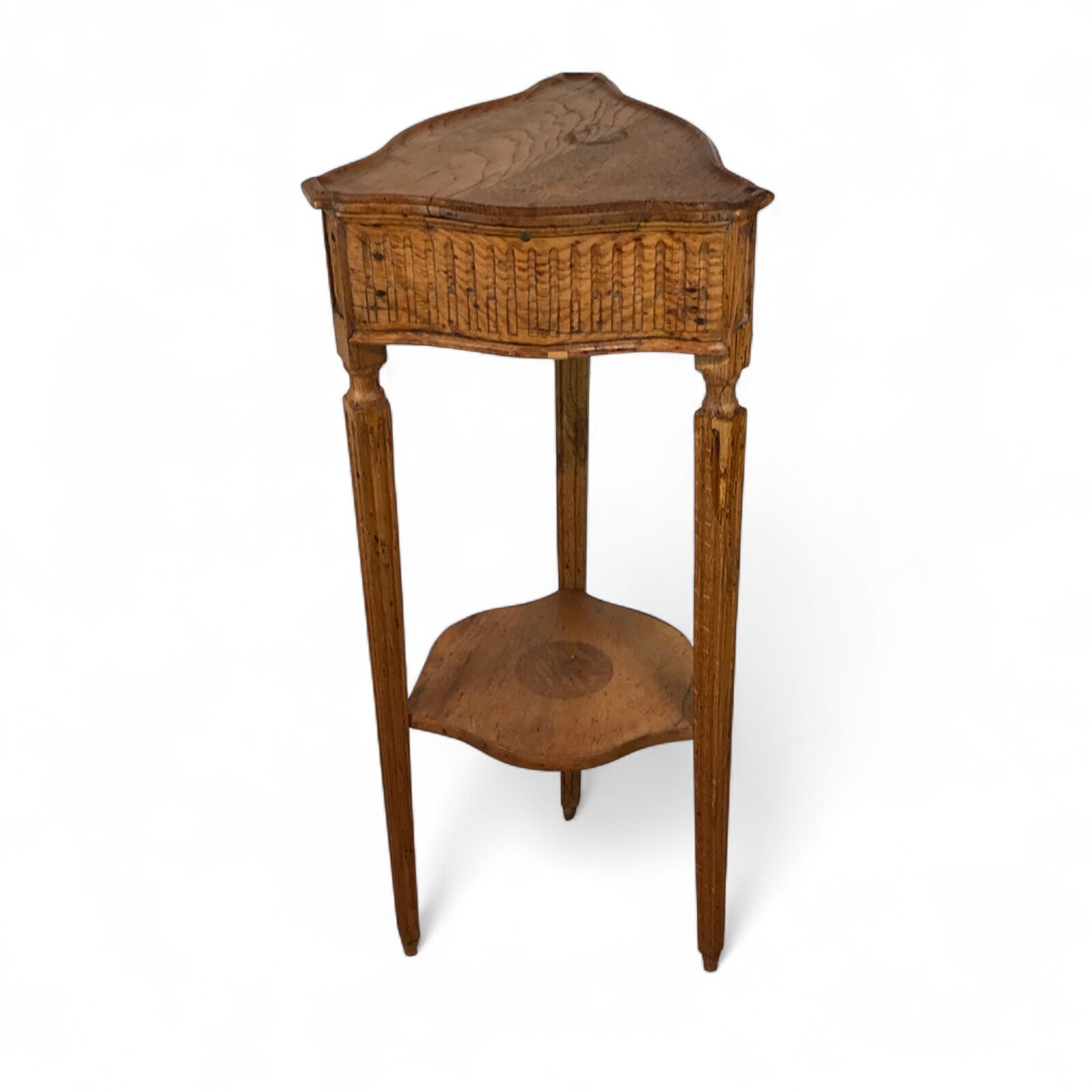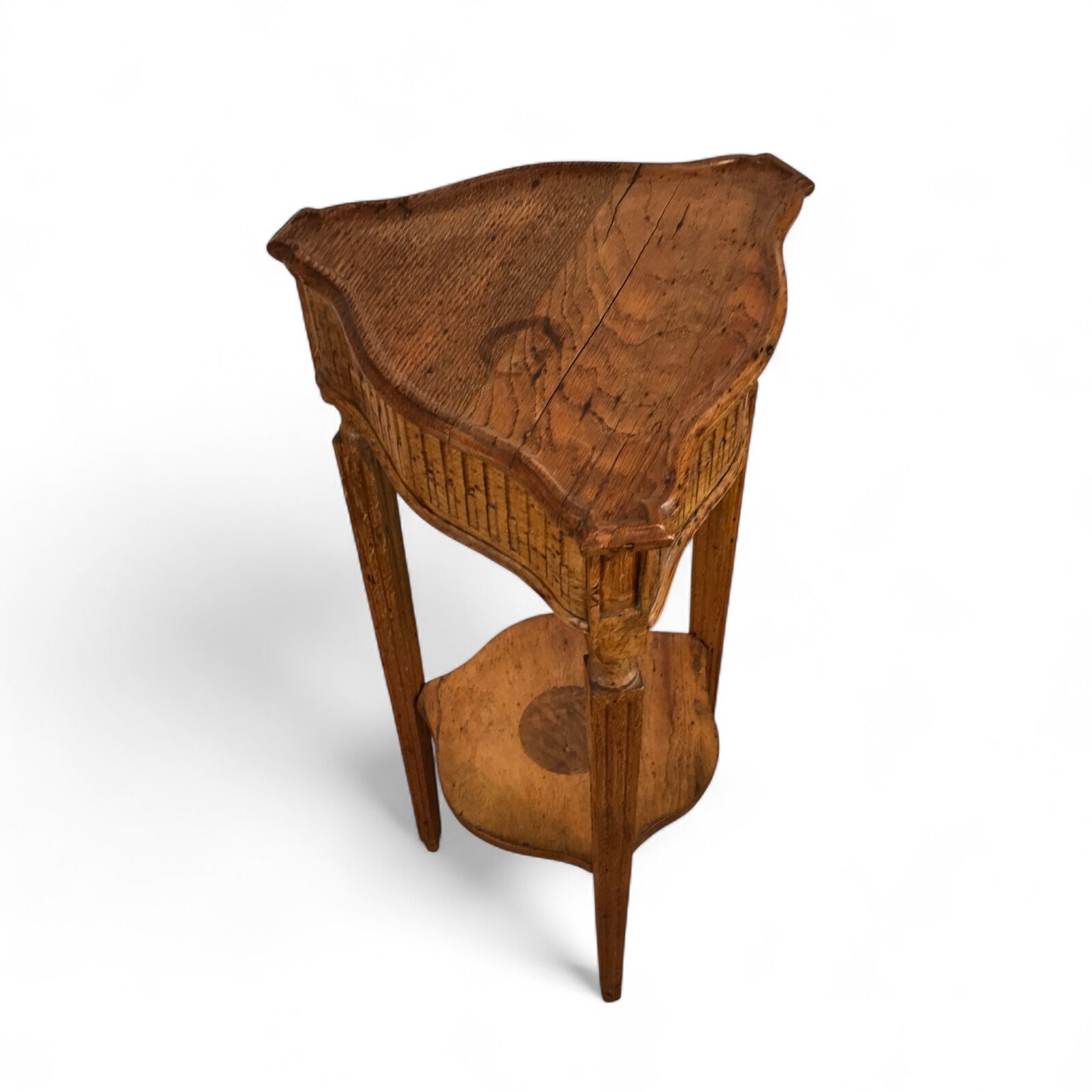 This charming small Louis XVI side table from around 1780 features an unusual triangular shape that makes it both distinctive and versatile. The table stands on three slender, fluted legs connected by a lower shelf, and the apron displays fine carved oak fluted decor characteristic of the late 18th century.