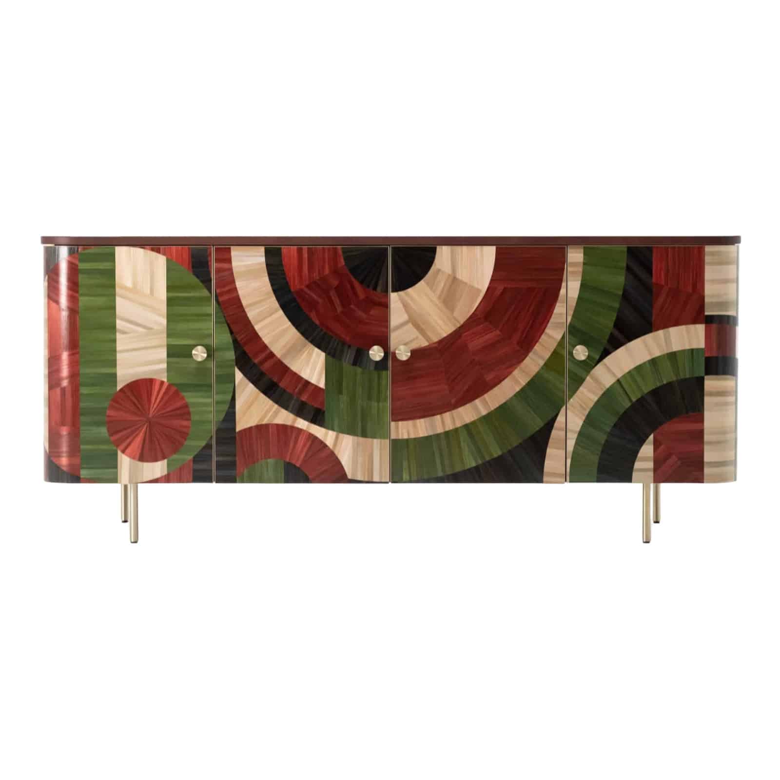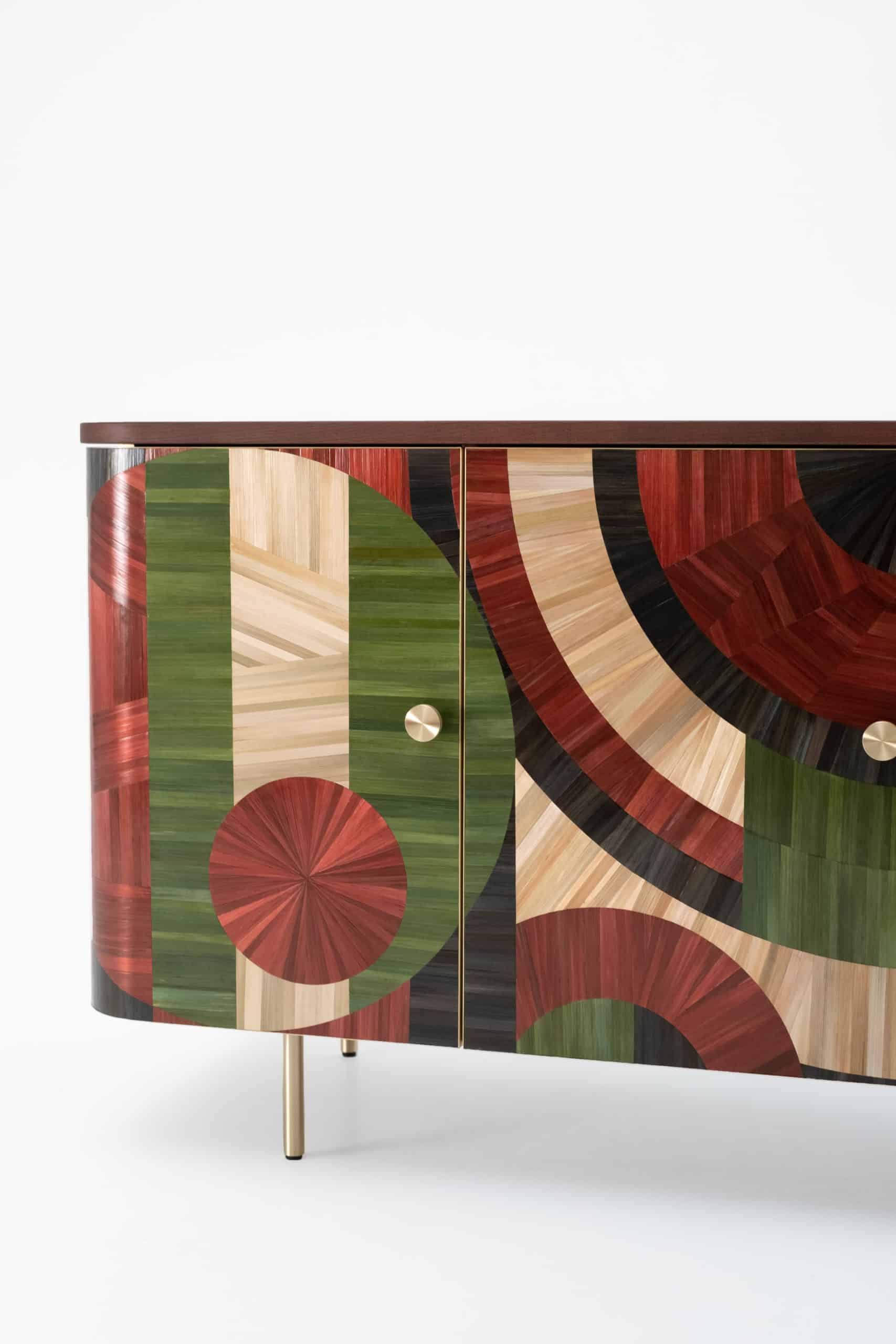 The Solomia straw marquetry credenza with its colorful straw marquetry can become an emphasis of the minimalistic interior or centerpiece of the eclectic one.