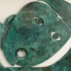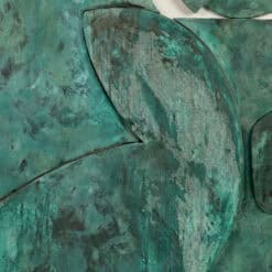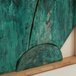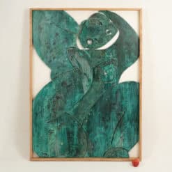 The “Sortez du cadre!” Bas-relief captures dynamic contemporary French artistry. This work, titled Step Outside the Box, reflects innovative carving and material use. Carved from wood, the bas-relief features a green copper patina that emphasizes depth and texture. The piece comes mounted in a natural blond oak box frame.