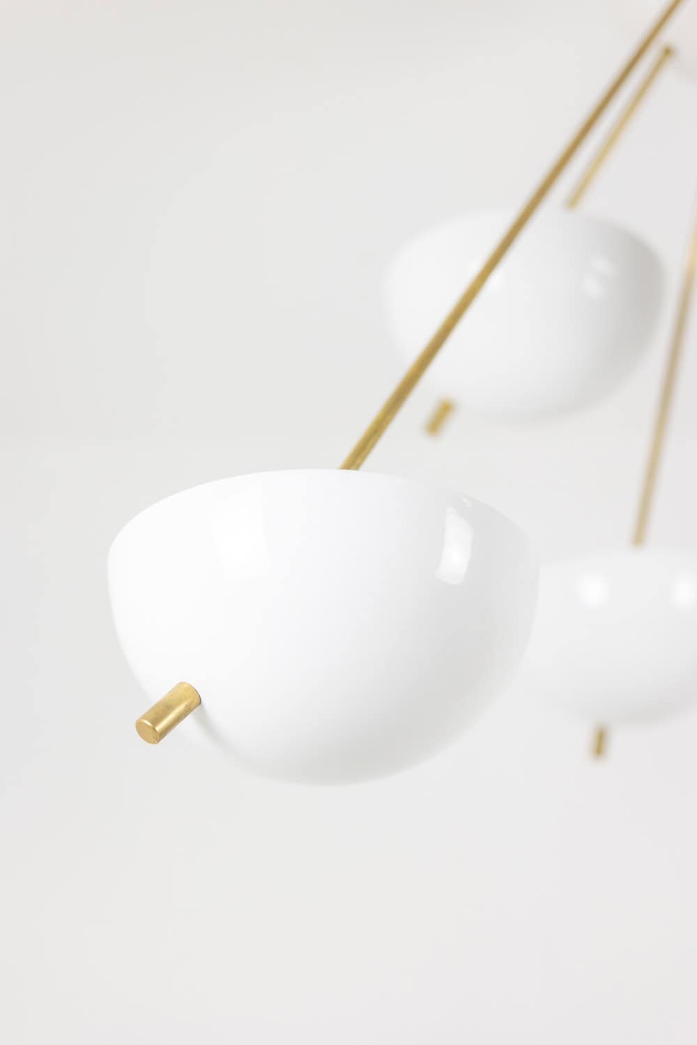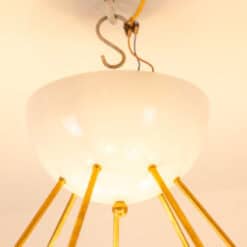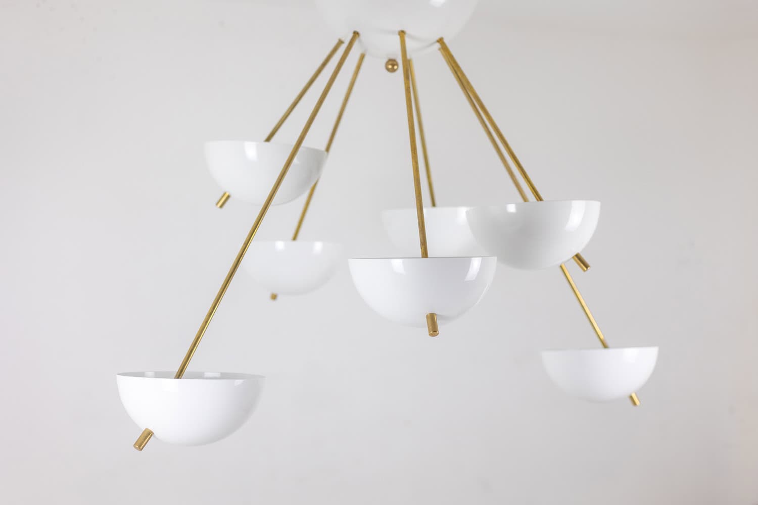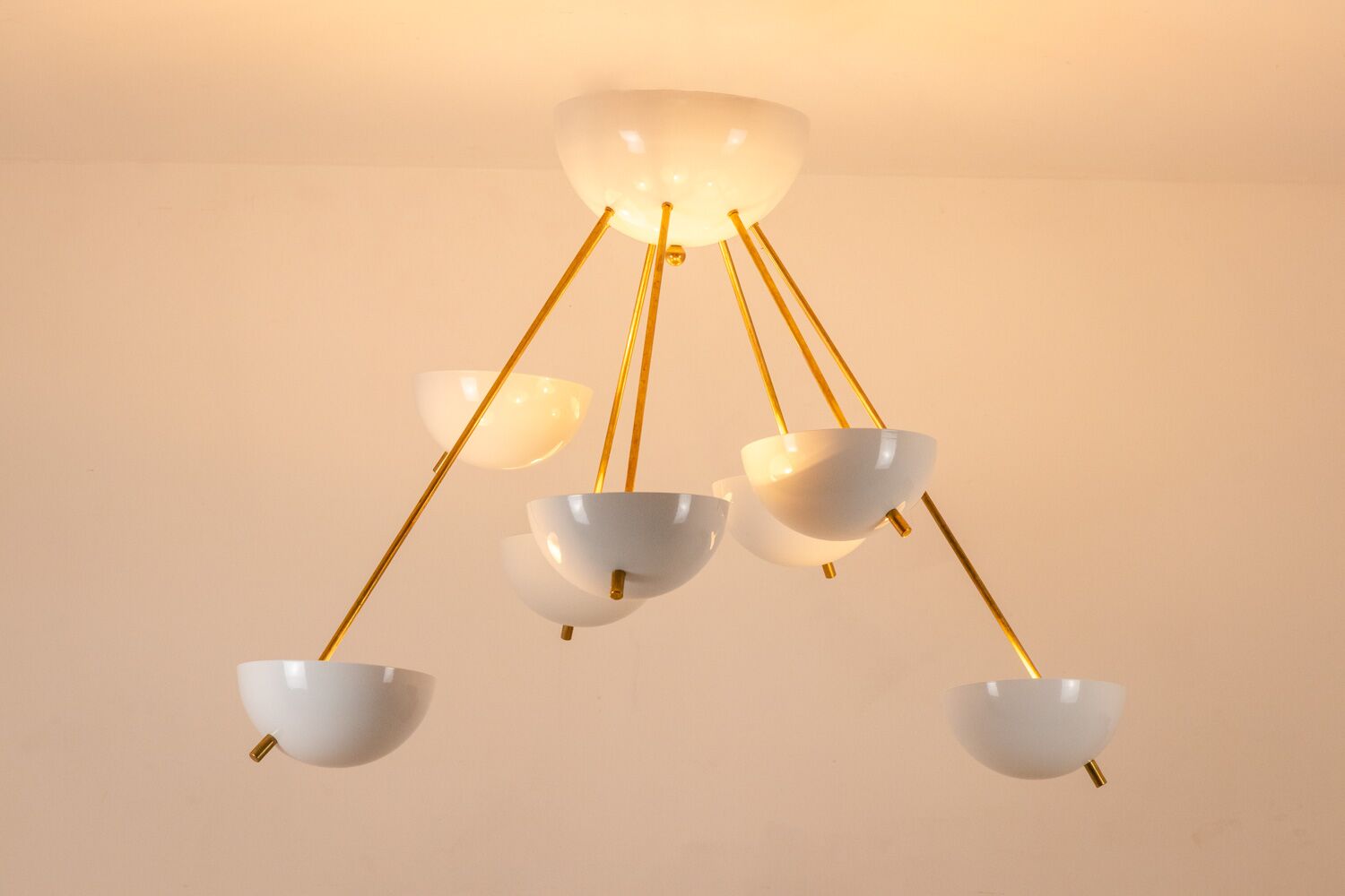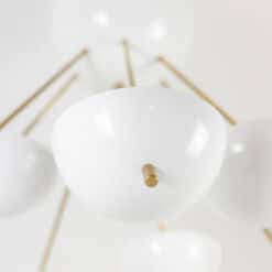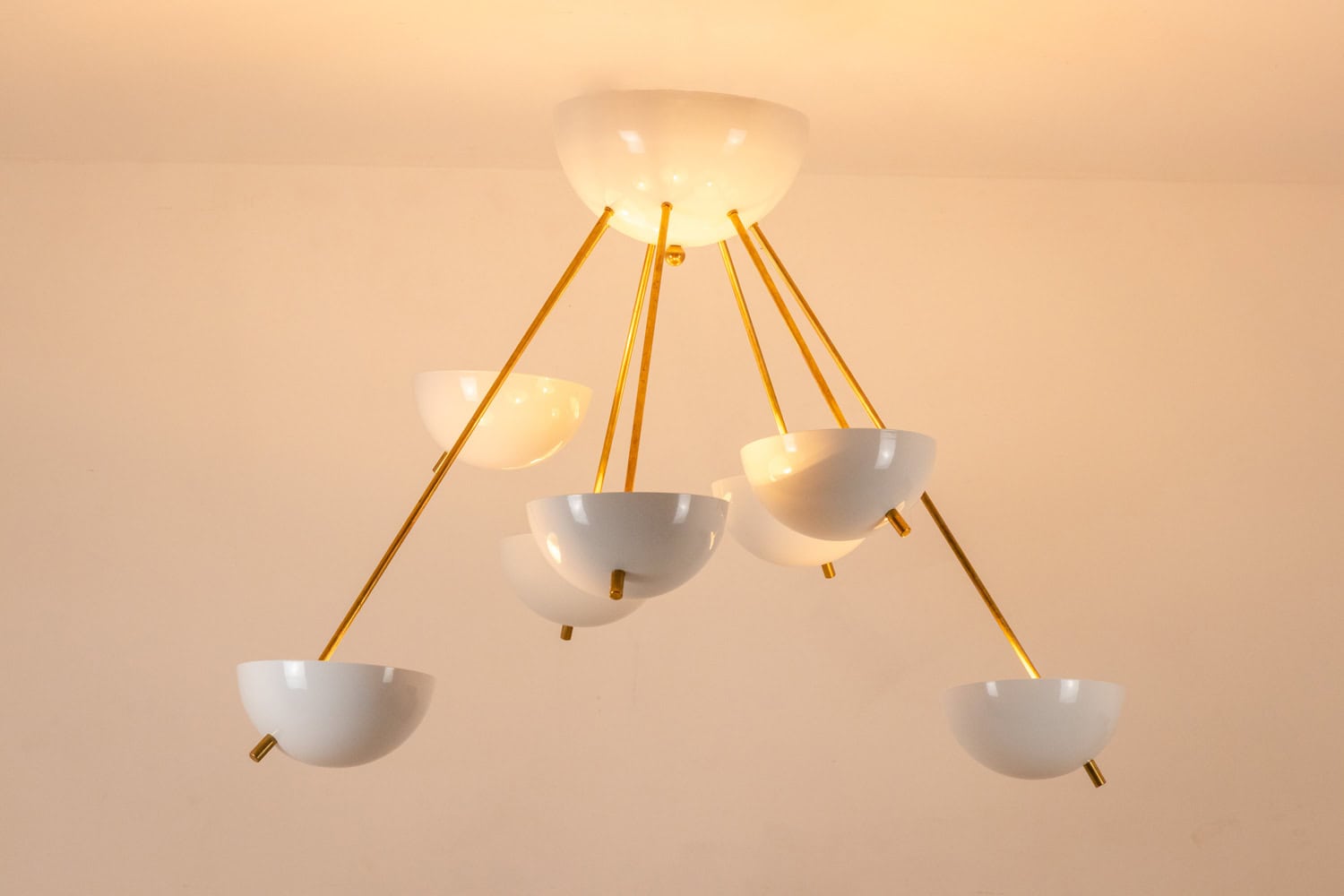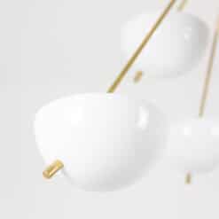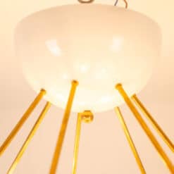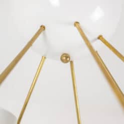Italian artisans crafted this Stilnovo piece in gilded brass and white lacquered metal. The white cups create crisp contrast against the warm brass structure. The balanced proportions deliver elegance and modern presence.