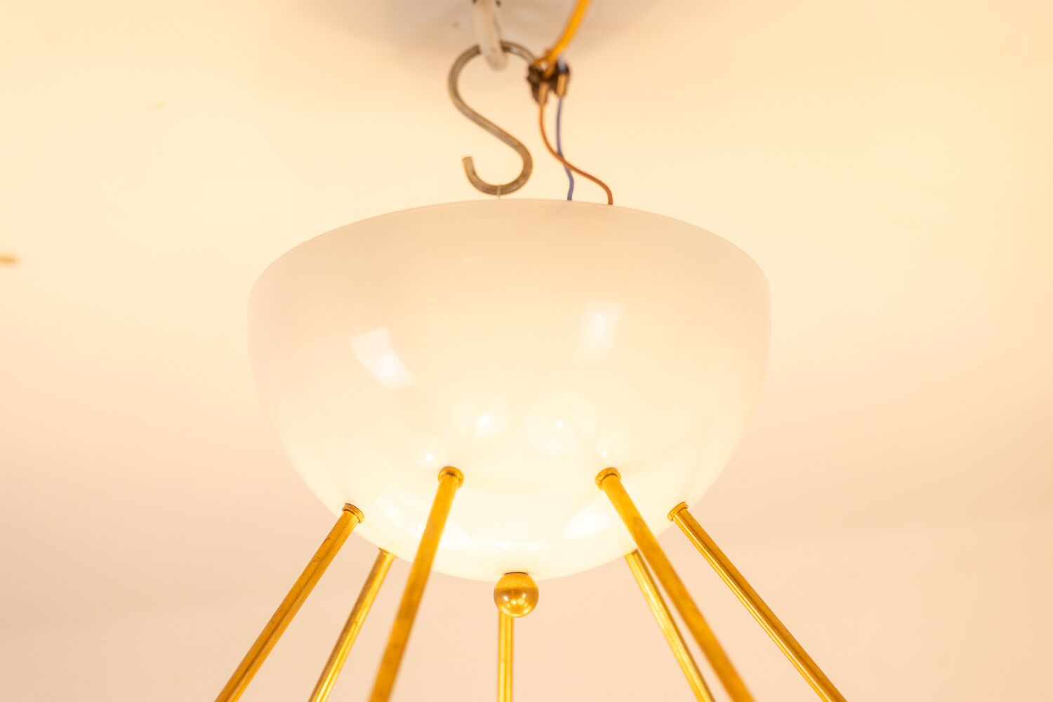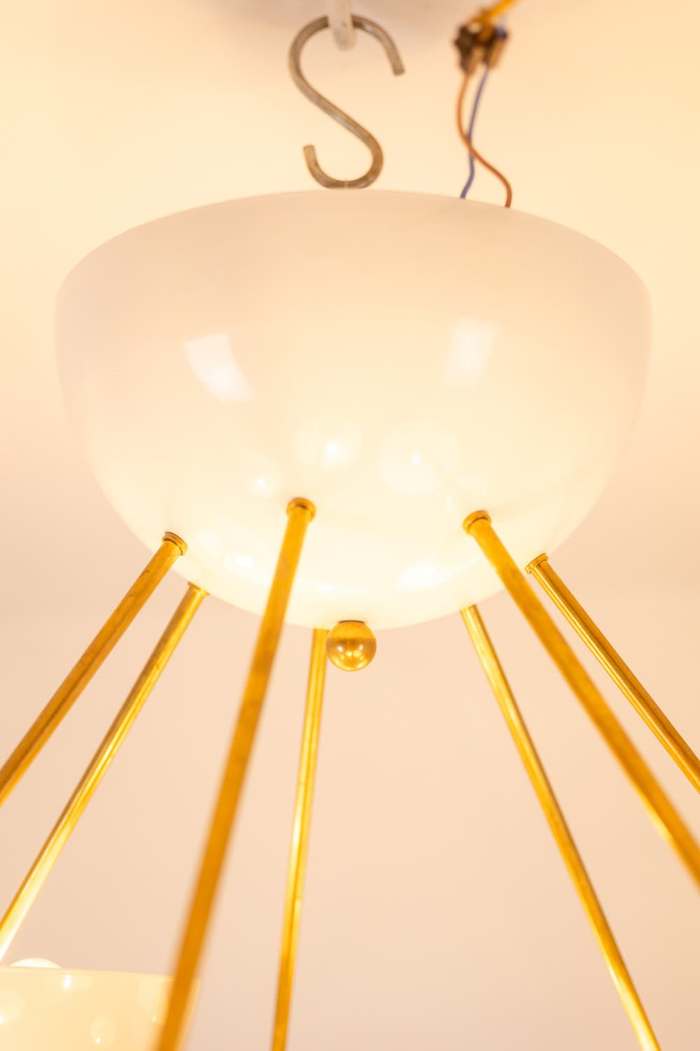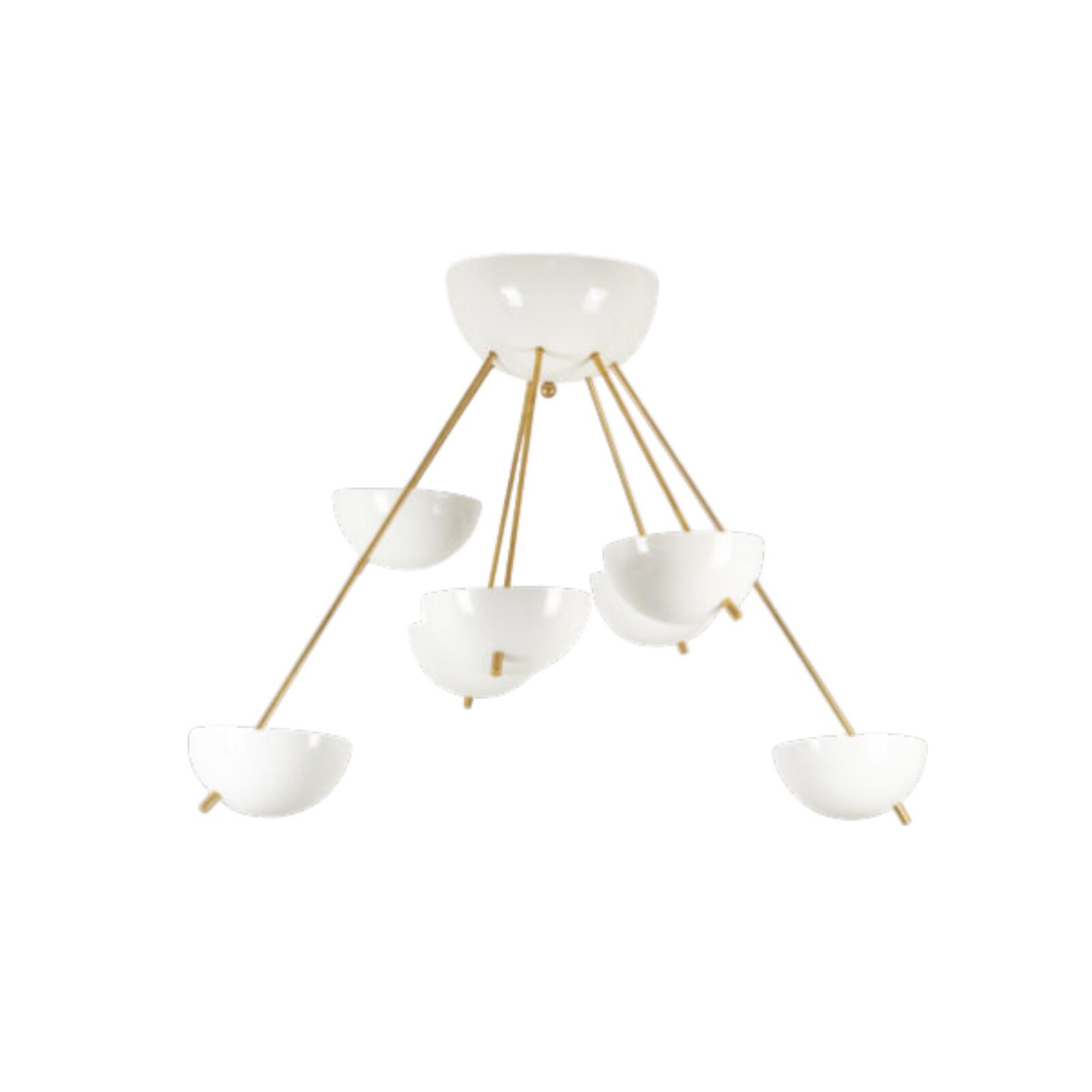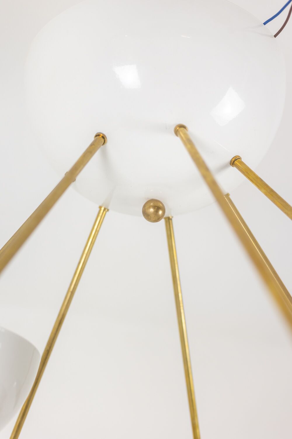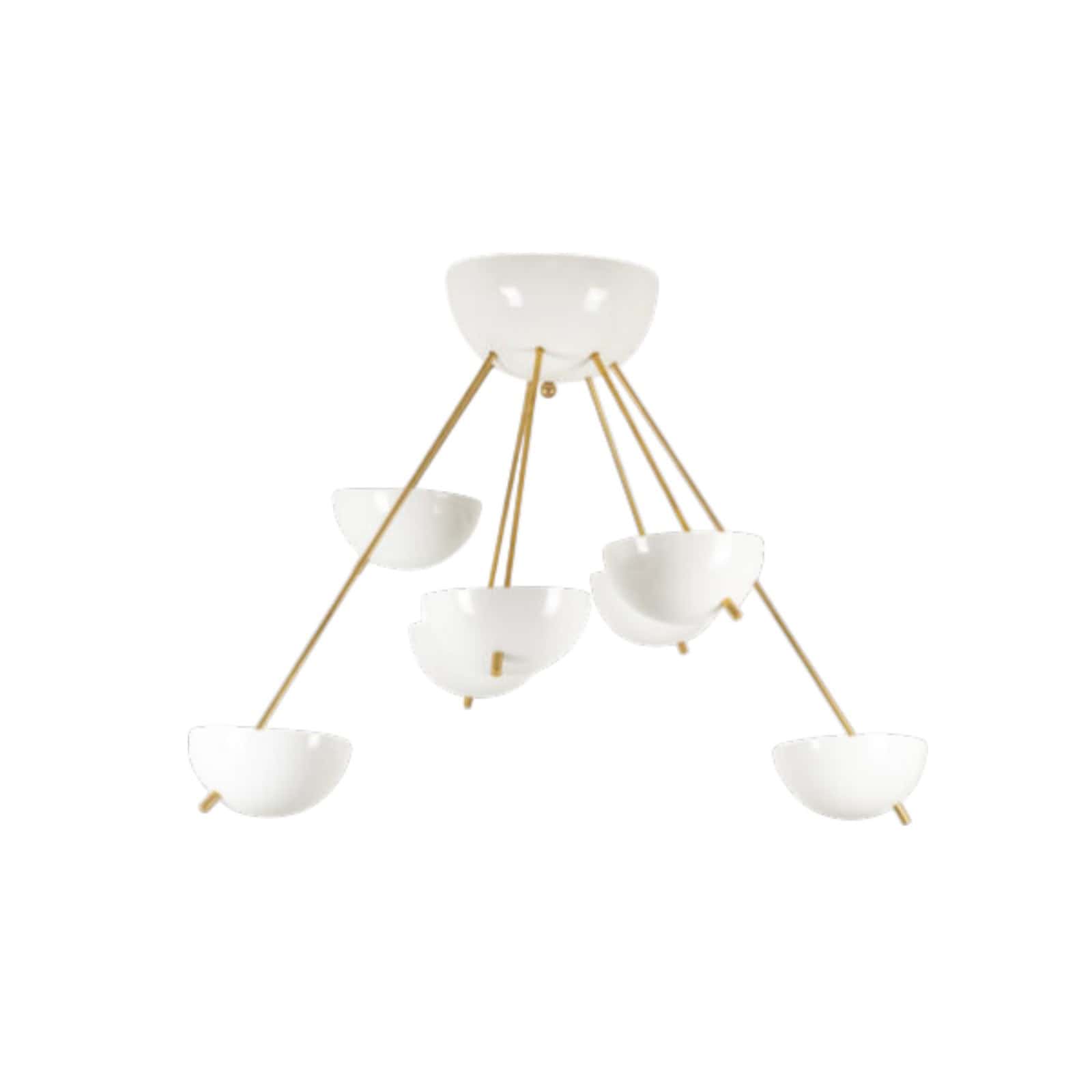 Italian artisans crafted this Stilnovo piece in gilded brass and white lacquered metal. The white cups create crisp contrast against the warm brass structure. The balanced proportions deliver elegance and modern presence.