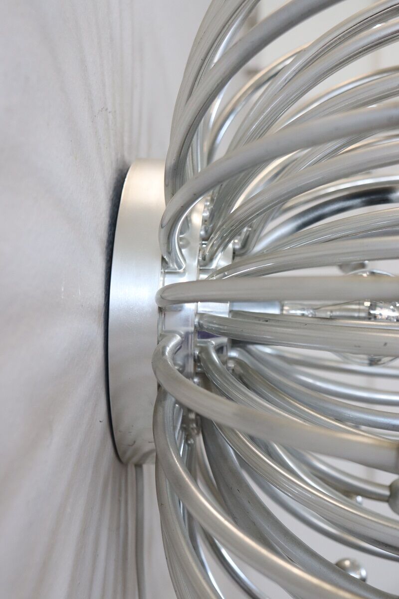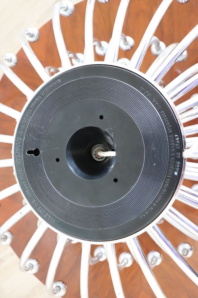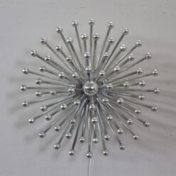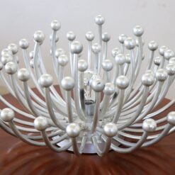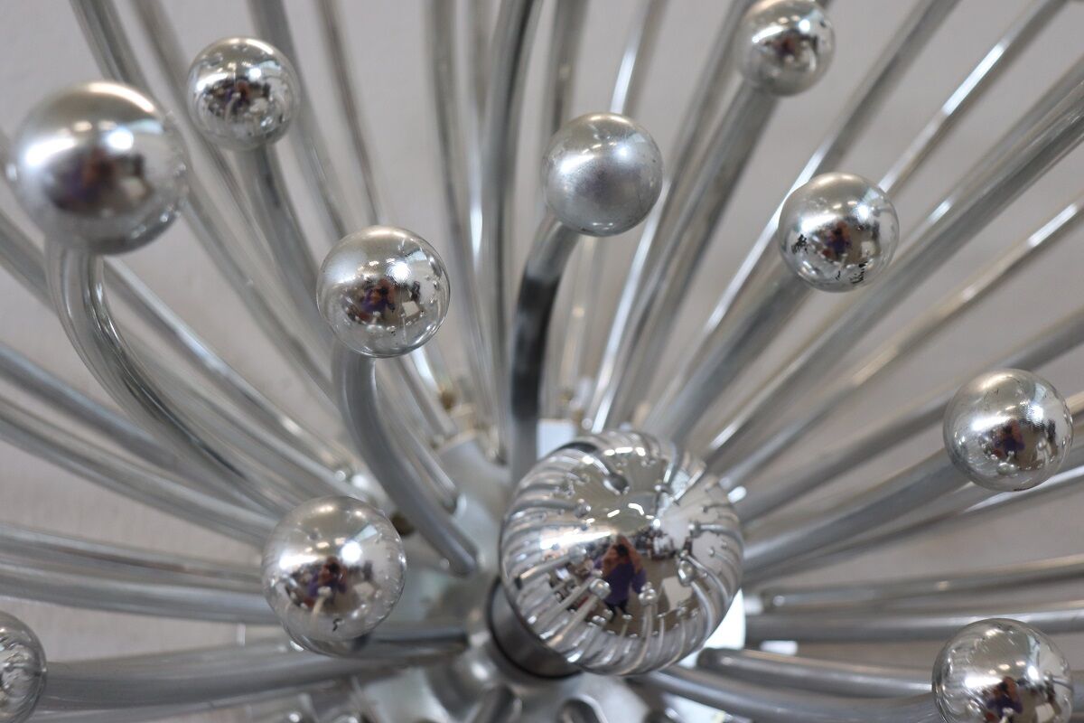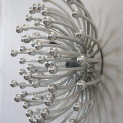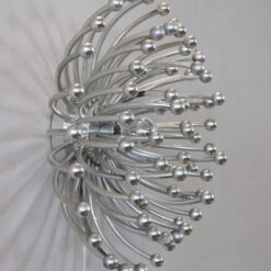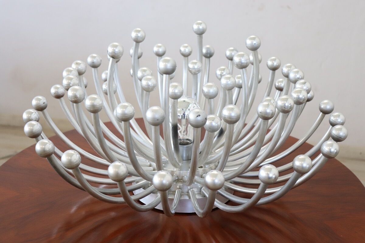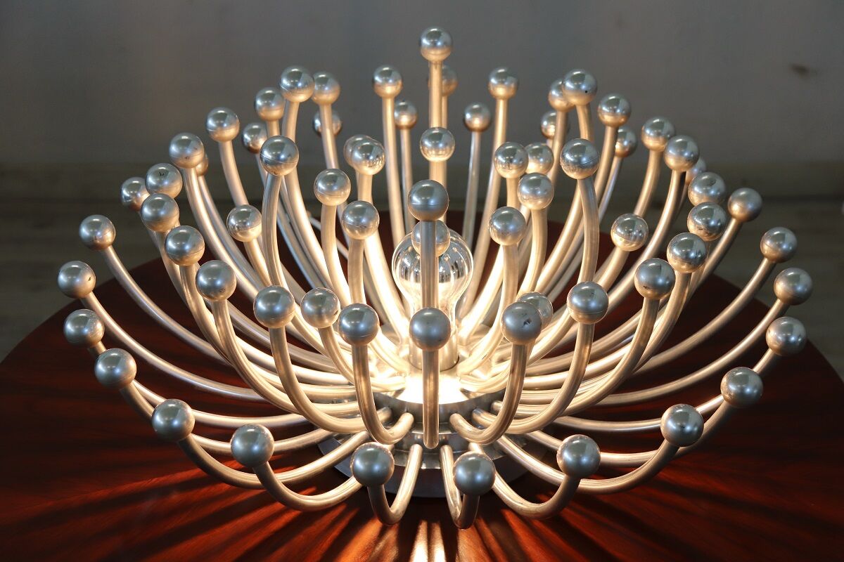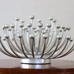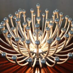 The futuristic form blends plastic and chrome to create strong visual impact. The design takes inspiration from a flower pistil and expresses the era’s passion for organic geometry. A central bulb illuminates the chrome pistils and creates an impressive light effect.