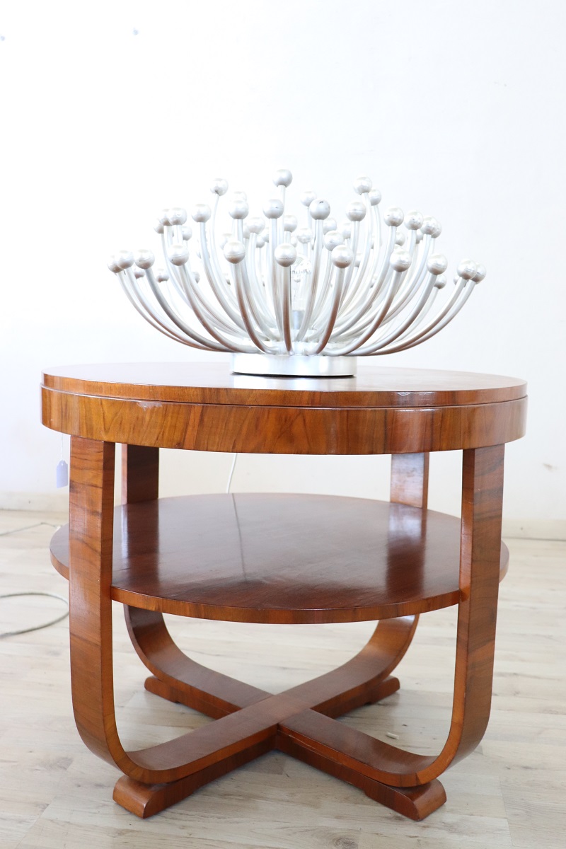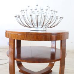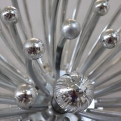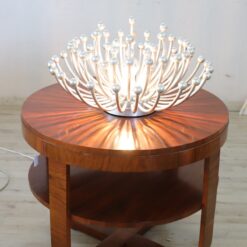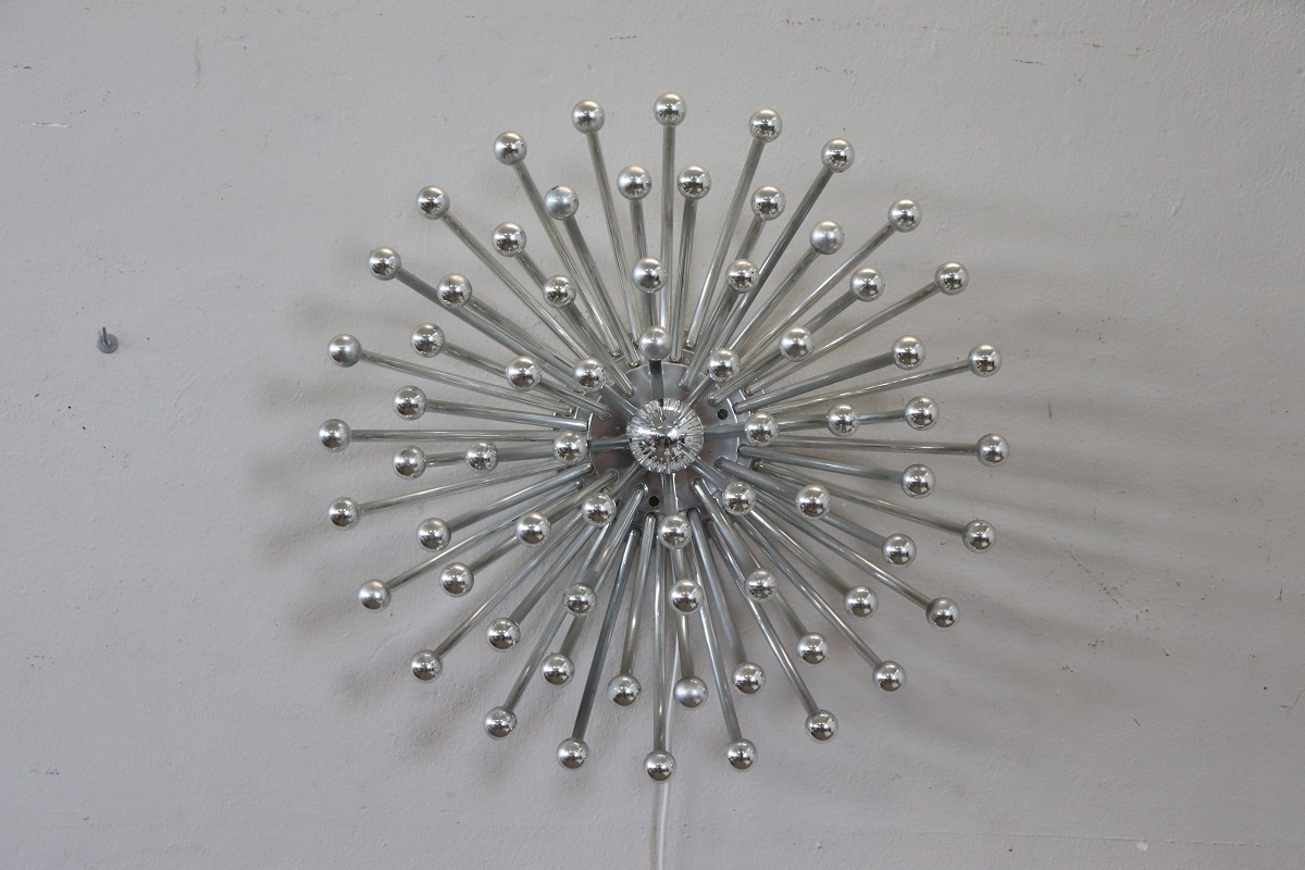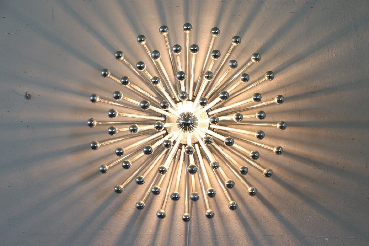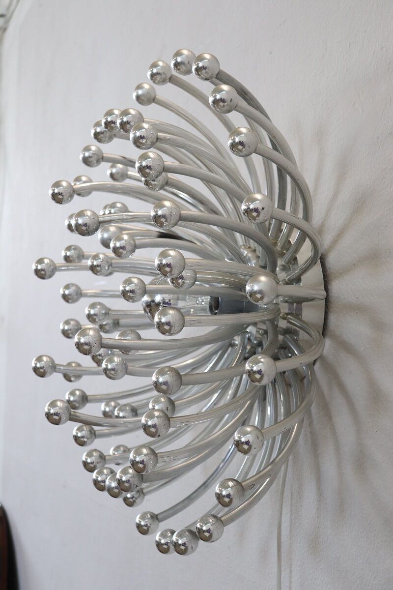 The futuristic form blends plastic and chrome to create strong visual impact. The design takes inspiration from a flower pistil and expresses the era’s passion for organic geometry. A central bulb illuminates the chrome pistils and creates an impressive light effect.