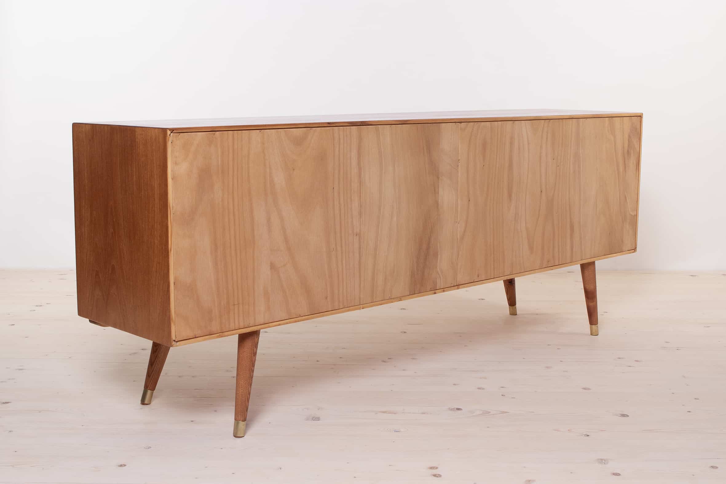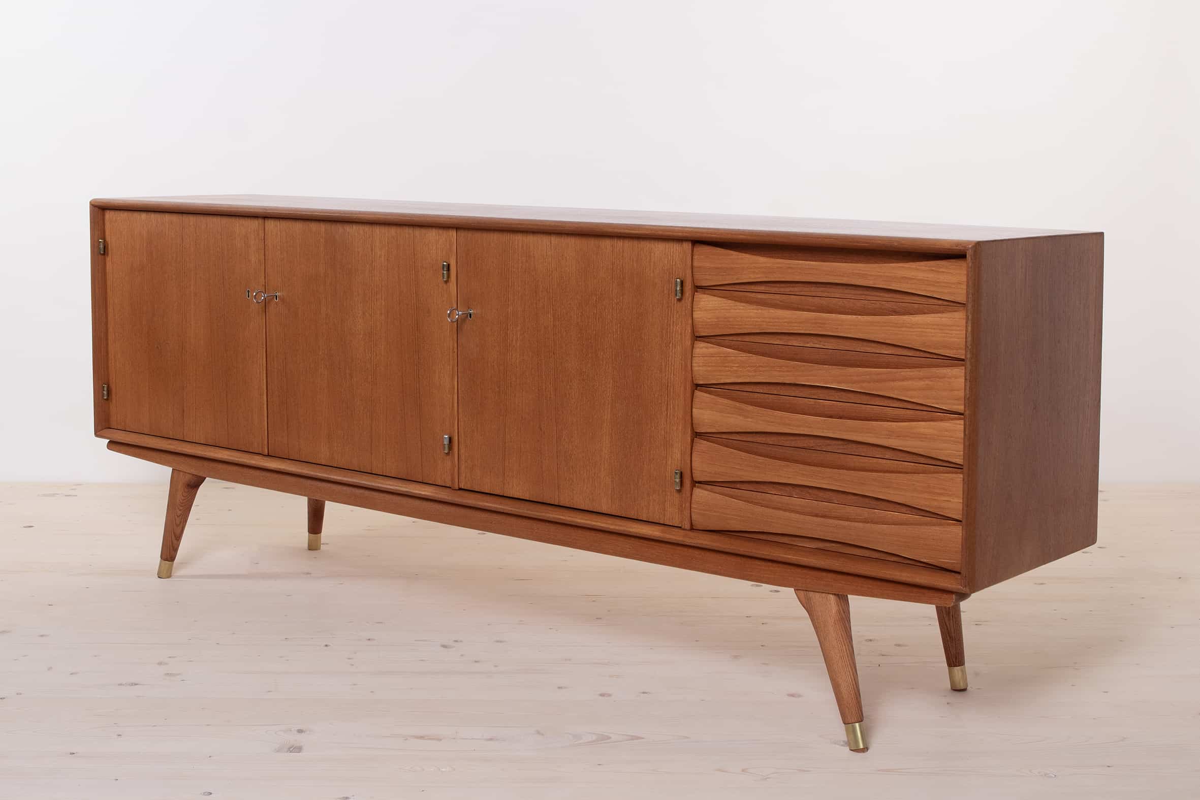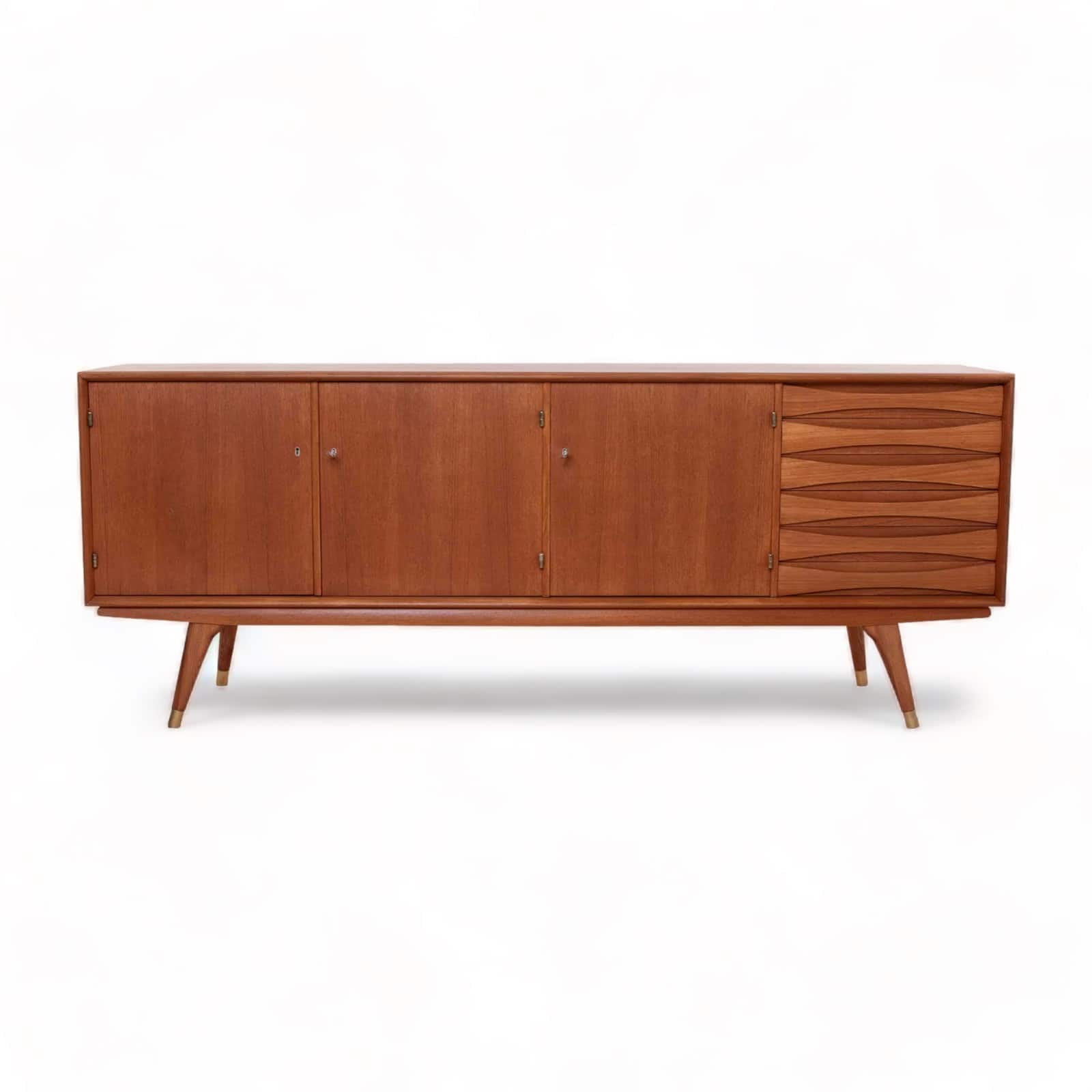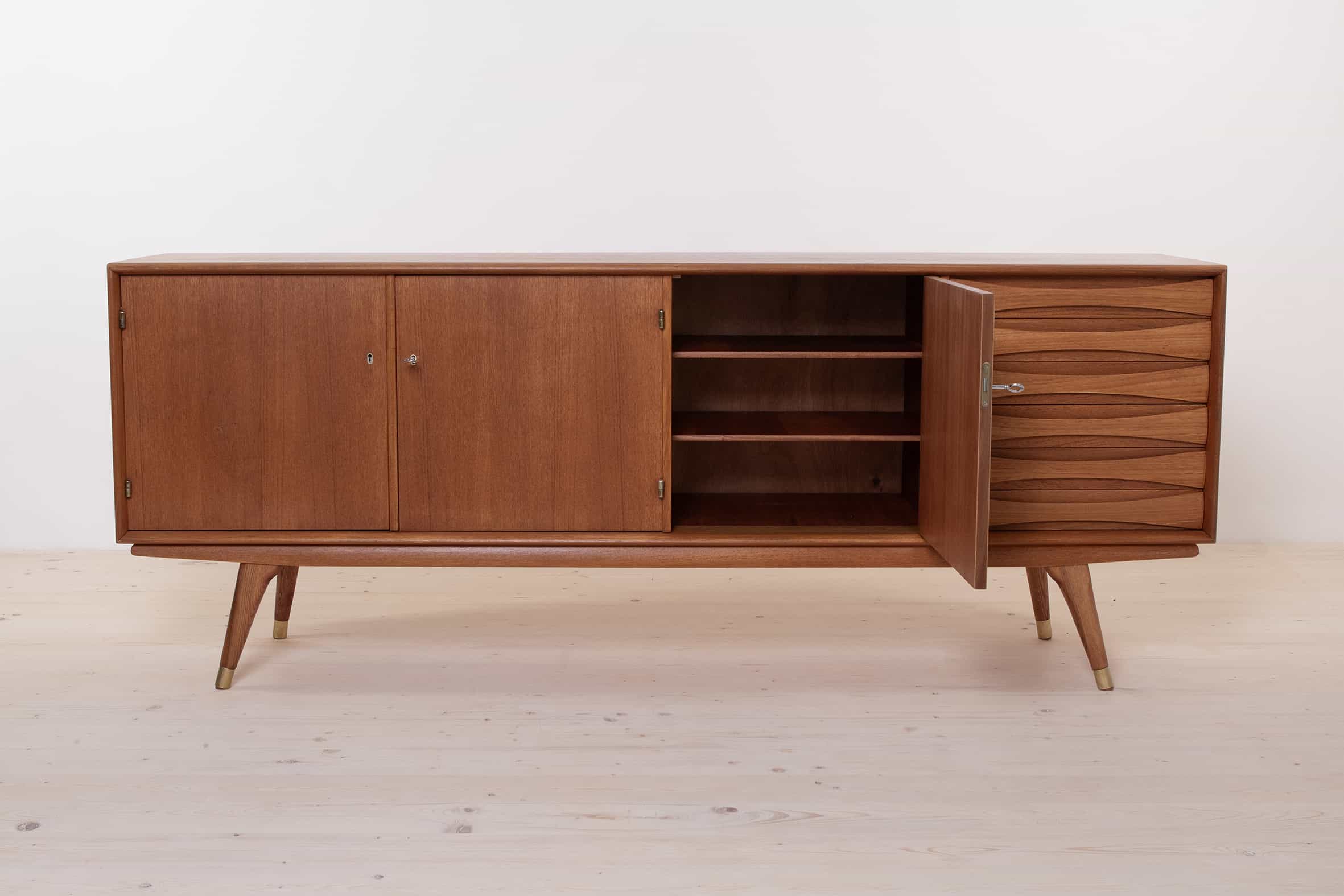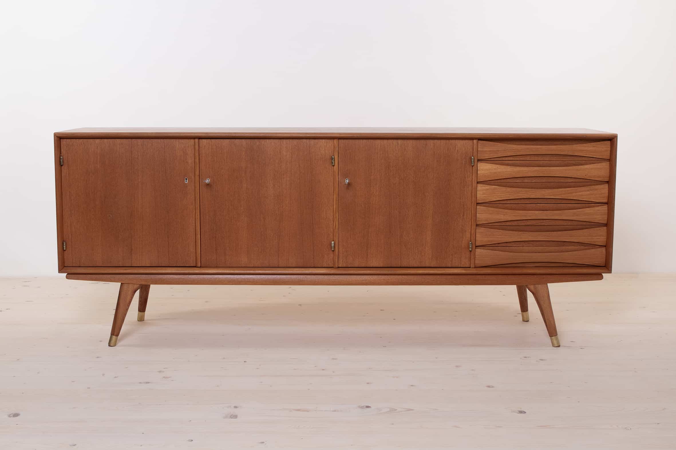 The sideboard boasts three elegantly designed doors that open up to reveal an ample storage space. On the right-hand side, it offers six drawers for your organizational needs. The teak frame of the sideboard exudes timeless beauty and is complemented by all four legs finished in brass, adding a touch of sophistication to its overall design.