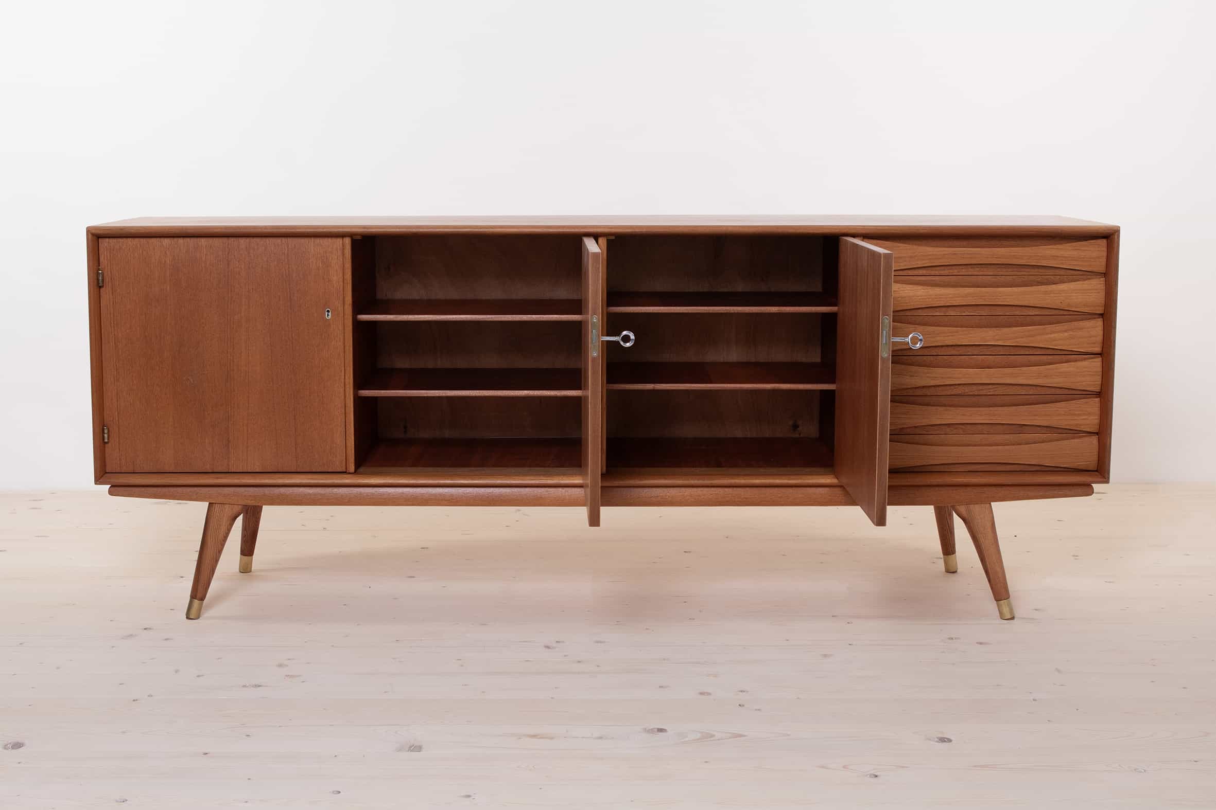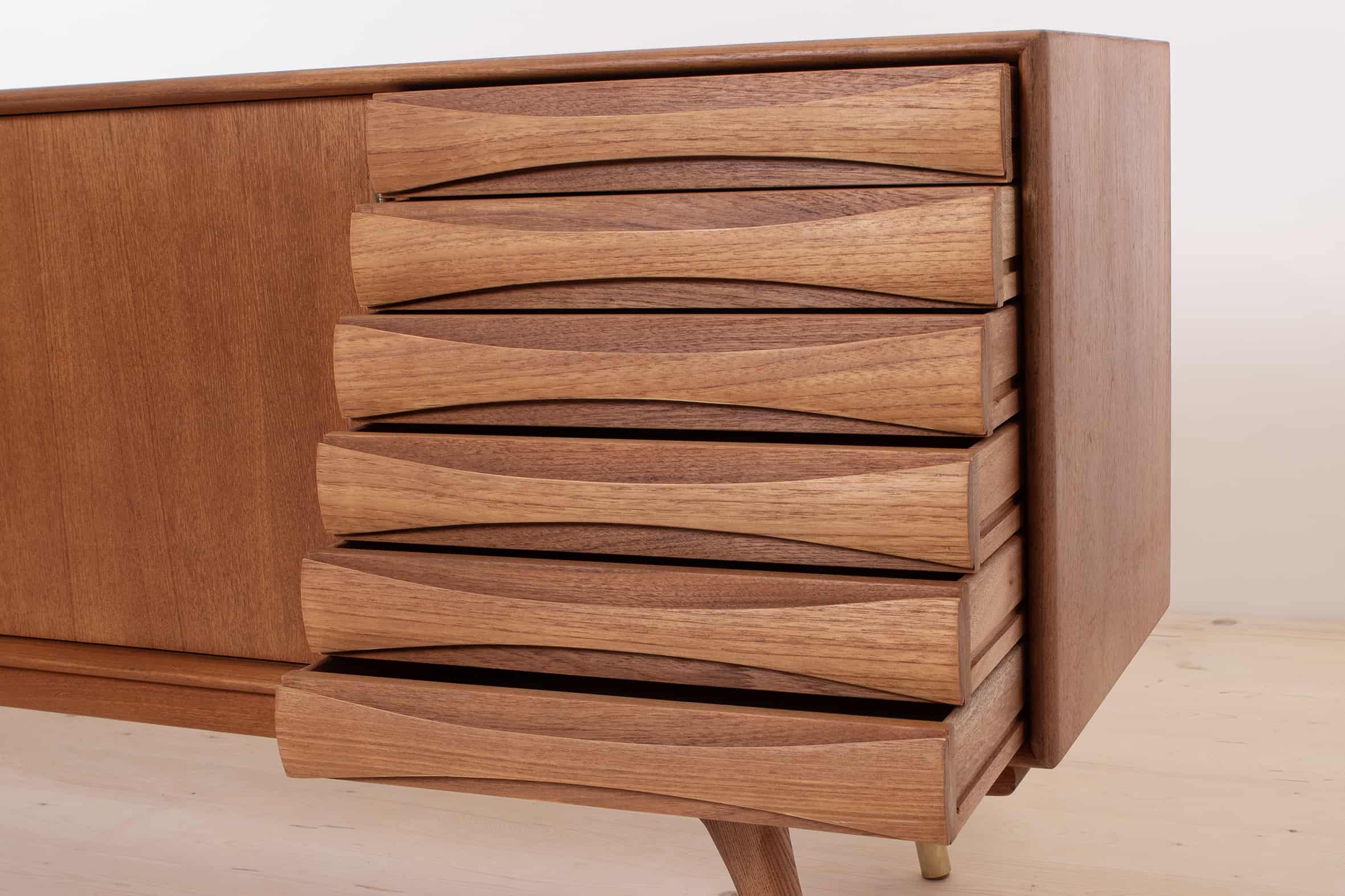 After a subtle yet meticulous renovation, this sideboard has been lovingly finished with natural oil. This finishing process not only preserves the integrity of the teak wood but also brings out its warm and enchanting natural color. The result is a truly gorgeous piece of furniture that is not only a work of art but also completely ready for everyday use.