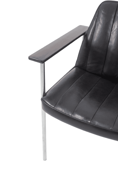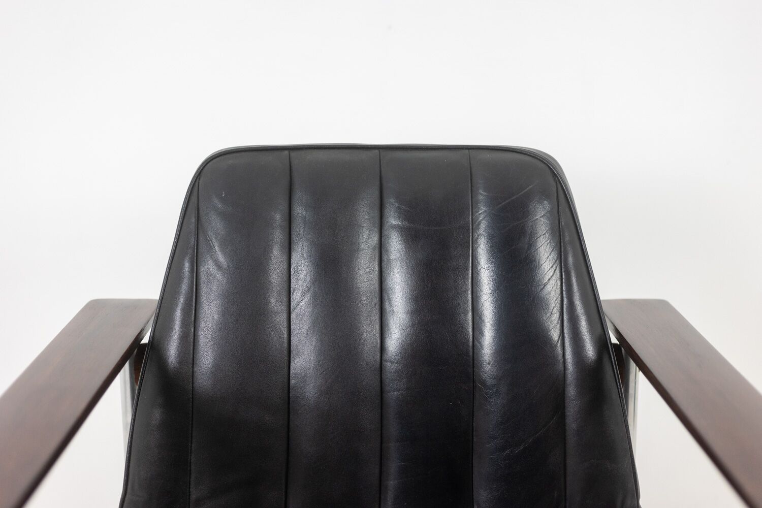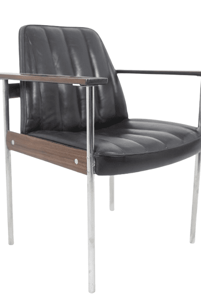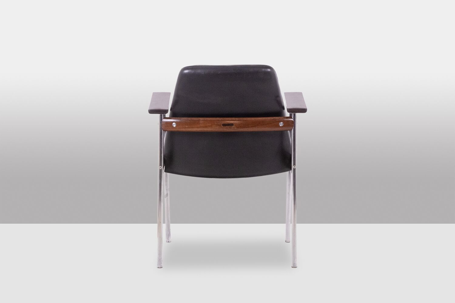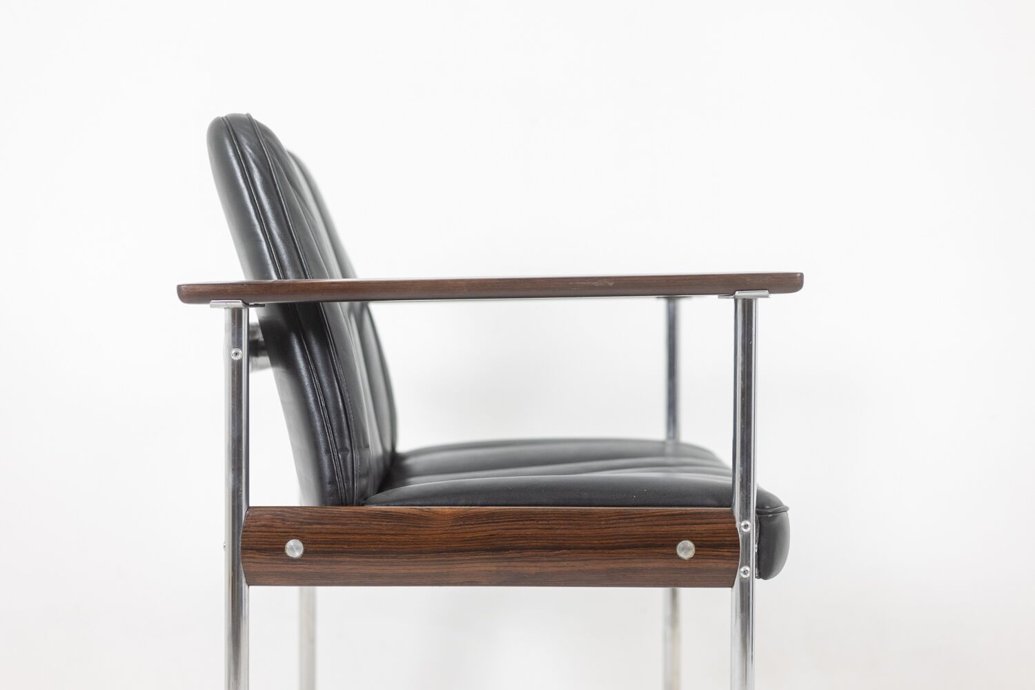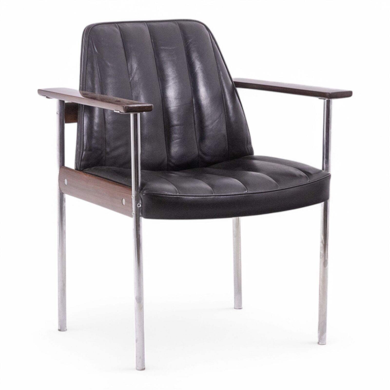 Sven Ivar Dysthe for Dokka Armchair showcases a blend of modern design and exquisite craftsmanship. This office chair features a chromed metal base, rosewood armrests, and a black leather seat and backrest. Its ergonomic design ensures comfort while its high-quality materials exude sophistication. The sleek chrome contrasts beautifully with the warmth of the rosewood, creating a harmonious and timeless aesthetic. Perfect for a home office or professional setting, this chair is a testament to mid-century Danish design excellence.