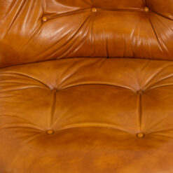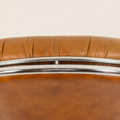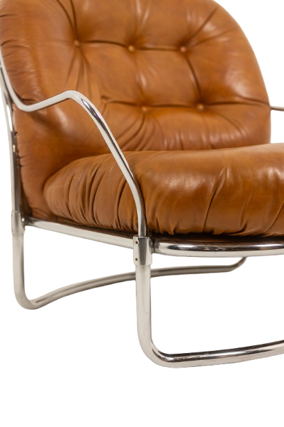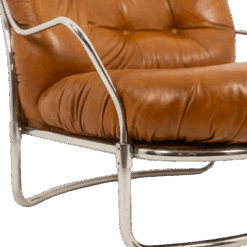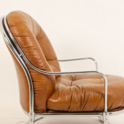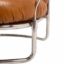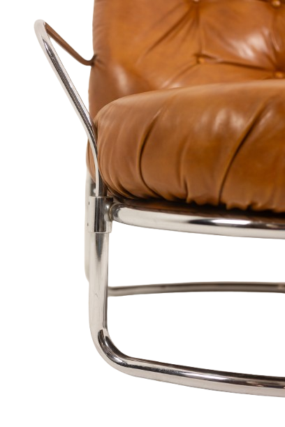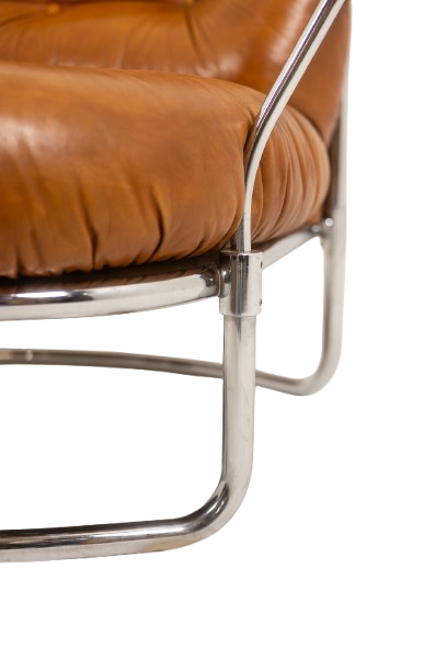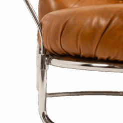 The generously proportioned seat is upholstered in tan leather with deep tufting, offering both comfort and sculptural presence. The design is complemented by a sleek chrome metal frame, creating a sophisticated contrast between warm leather and cool metal.