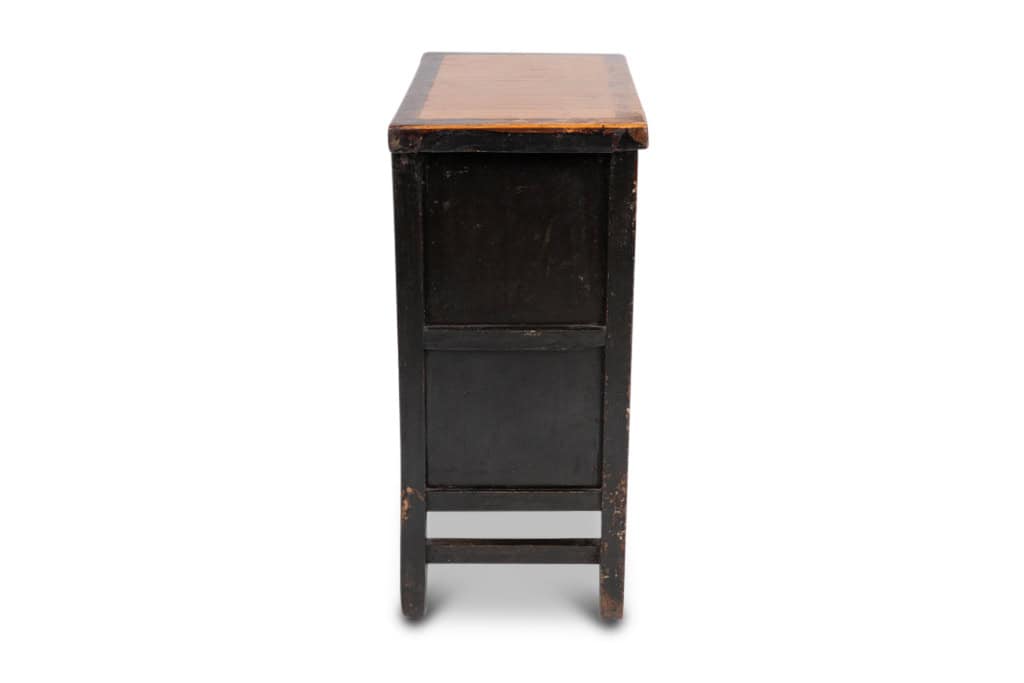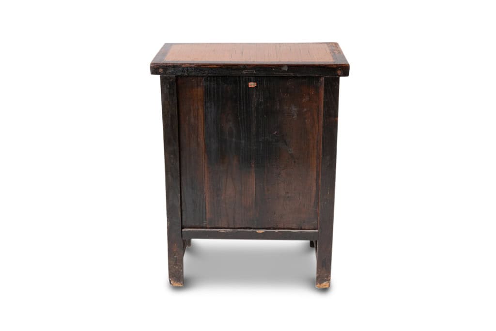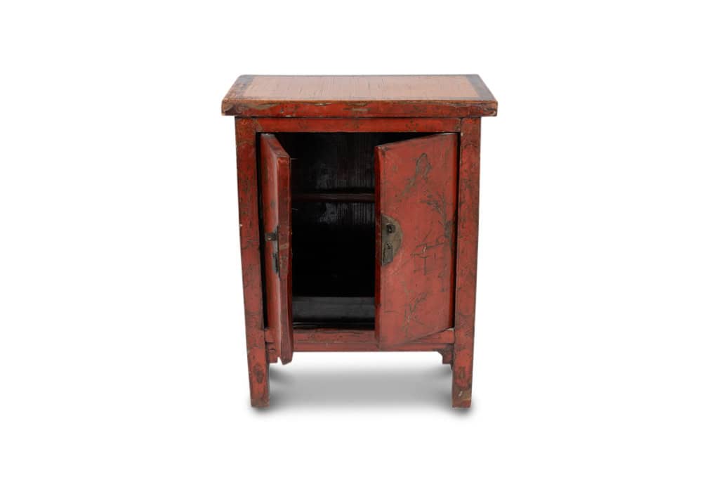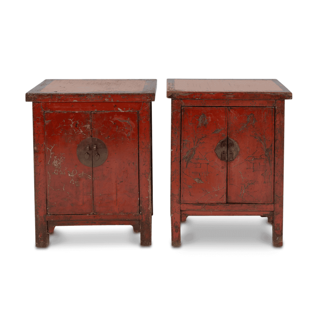 Pair of 19th-century Chinese sideboards with red lacquer, matching in design and shape. Each features a single door with circular brass handles, adorned with traditional pagoda and bird motifs. Crafted from red lacquer with gold accents, these sideboards exude timeless elegance and cultural charm. A wonderful set of antique sideboards, ready for your home today!