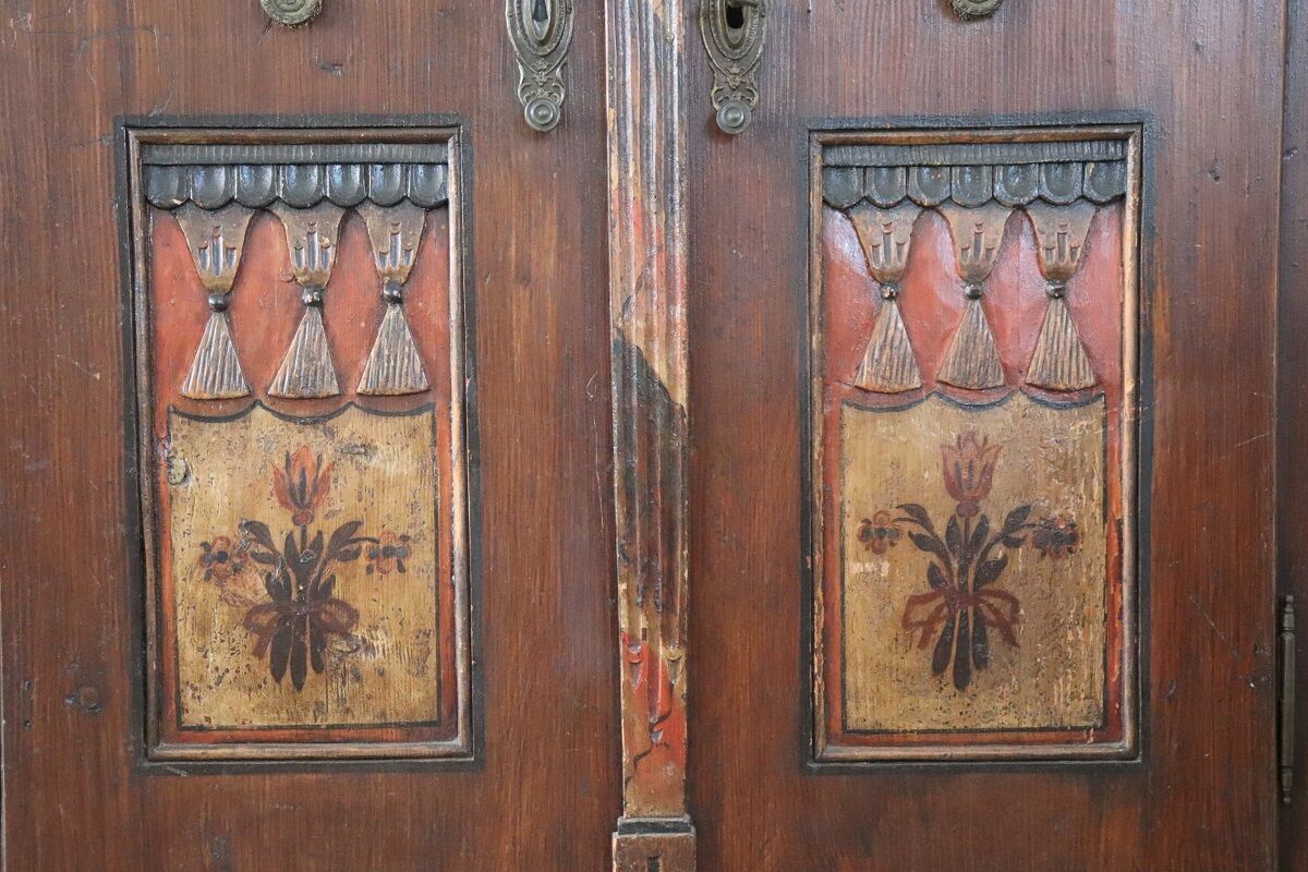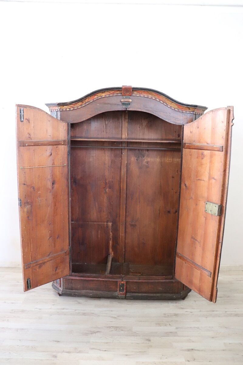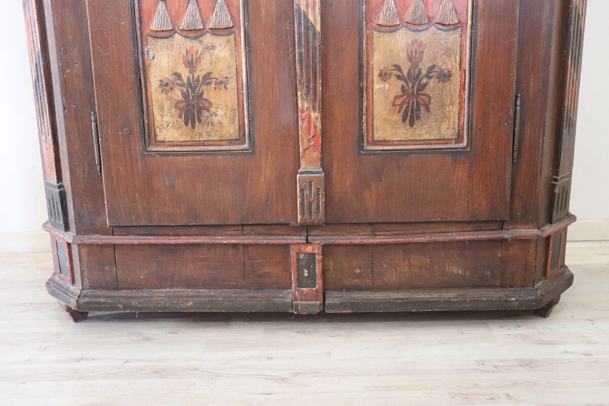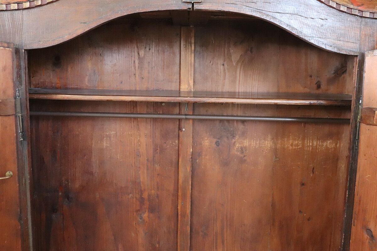 This painted wardrobe comes from the Tyrol region, a historic Alpine area between Italy and Austria known for richly decorated mountain furniture.