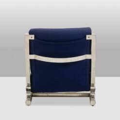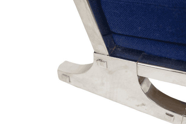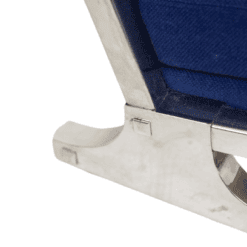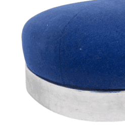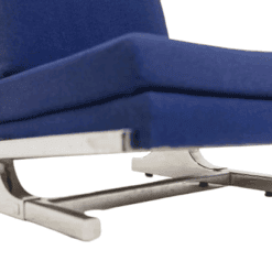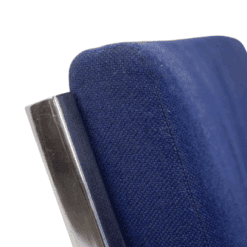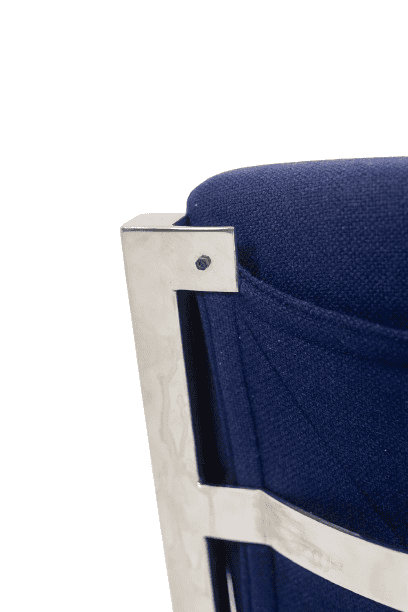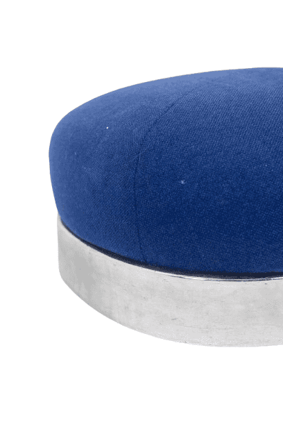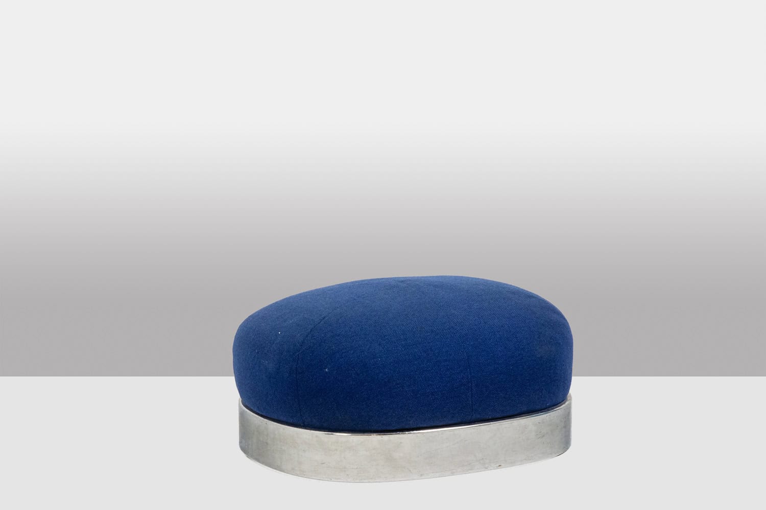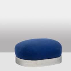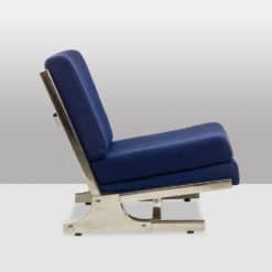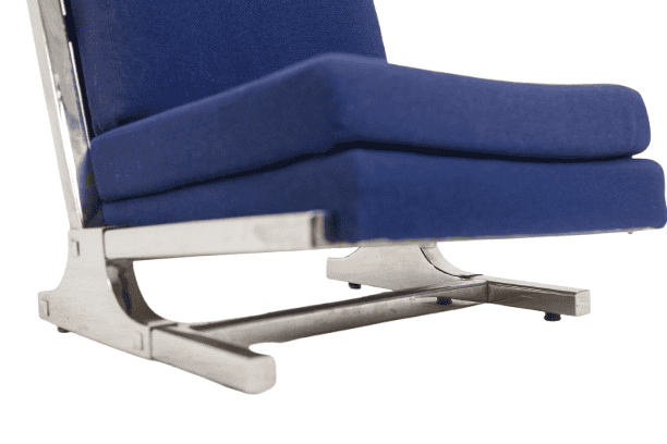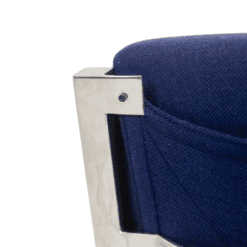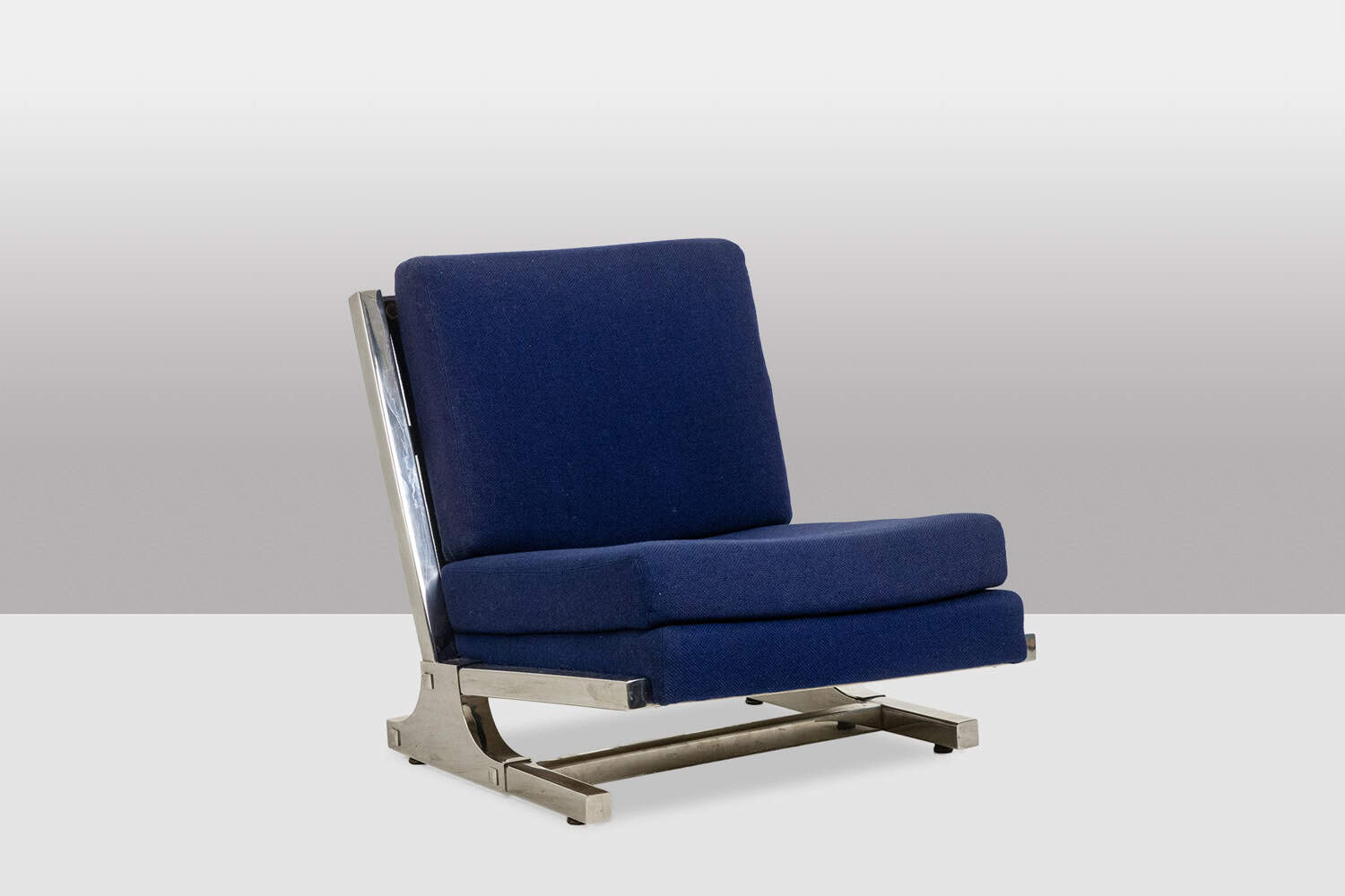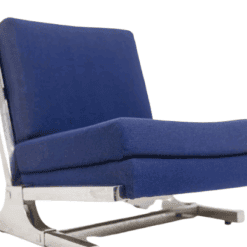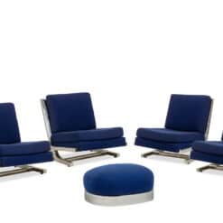 The Valérian Rybar Armchairs and Ottoman showcase bold 1970s modern design. This set includes a pair of armchairs and a matching footstool. Valérian Rybar designed the set with a chrome-plated steel structure. The reflective frame creates a strong architectural presence. Blue fabric covers the seat and backrests. The upholstery adds comfort and contrasts with the polished chrome frame.
