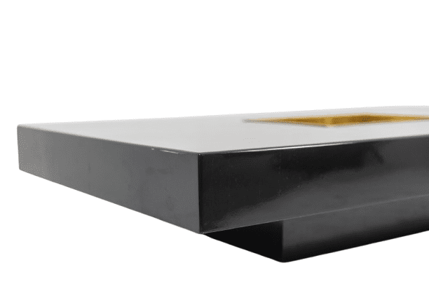 Discover this iconic coffee table, crafted in Italy during the 1970s. Willy Rizzo designed this piece with bold proportions and refined glamour. This piece features a large rectangular form in black lacquered wood. The sleek surface creates dramatic contrast and strong visual impact. A central brass compartment integrates seamlessly into the top.